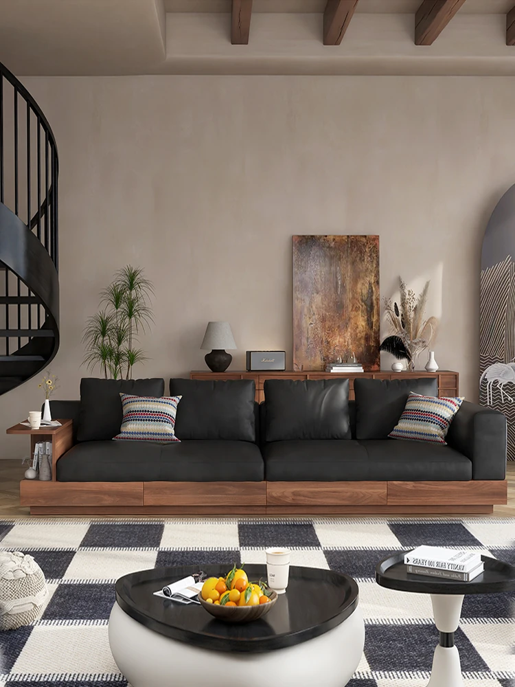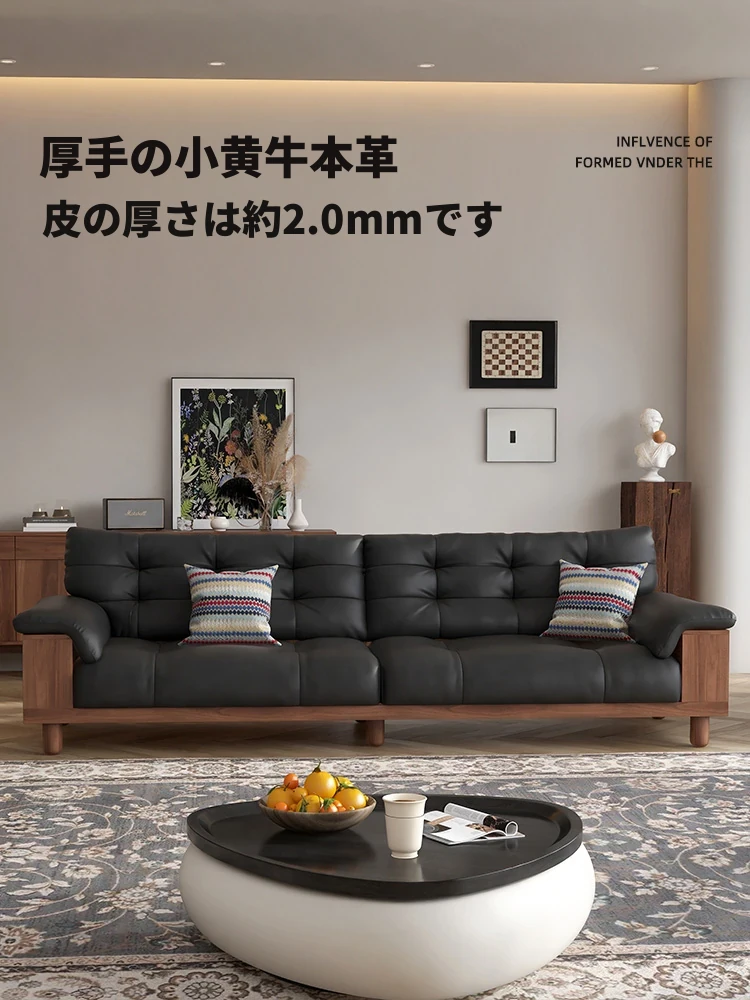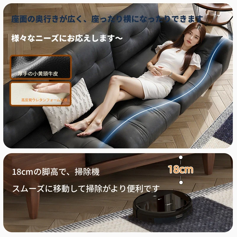 ウォルキーヴィンテージスタイル本革ソファ 北欧スタイルの小型リビングに最適!モダンな直線デザイン、ウォールナット色の無垢材製収納ソファで、スッキリとした空間を演出します。