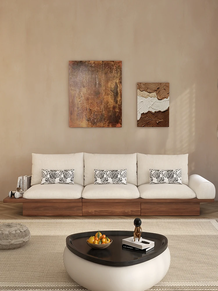 ウォルキ中古風スタイルの木製ピアノキーソファー、レトロなリビングにぴったりなクルミ色フロアソファ、機能的な収納付きでおしゃれな布製ソファ!