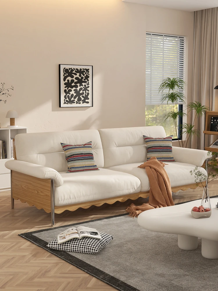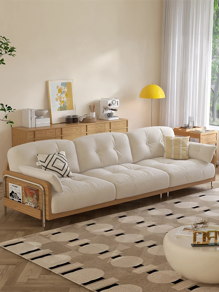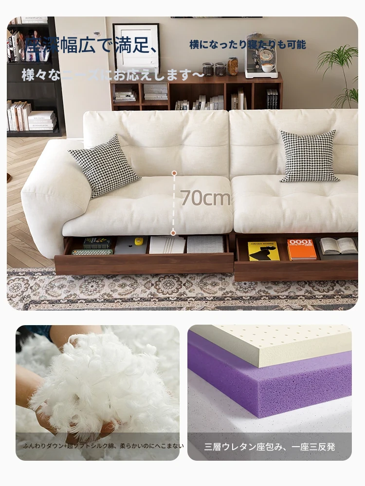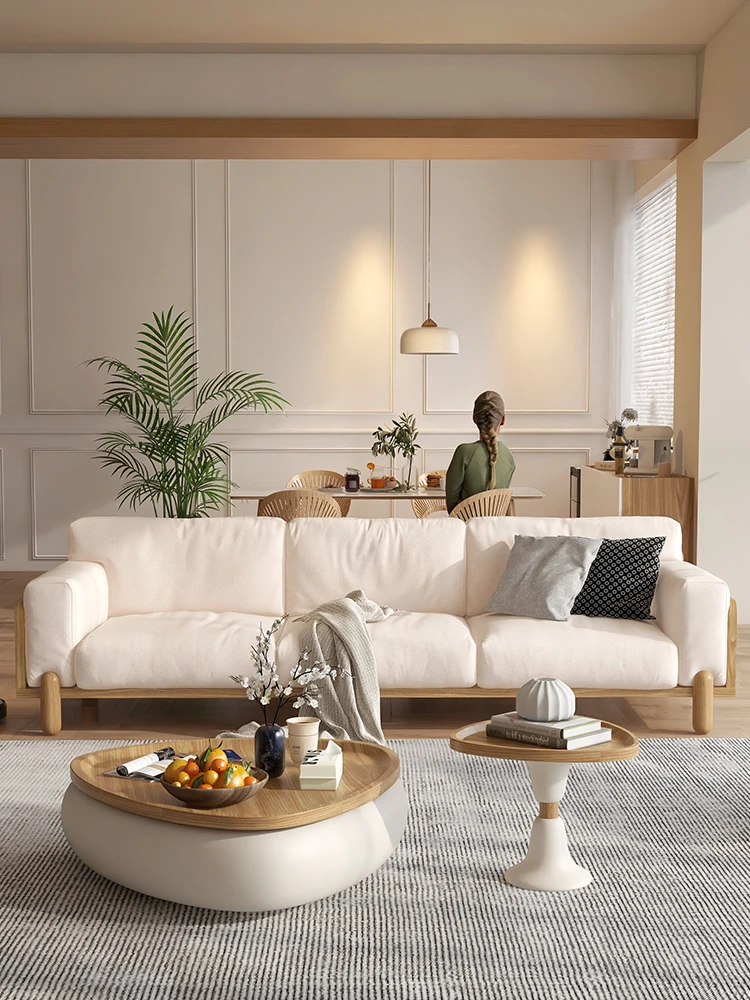 クラウド天然木製ソファー - クリームカラーのナチュラル風、和風デザインのコンパクトなリビング向け。レトロな直線デザイン、取り外し洗濯可能な生地、猫の爪にも強い!おしゃれで快適な空間を演出します。