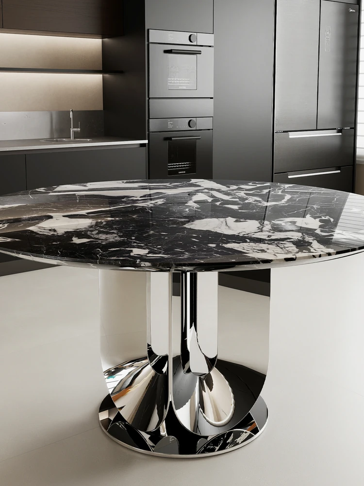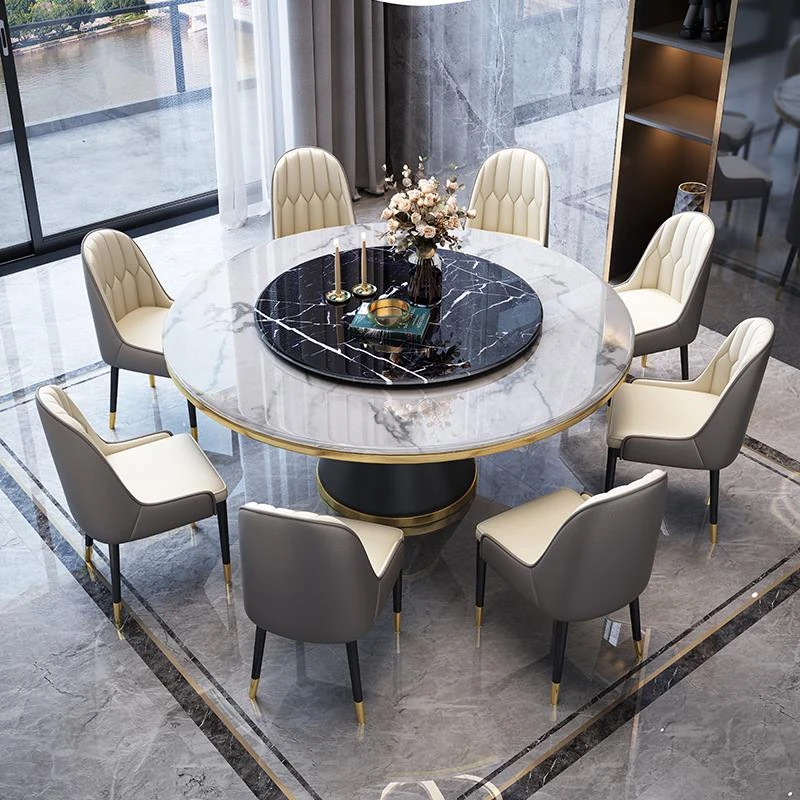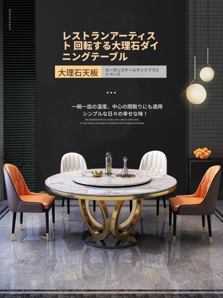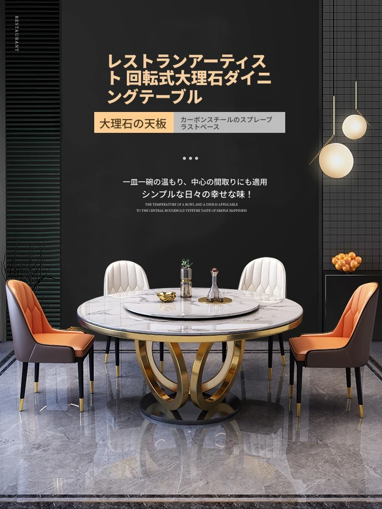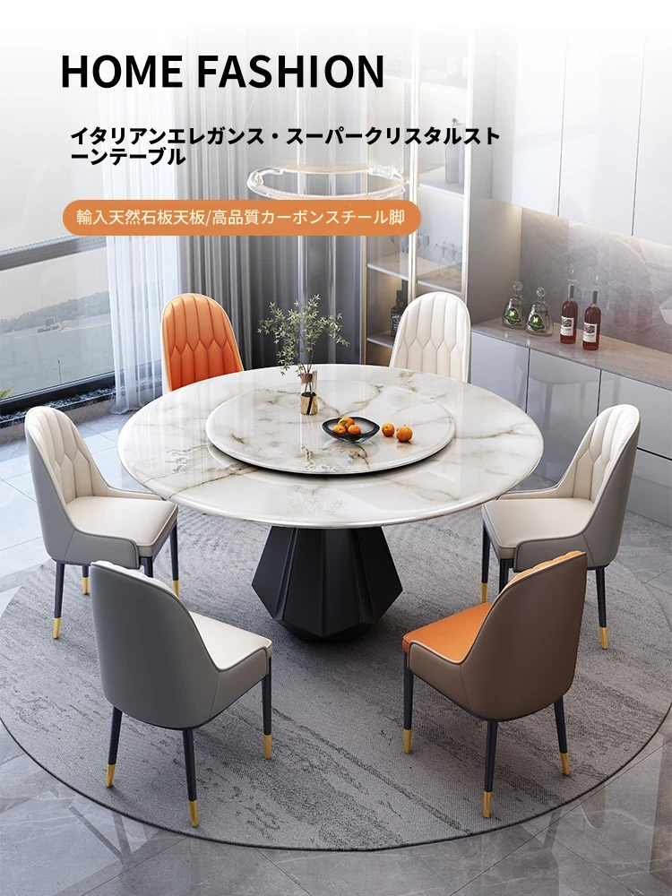 天然大理石と無垢材を使用したモダンシンプルなラウンドダイニングテーブル。回転式トレイ付き、宝格丽スタイルのラグジュアリーな超クリスタルストーン製。優雅な空間を演出する一品です!