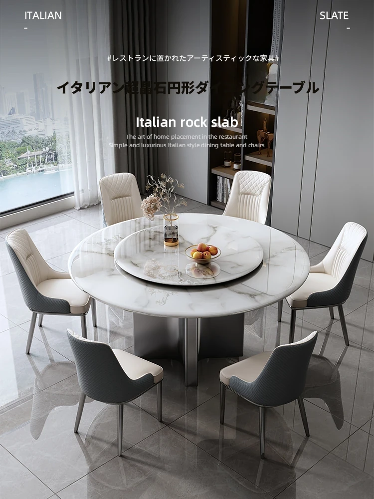 現代的でシンプルなデザインの軽奢岩板ダイニングテーブルセット、使いやすい丸型で小型住宅にも最適!大理石仕上げ、回転プレート付きで快適な食事体験を提供します。あなたの食卓に特別な魅力を!