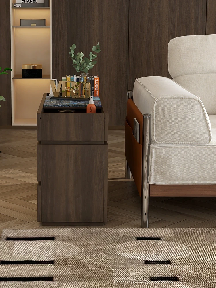 ウォルキソファサイドキャビネット - モダンでシンプル、豊富な収納力を誇る角テーブル。ラグジュアリー感あふれる高級感と天然木の温もりを兼ね備えたリビングに最適なアイテム!