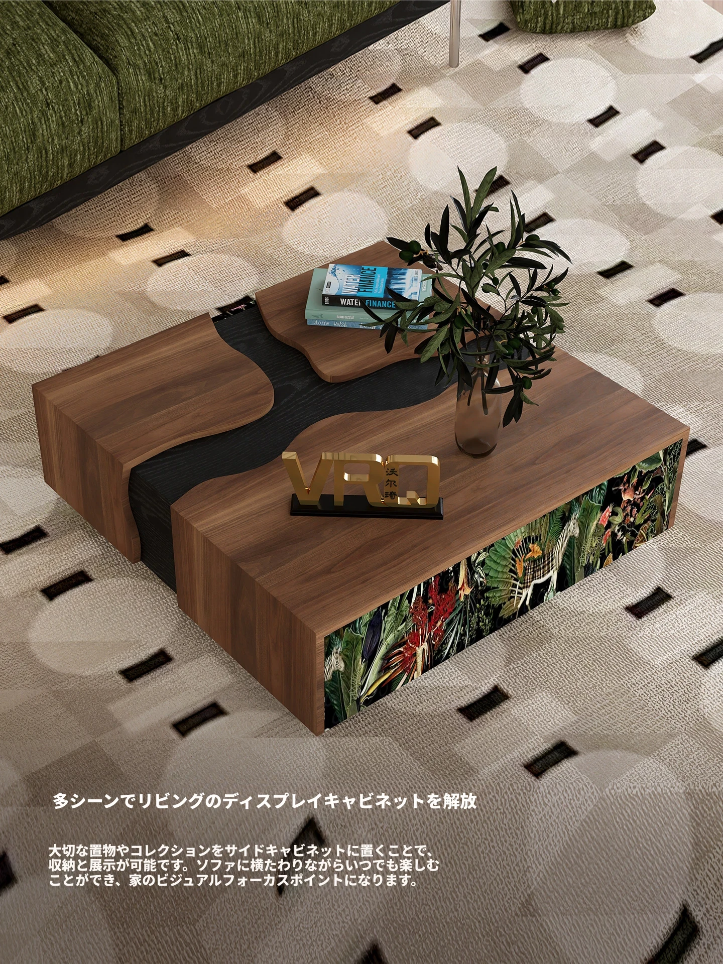 ウォルキーフレンチスタイルの森系プリント無垢材コーヒーテーブル - 高級デザイナーによるシンプルでクリエイティブなレトロデザイン、リビングルームの収納に最適なスクエアテーブル!