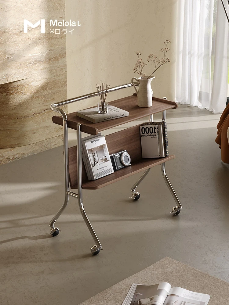 Melolat イタリアンウォールナット 移動式サイドテーブル リビングソファ用収納ラック モダンでシンプルなステンレス製小型カート 使い勝手抜群でおしゃれなインテリアを演出!