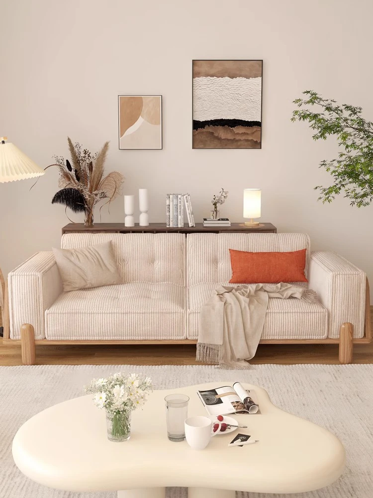 Japanese Solid Wood Fabric Sofa - Modern Minimalist Design for Small Living Rooms, Cream-Colored Corduroy Three-Seater with Natural Wood Finish. Perfect for Cozy Spaces!