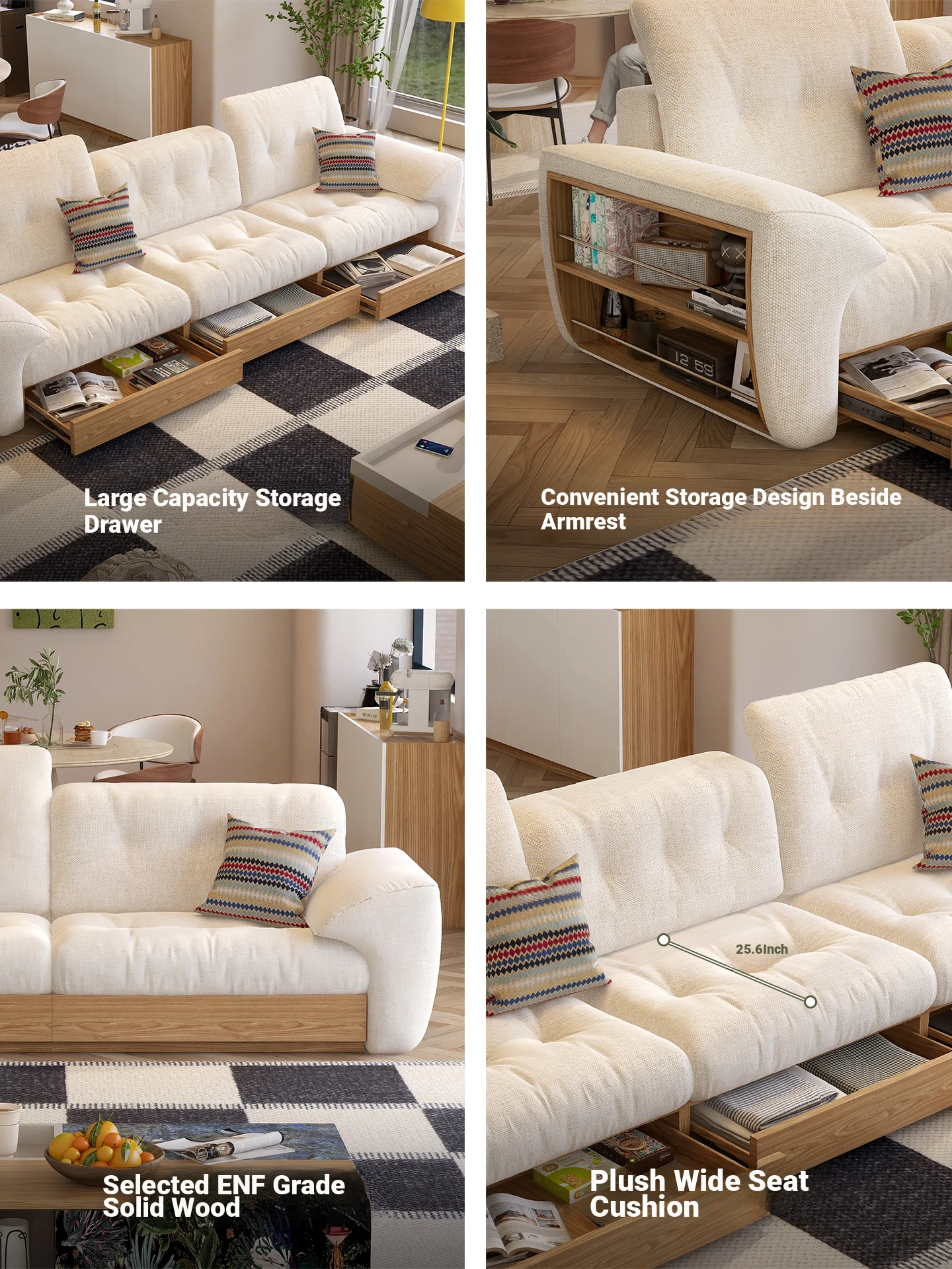 Modern Minimalist Solid Wood Sofa with Cloud Fabric - Multi-functional Storage for All Room Sizes, Japanese Style, Creamy Aesthetic for Your Living Room.