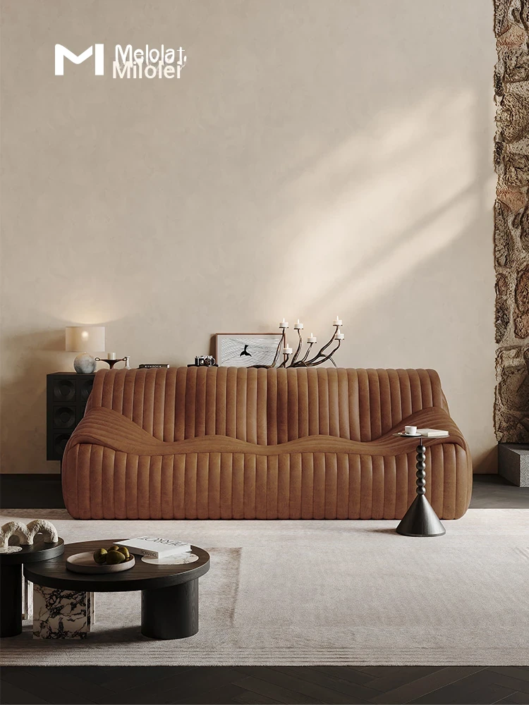 Melolat American Vintage Leather Waxed Wave Sofa - Designer Straight Three-Seater French Genuine Leather Couch for Stylish Living Spaces