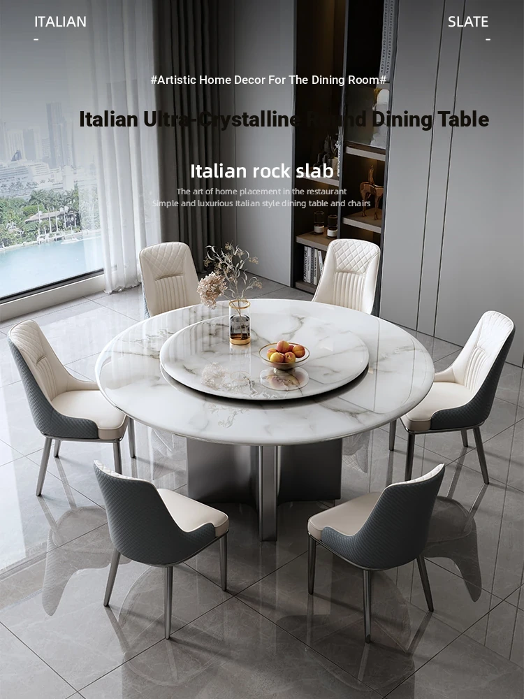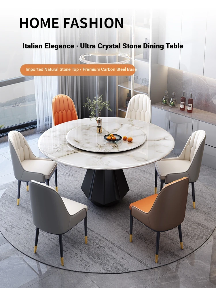High-End Italian Ultra-Crystal Stone Dining Table Set - Luxury Round Table with Rotating Tray for Small Spaces, Featuring Elegant Micro-Crystal Surface Ideal for Home Use