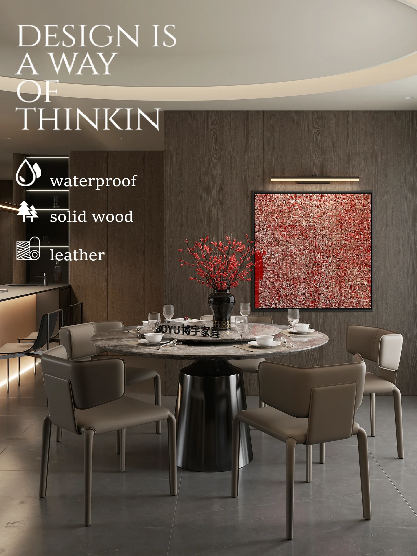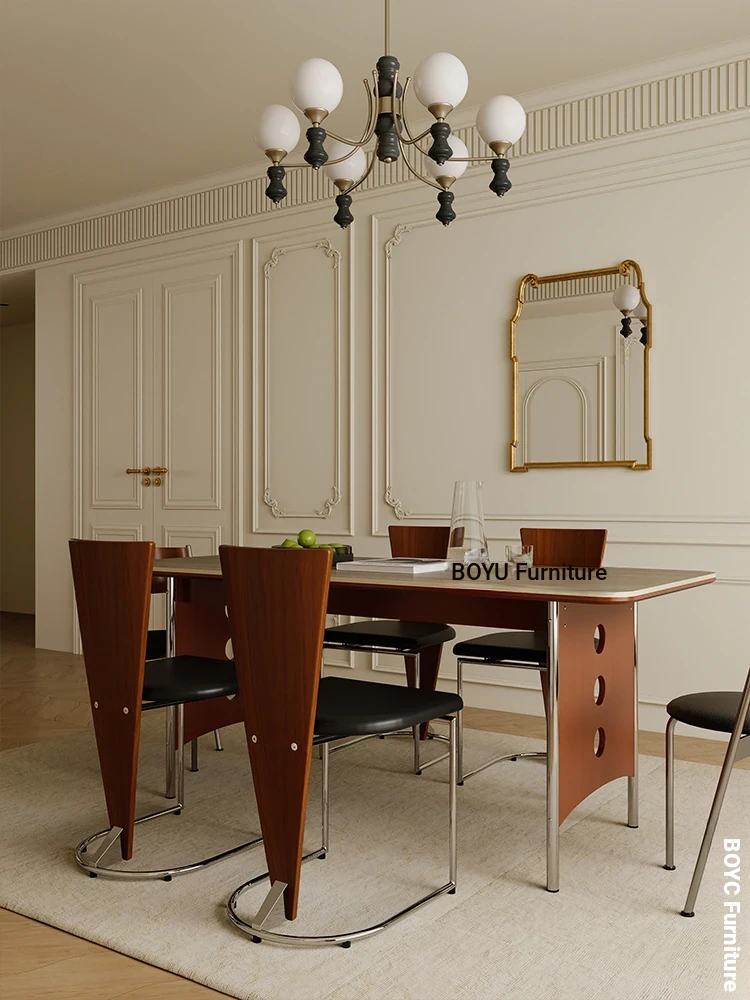 Boyu Furniture Solid Wood Dining Table and Chair Set with洞石岩板 - Modern Vintage Walnut Design for Home Use, Stylish and Durable Dining Solution