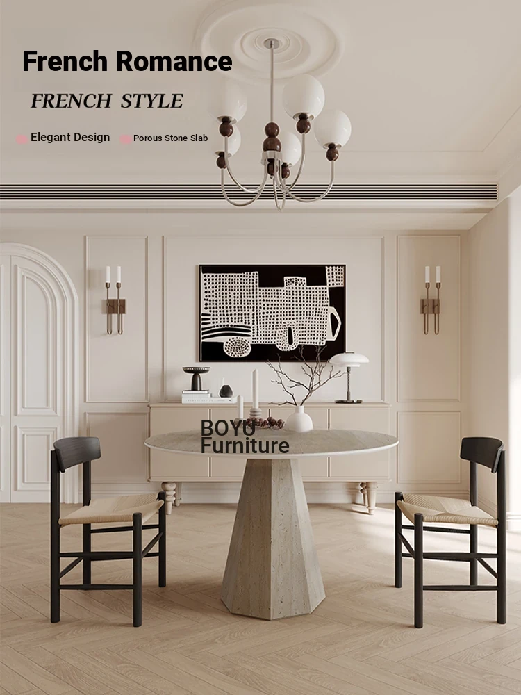 Boyu Solid Wood Dining Table Set with Stone-Look Resin - French Vintage Style for Small Spaces, Wabi-Sabi Aesthetic, Creamy Design by Designer