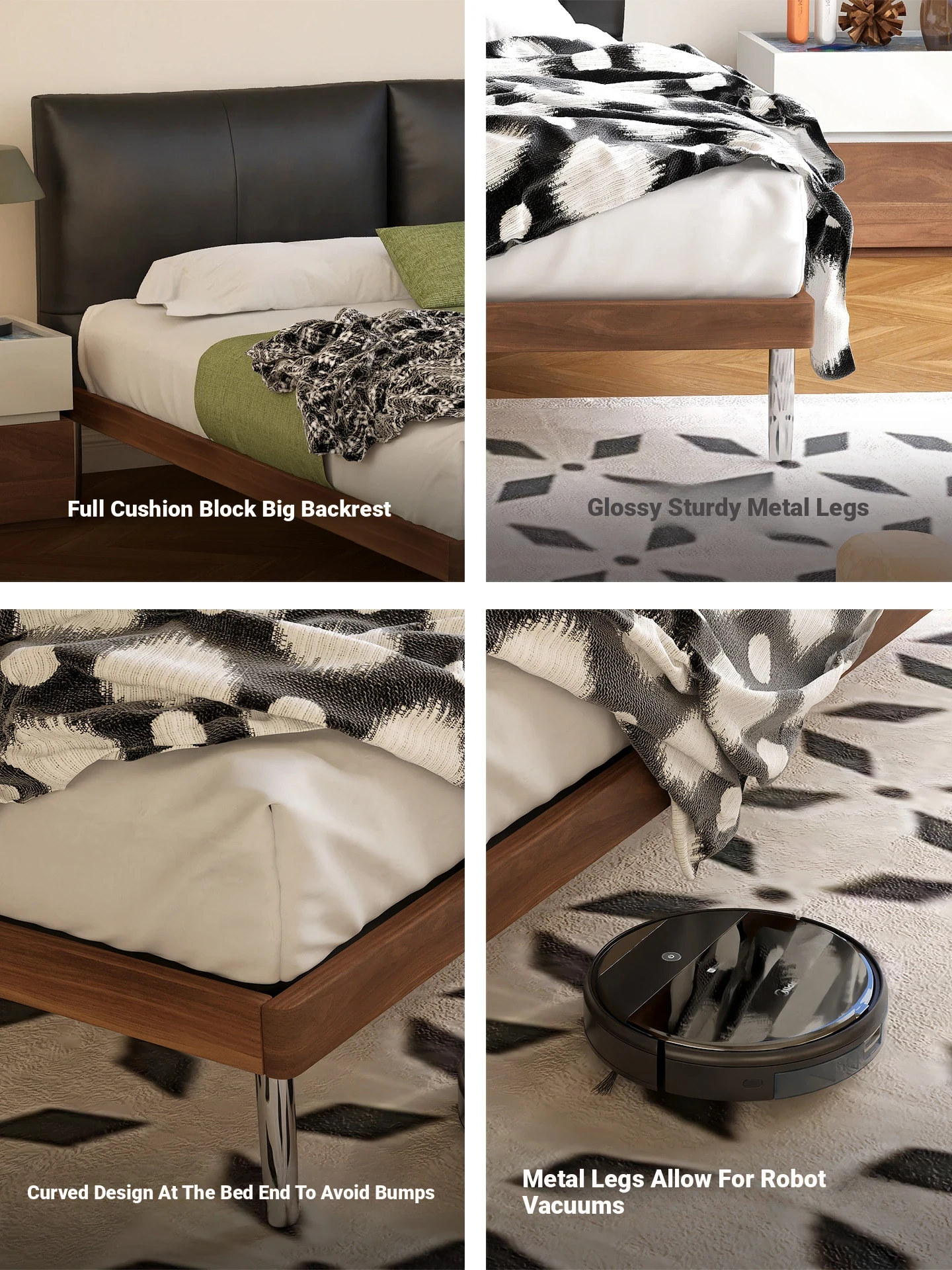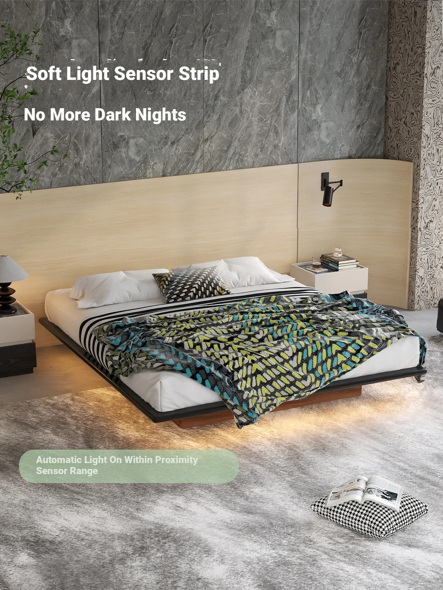 Walqi Modern Floating Bed with Storage - Minimalist Solid Wood Design for Small Bedrooms, Upholstered with Genuine Leather and Stainless Steel Accents. Perfect for Contemporary Living Spaces!