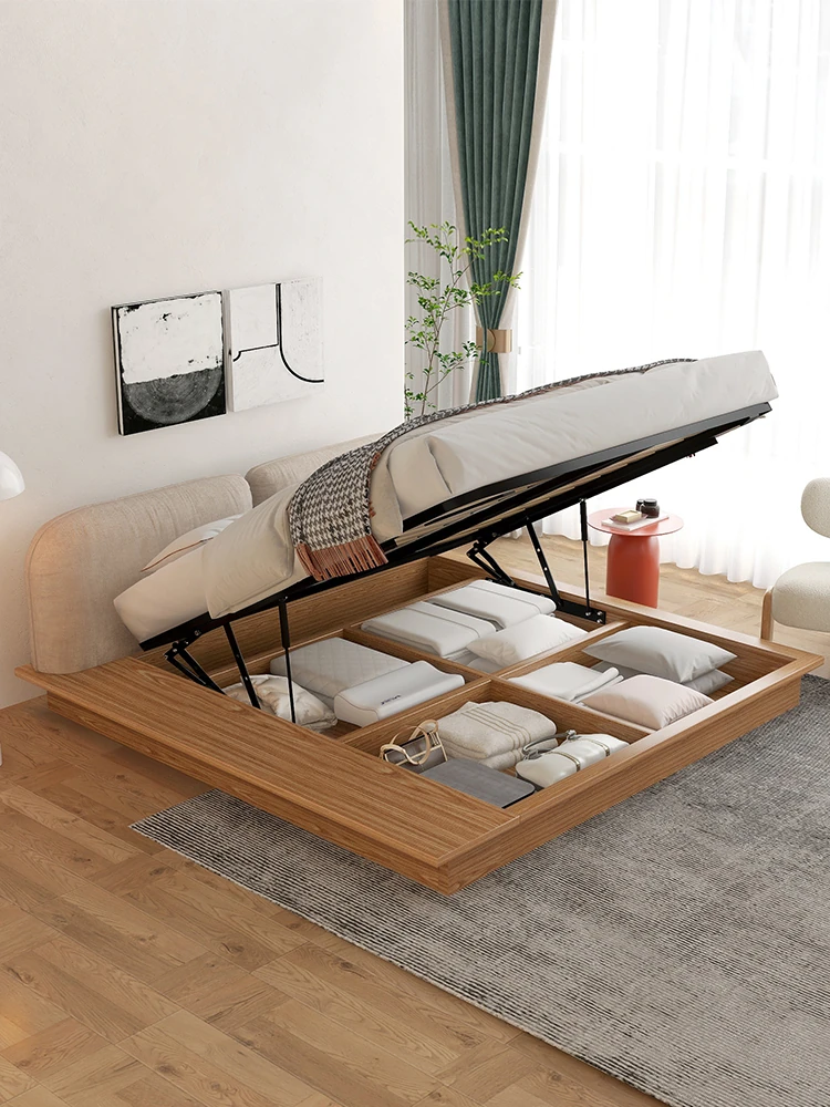 Modern Japanese Solid Wood High-Storage Bed with Wave Soft Headboard - Ideal for Small Spaces, 1.8m Double Bed for Master Bedroom, Perfect for Couples