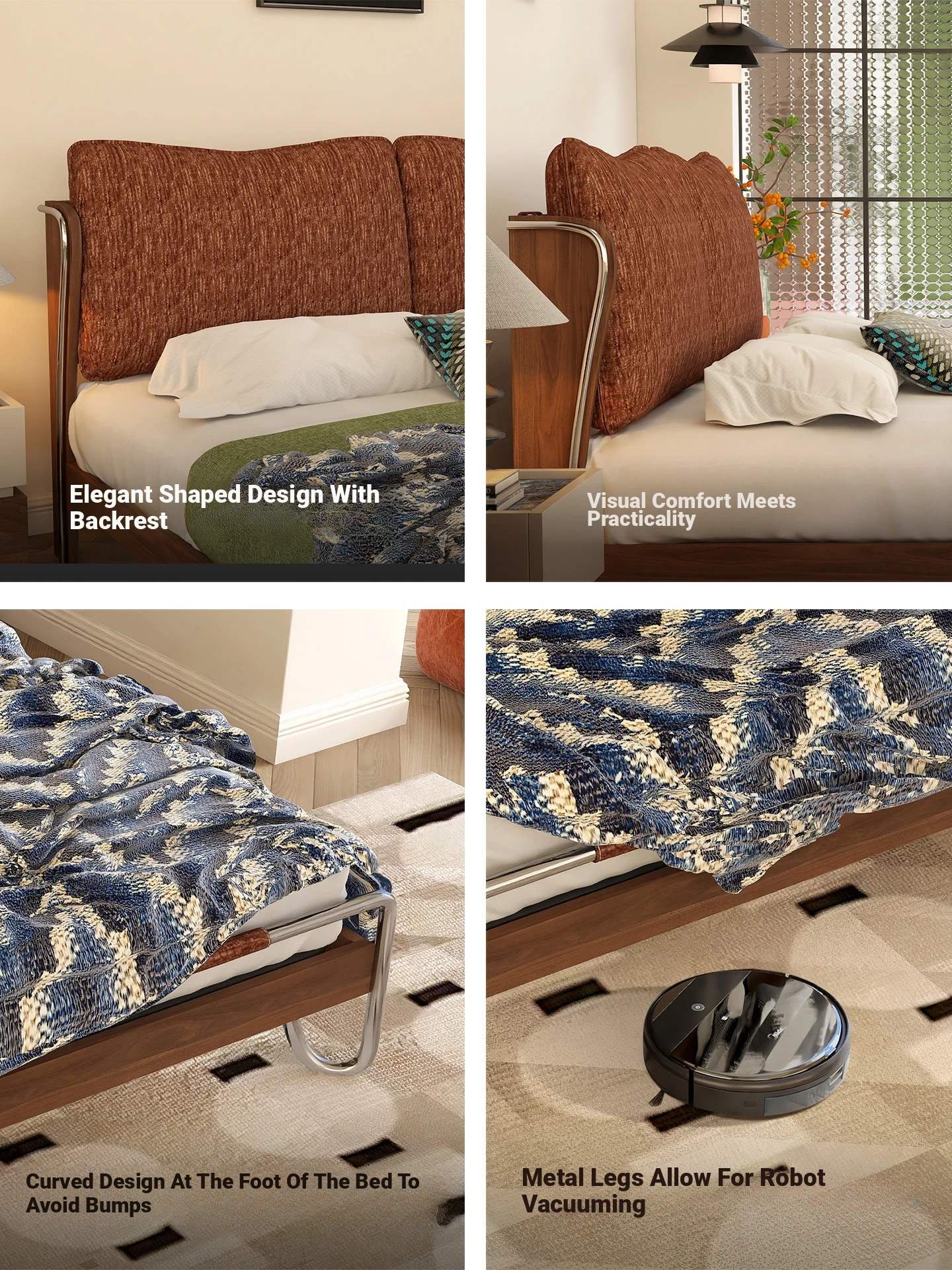 Woqi French Luxe Chenille Petal Bed Upholstery - Minimalist Double Bed with Stainless Steel Floating Headboard for a Stylish Bedroom Retreat