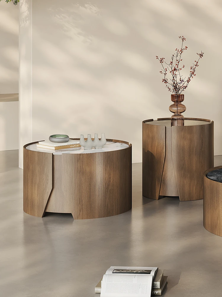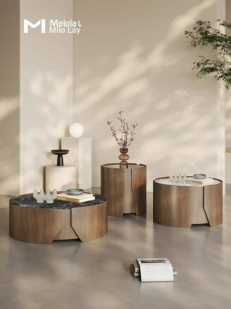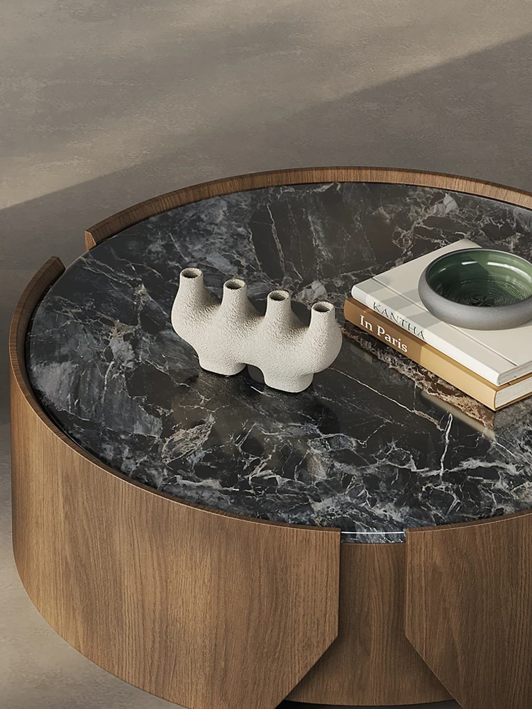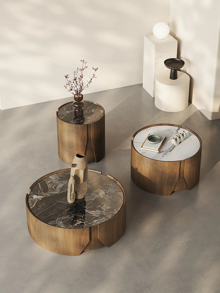 Italian Minimalist Luxury Round Microcrystal Coffee Table - Simple Modern Living Room Set with Solid Wood Side Table - Designer's Chic and Elegant Addition to Your Home