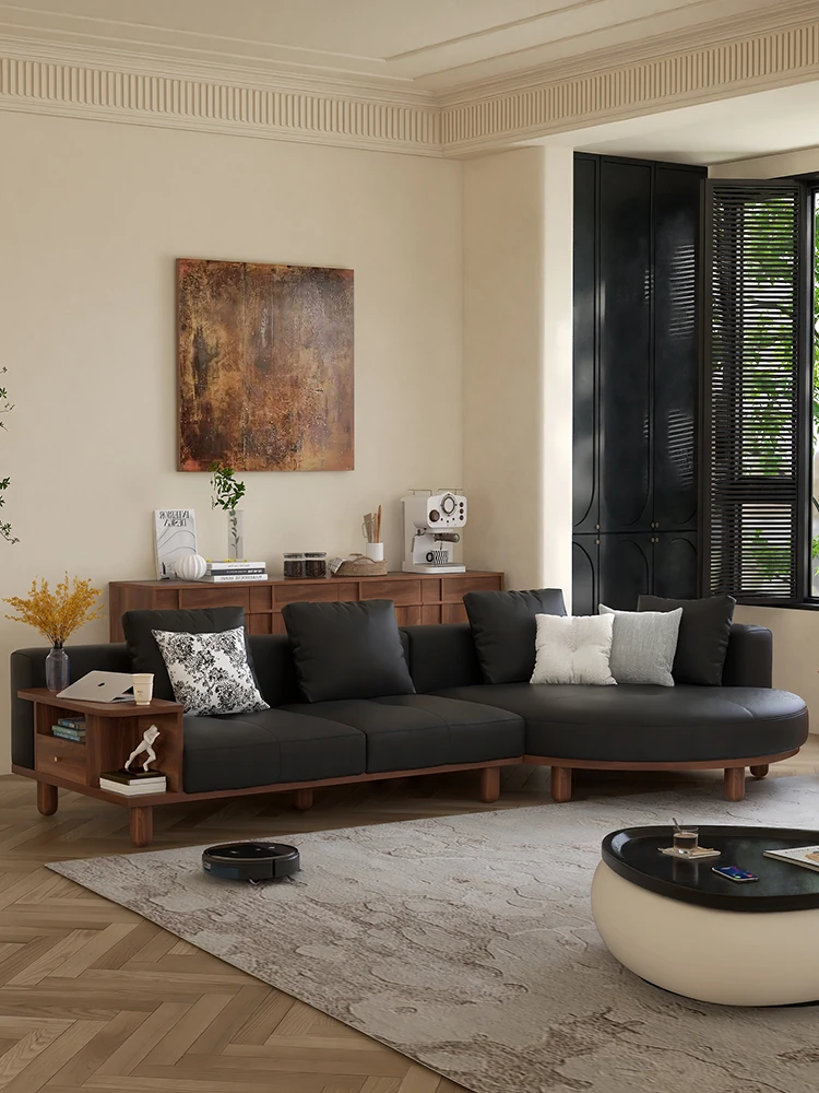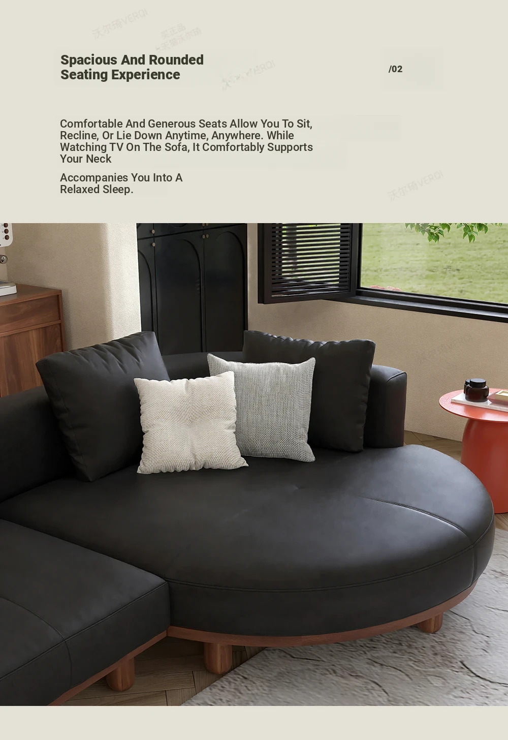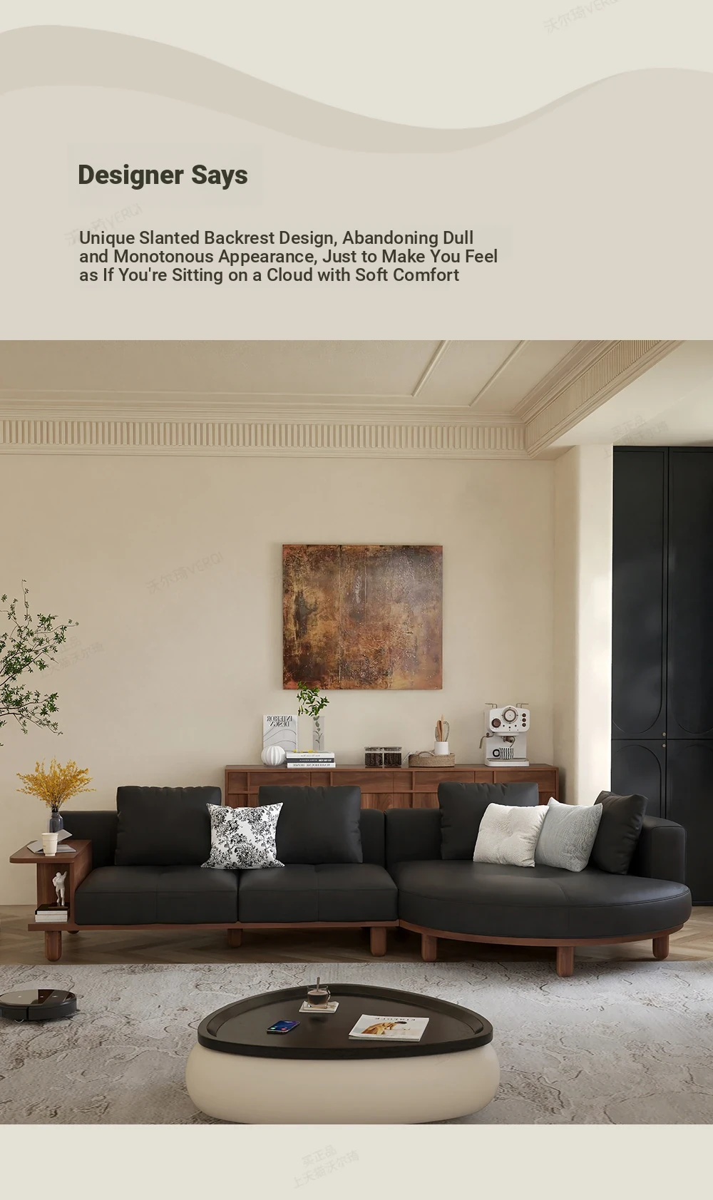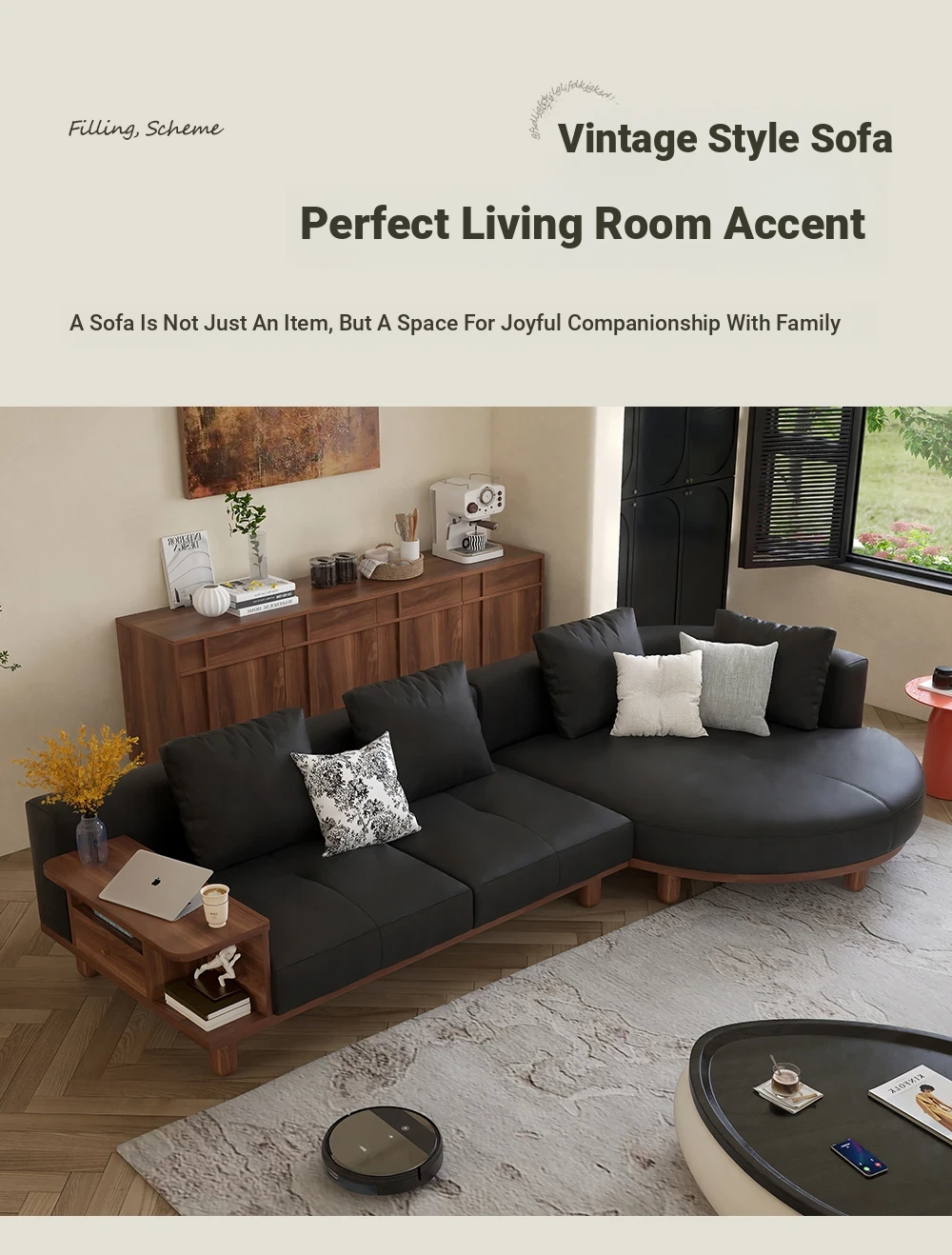 Walqi Connolly Vintage Solid Wood Sofa – Elegant Curved Sectional Chaise Lounge for Villa Living Room, Authentic Leather Retro Style Mid-Century Design