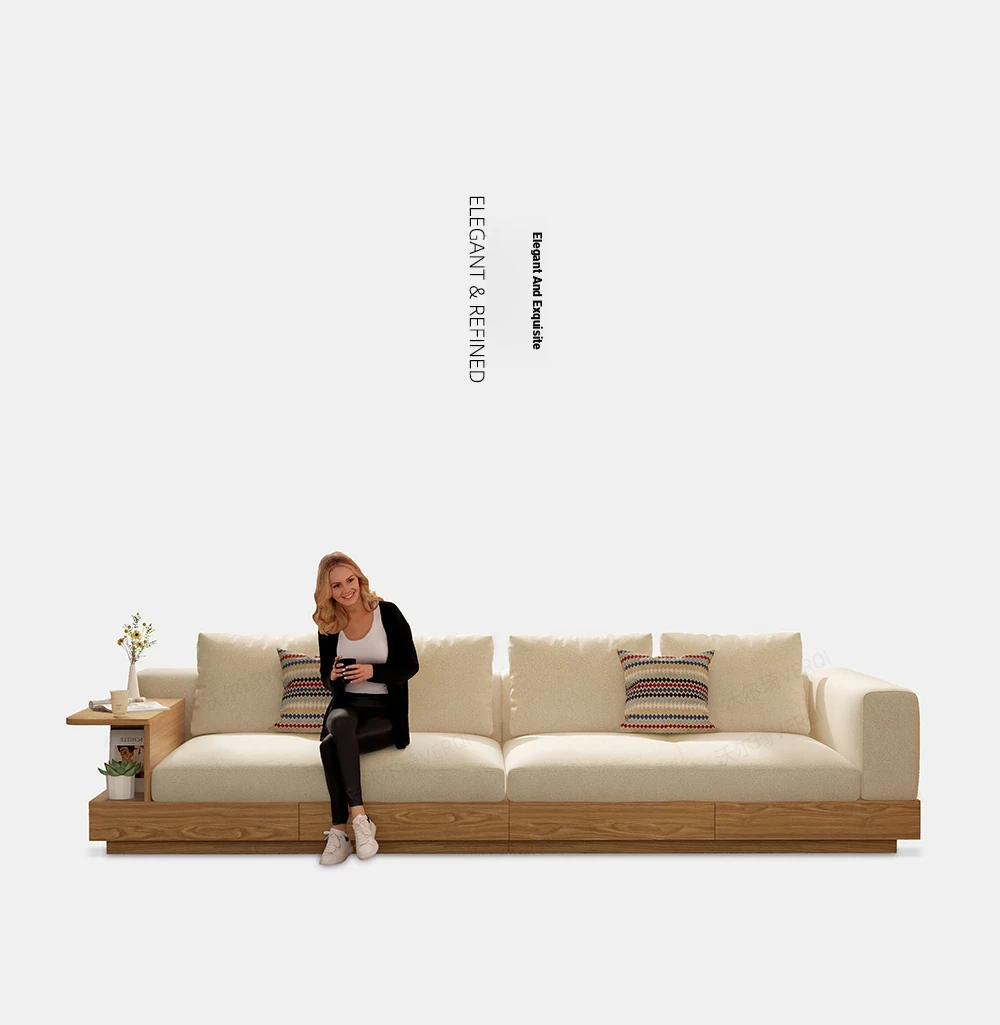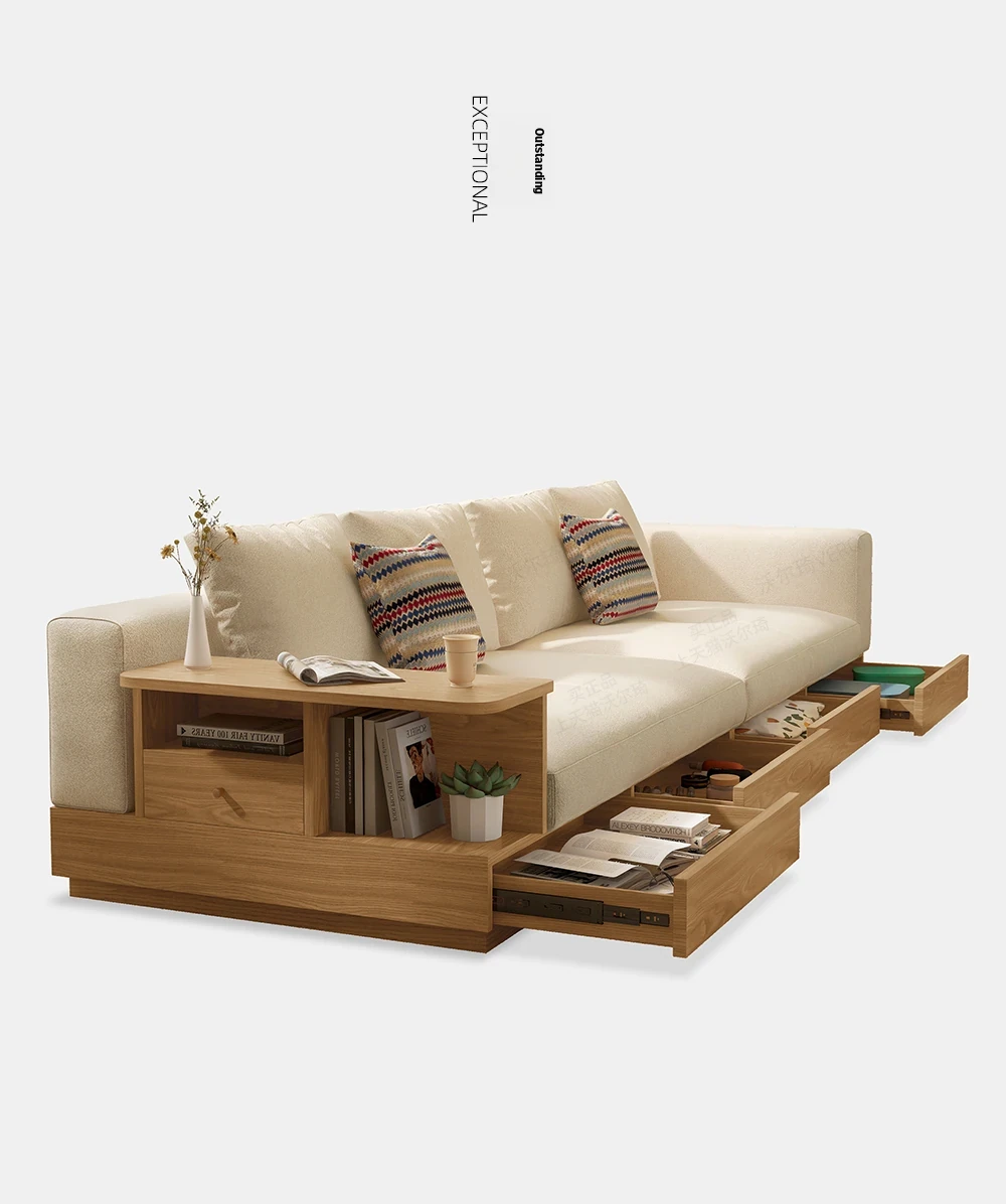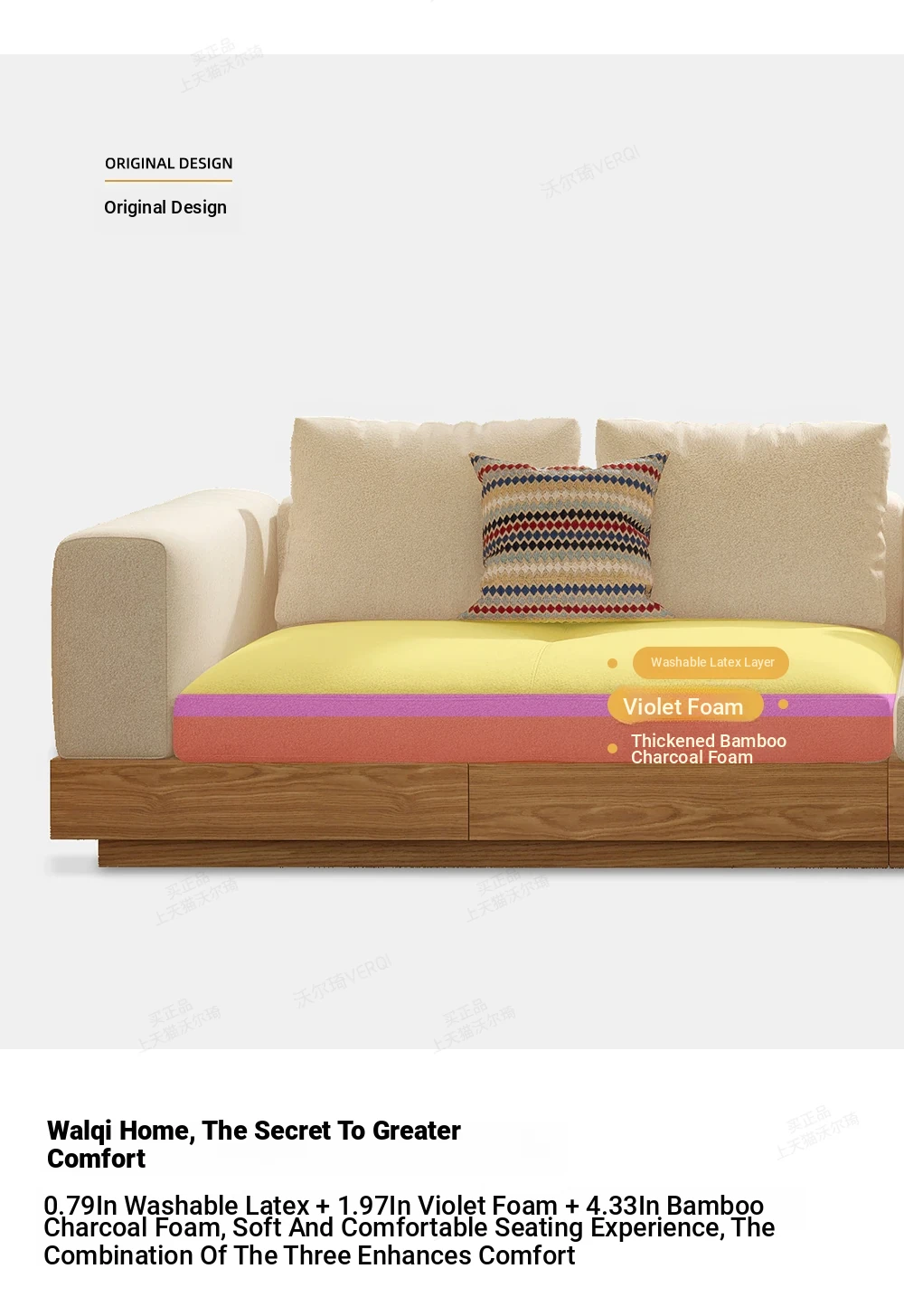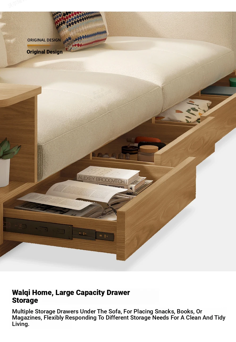 Walqi Solid Wood Konali Fabric Sofa with Drawer Storage - Japanese Style, Perfect for Small Living Rooms, Removable and Washable, Elegant and Functional Design.