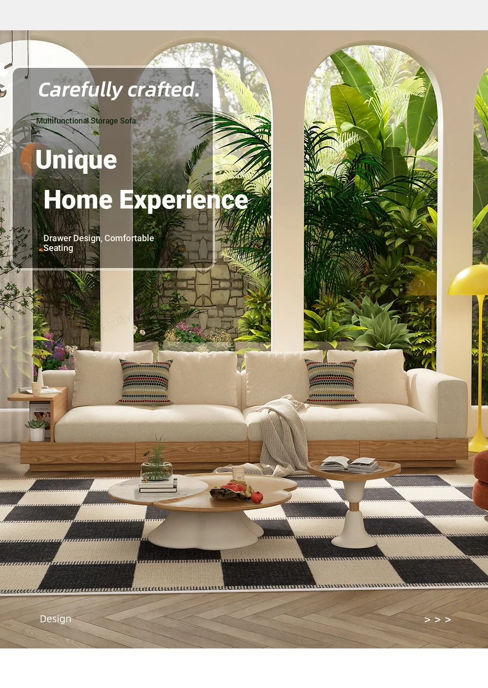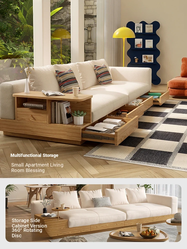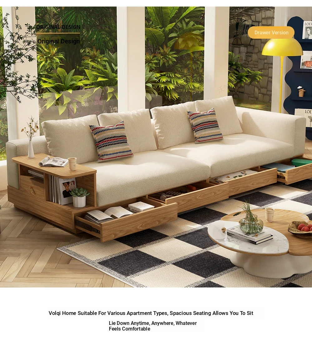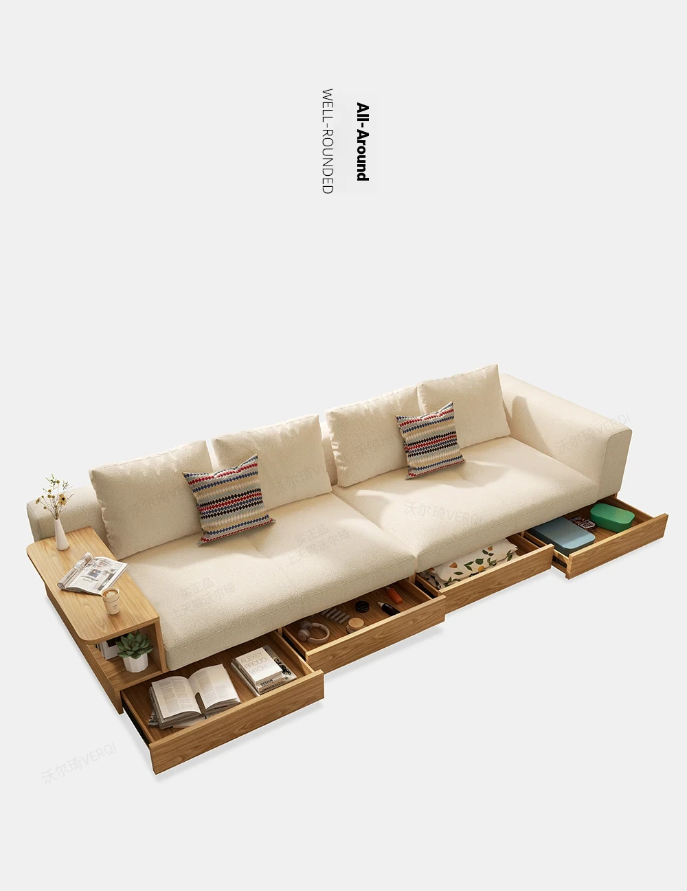 Walqi Solid Wood Konali Fabric Sofa with Drawer Storage - Japanese Style, Perfect for Small Living Rooms, Removable and Washable, Elegant and Functional Design.