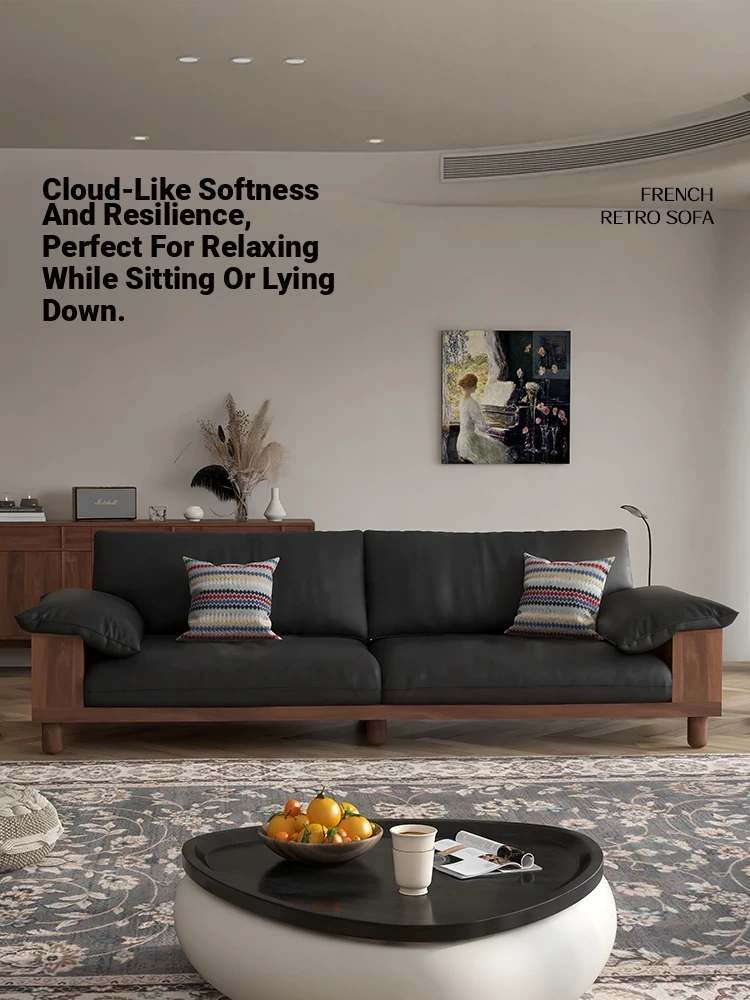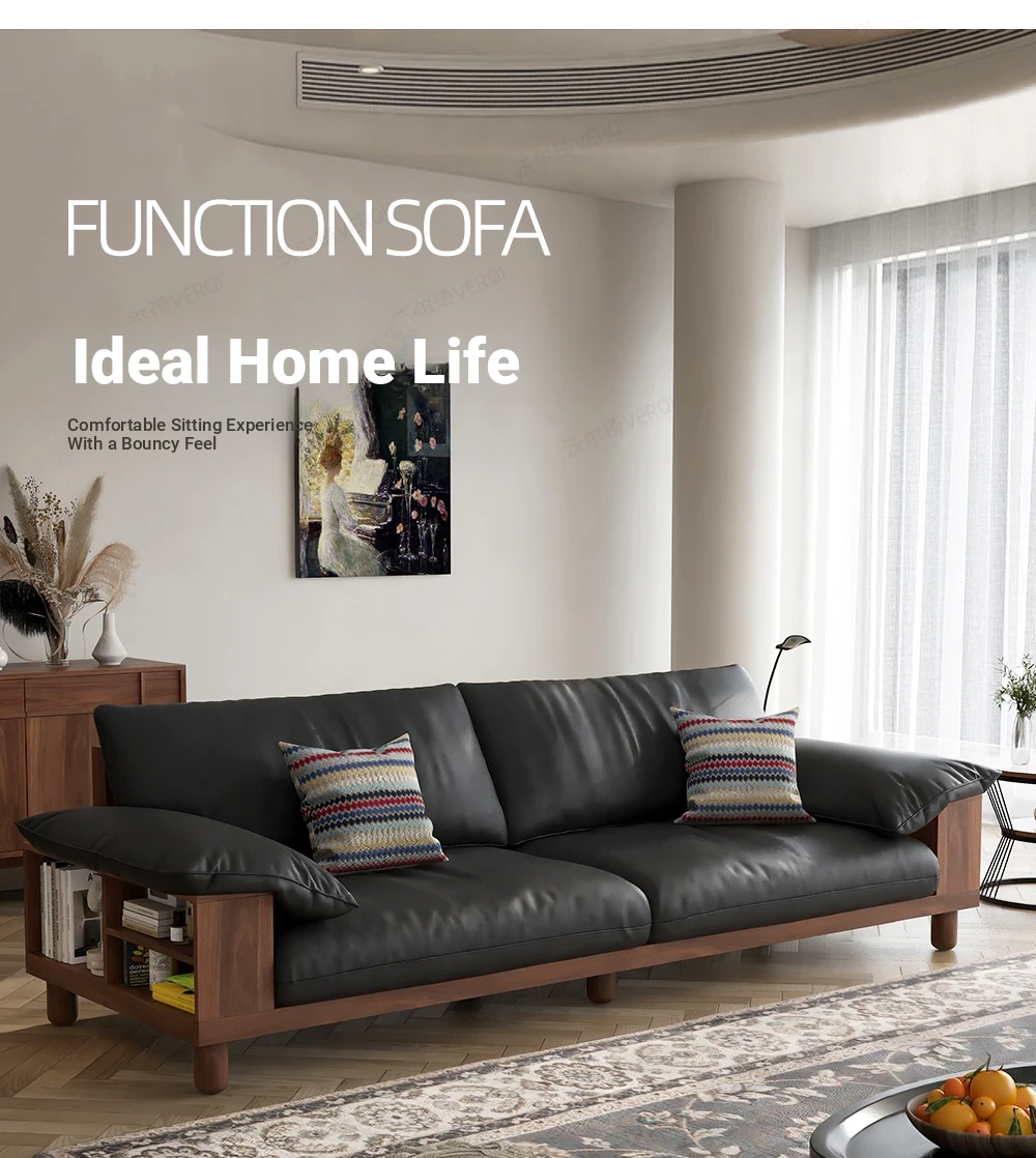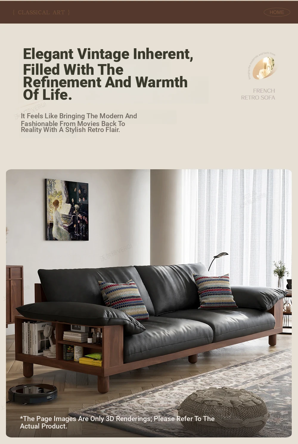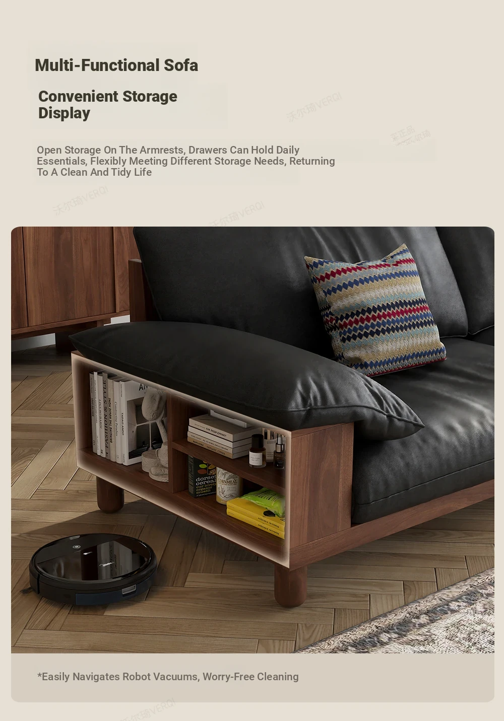 Walqi Solid Wood Sofa for Small Living Rooms - Retro Style Three-Seater in Walnut Color with Storage and Genuine Leather Upholstery