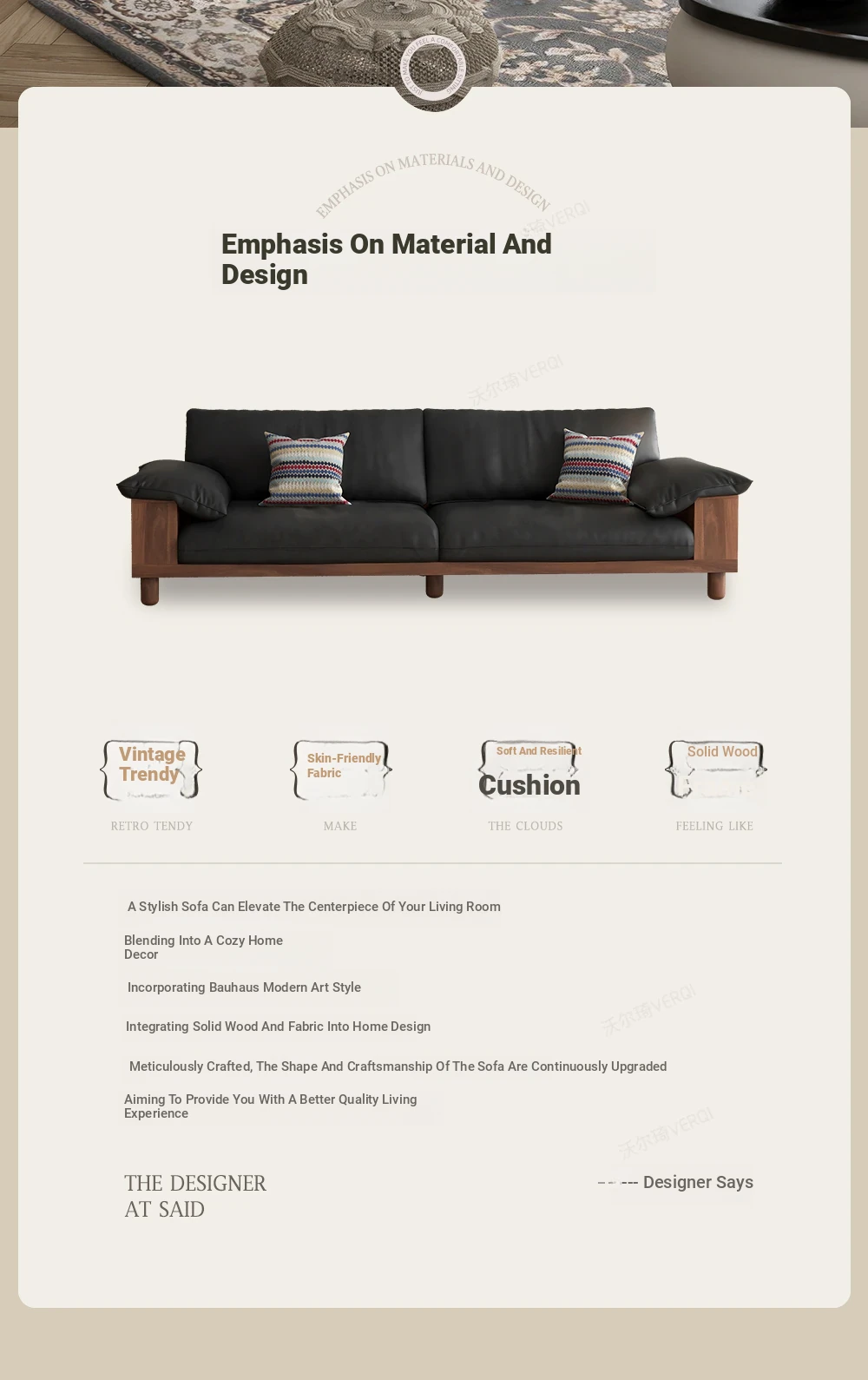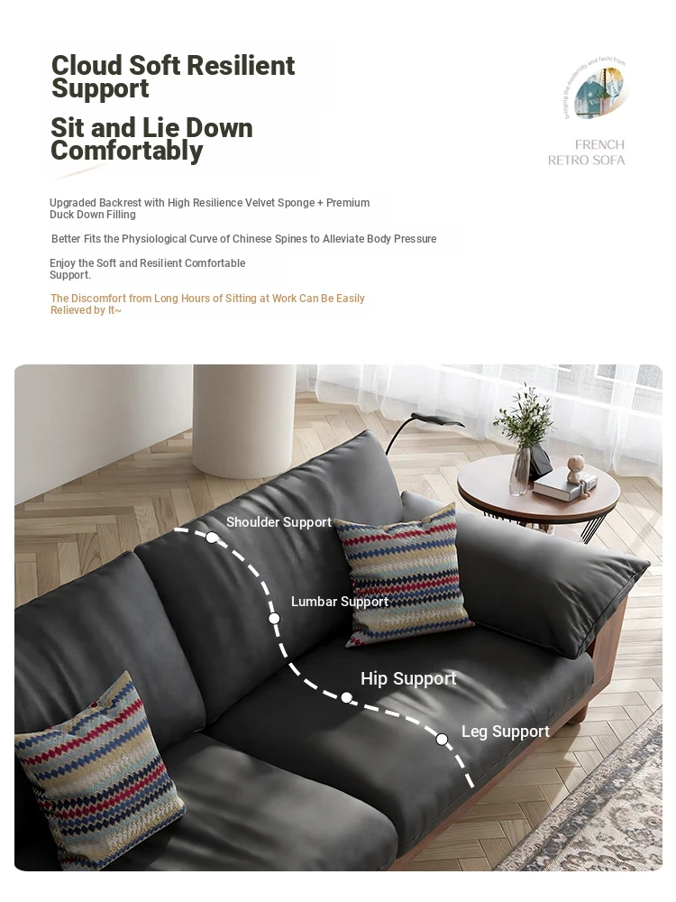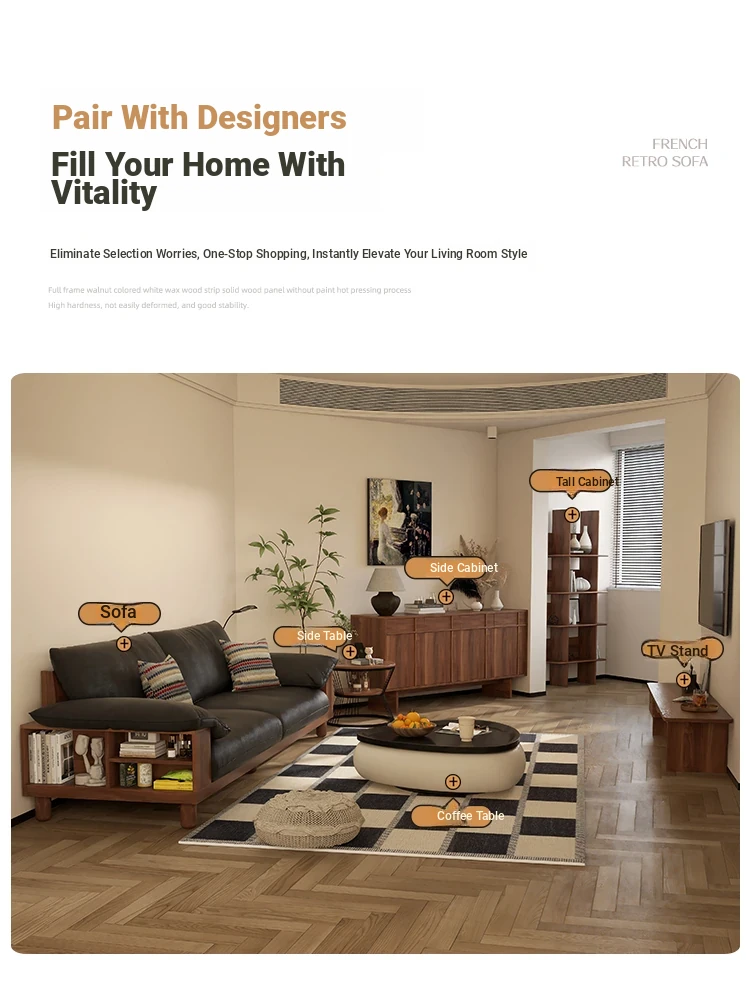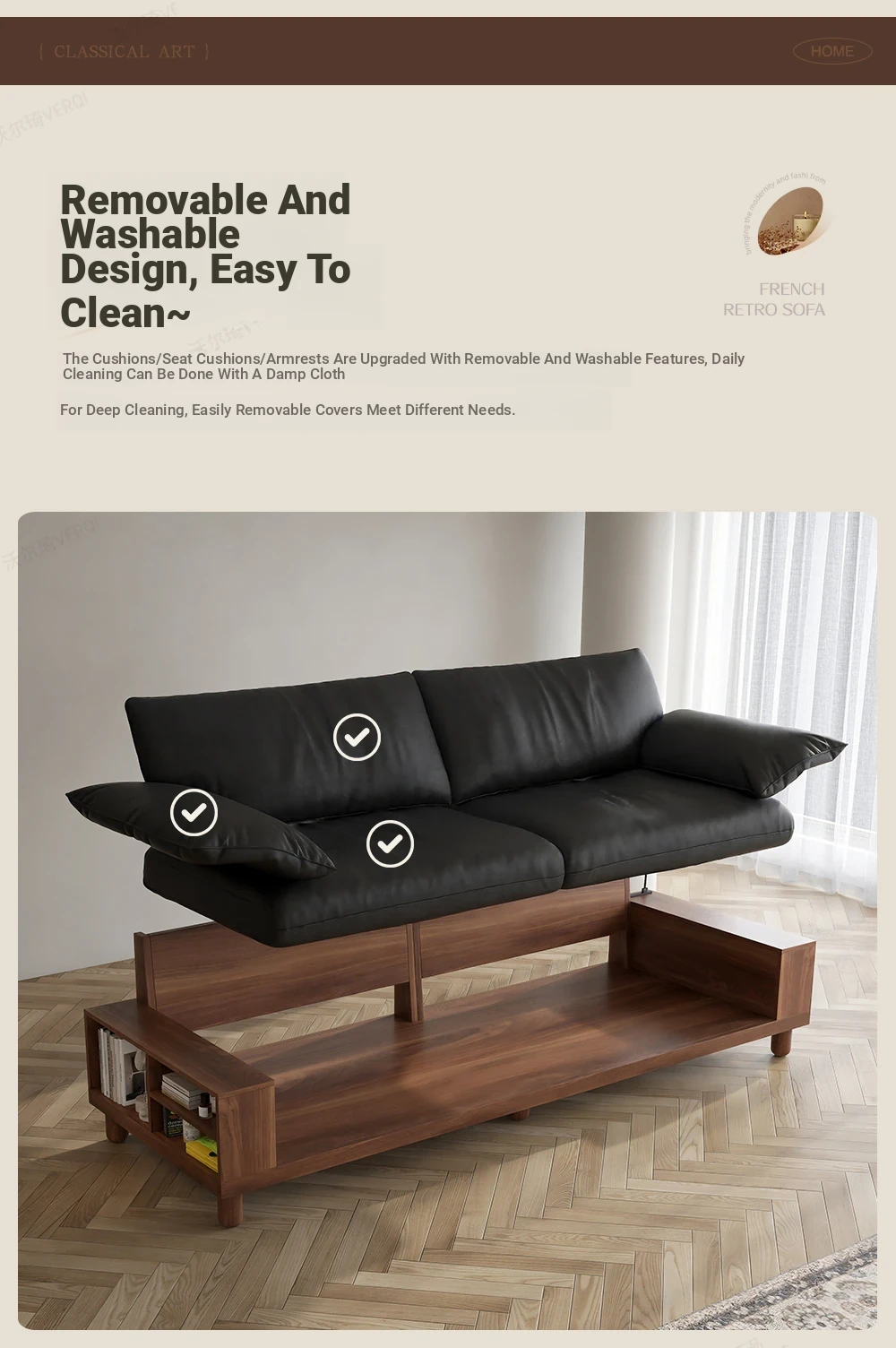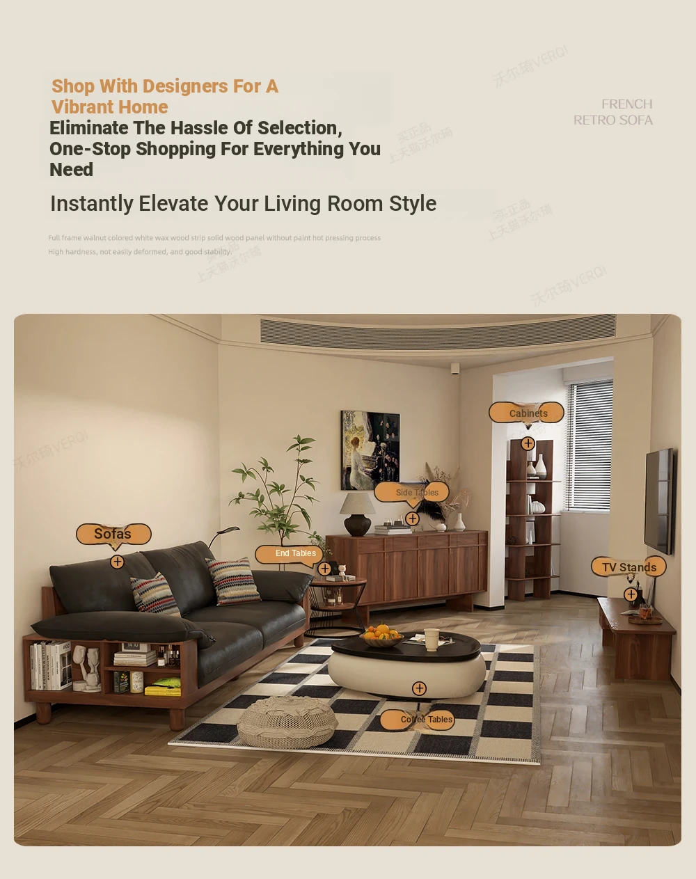 Walqi Solid Wood Sofa for Small Living Rooms - Retro Style Three-Seater in Walnut Color with Storage and Genuine Leather Upholstery