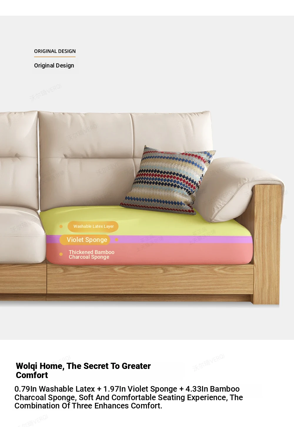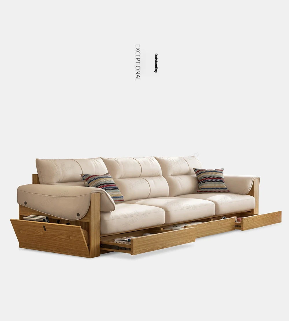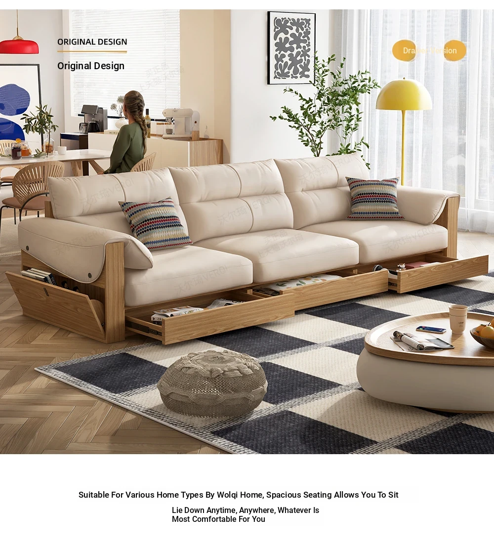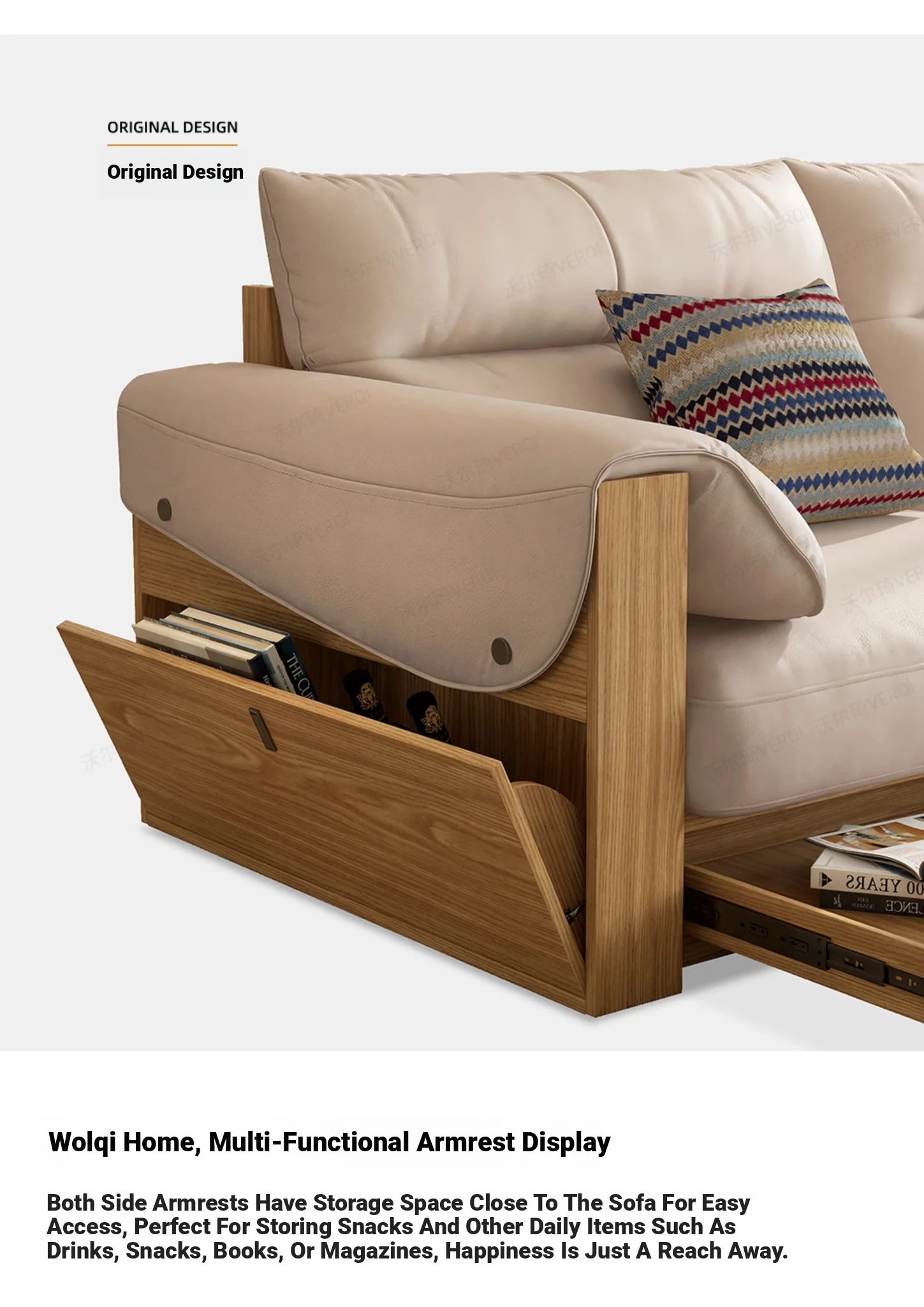 Woqi Japanese Style Solid Wood Sofa for Small Spaces - Elegant Elephant Ear Design with Real Leather and Multi-functional Storage Solutions