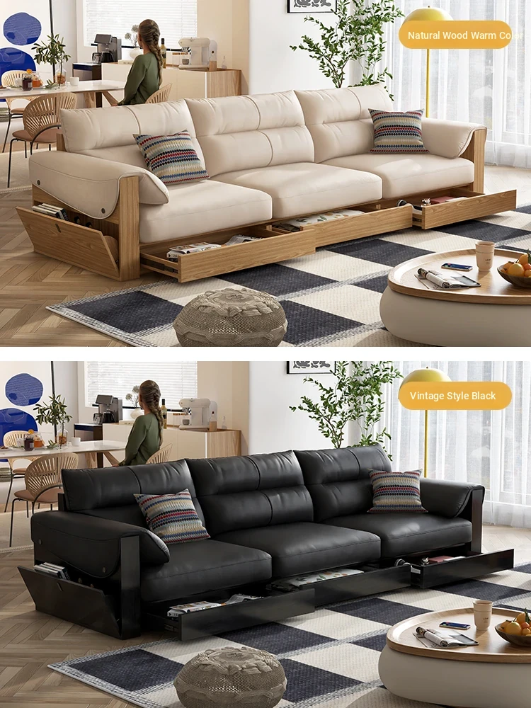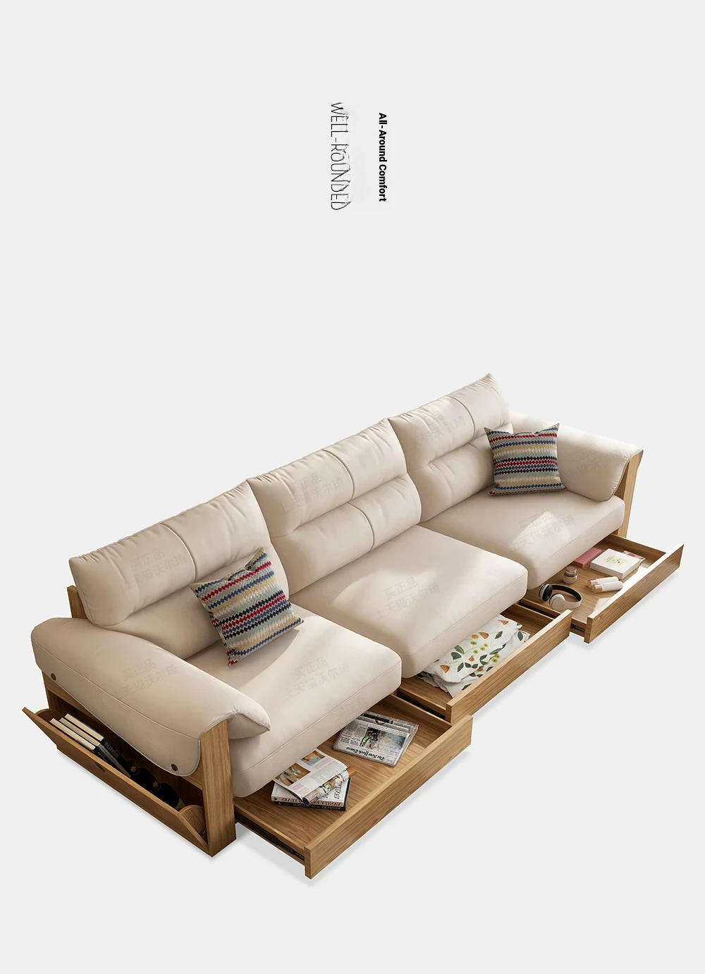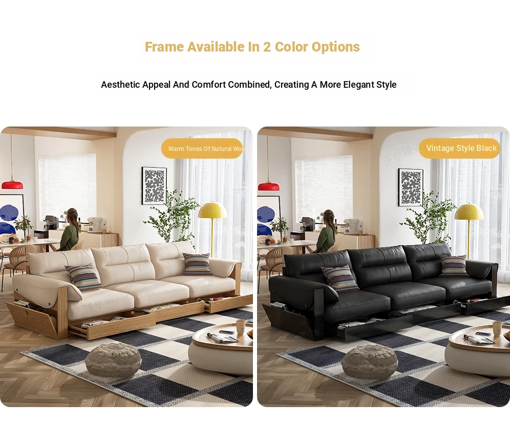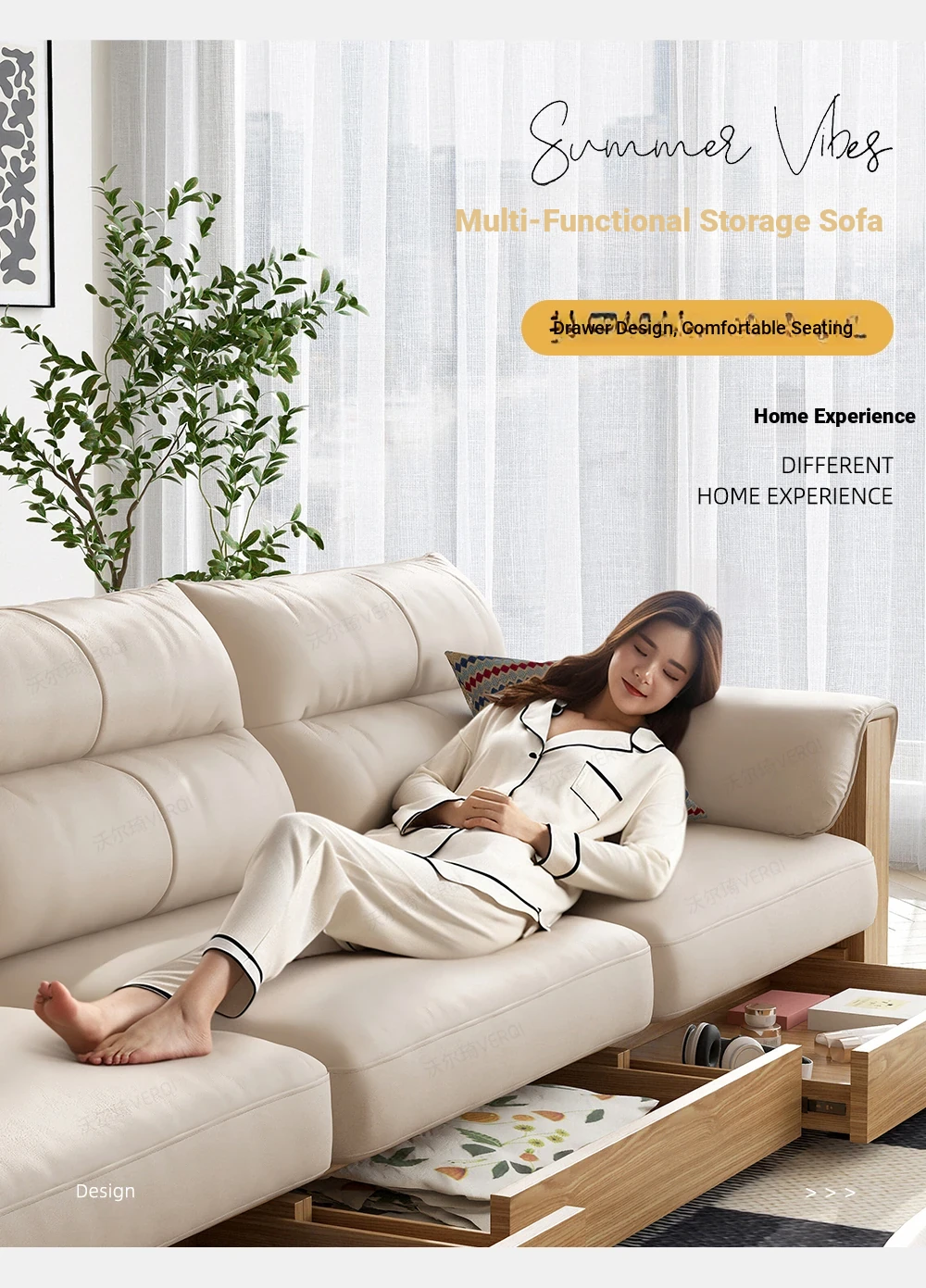 Woqi Japanese Style Solid Wood Sofa for Small Spaces - Elegant Elephant Ear Design with Real Leather and Multi-functional Storage Solutions