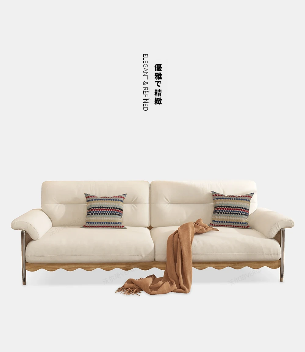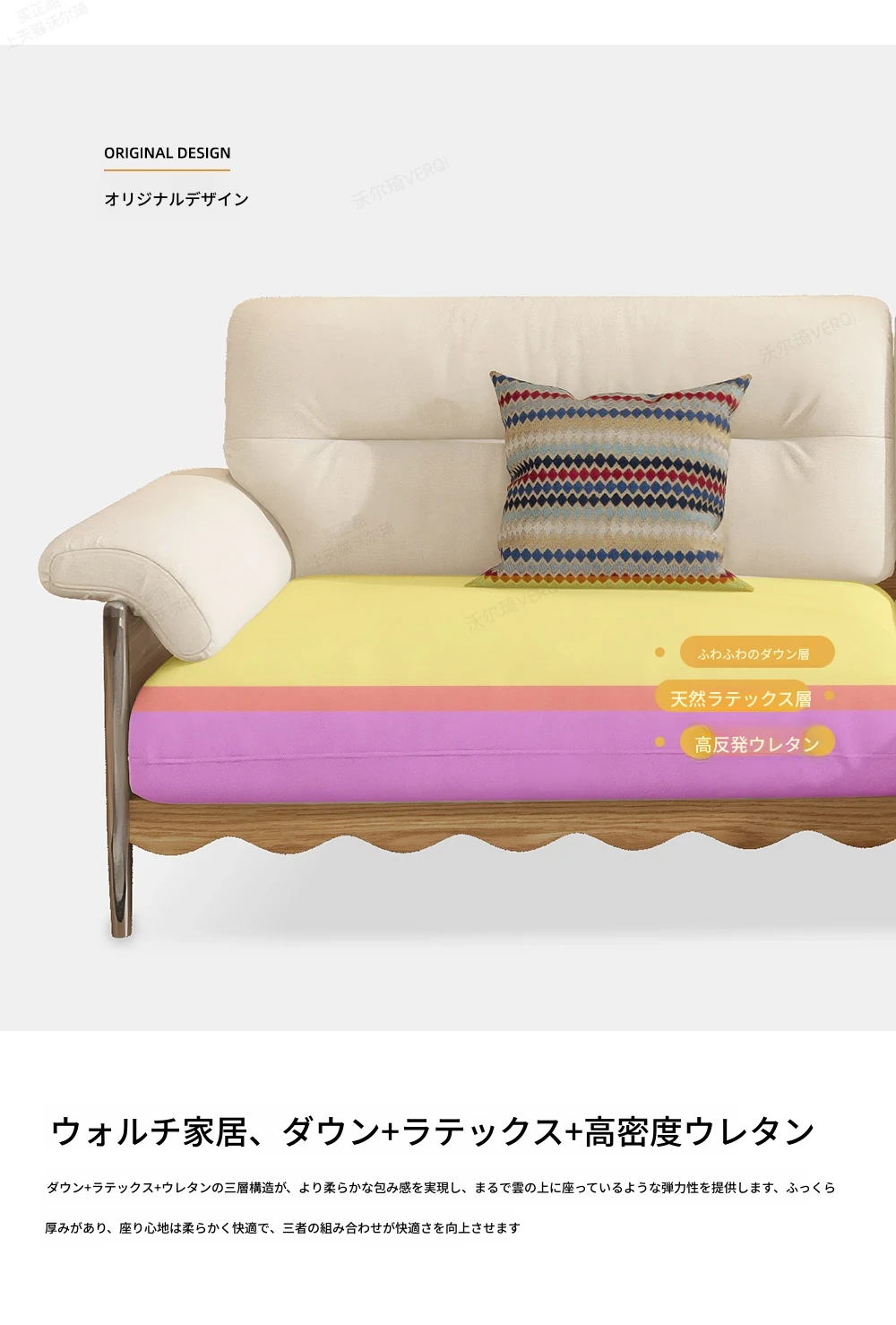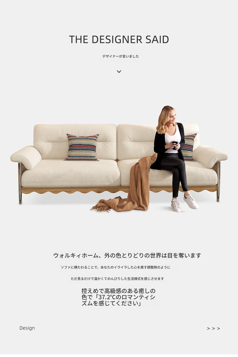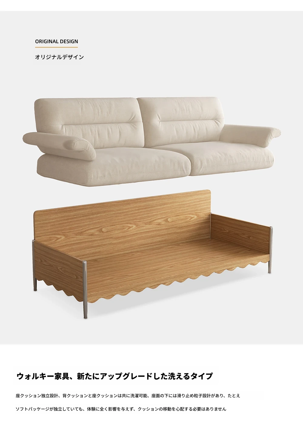 クラウド天然木製ソファー - クリームカラーのナチュラル風、和風デザインのコンパクトなリビング向け。レトロな直線デザイン、取り外し洗濯可能な生地、猫の爪にも強い!おしゃれで快適な空間を演出します。