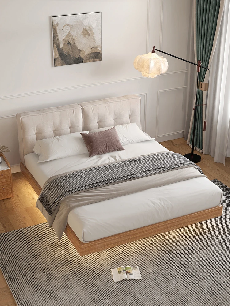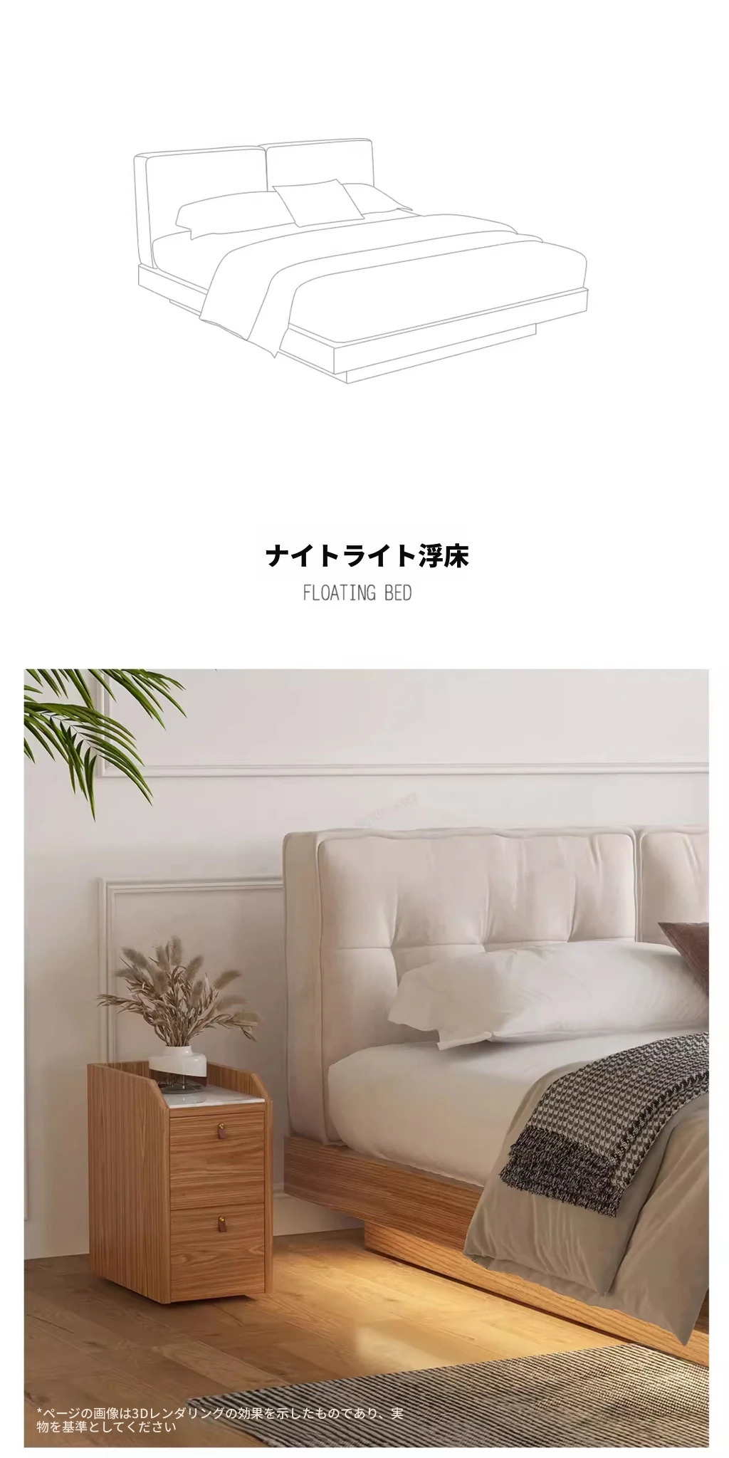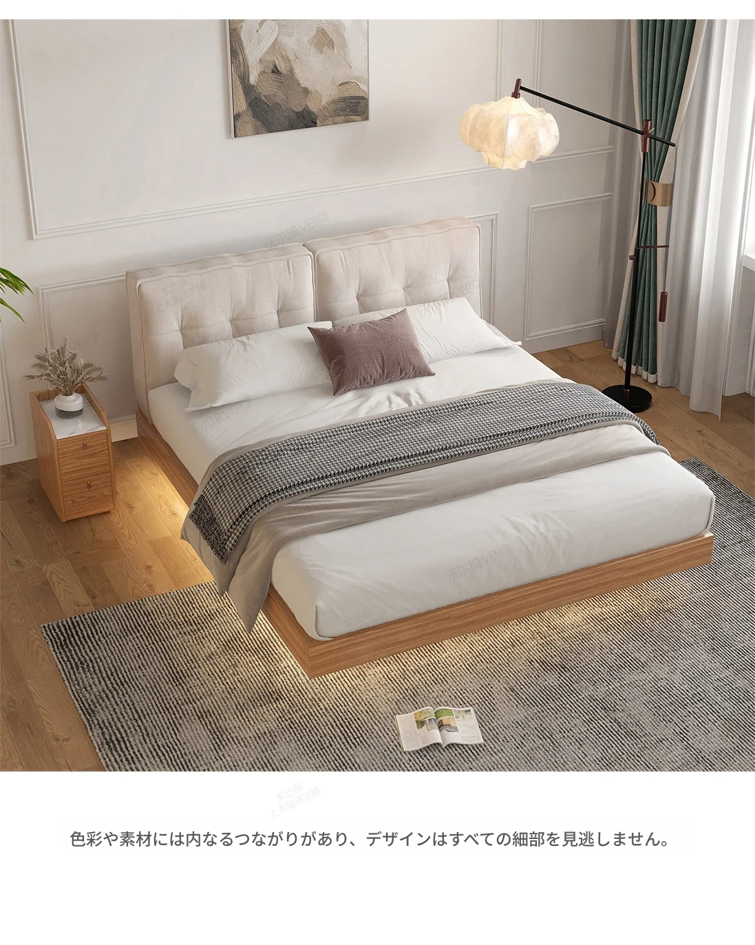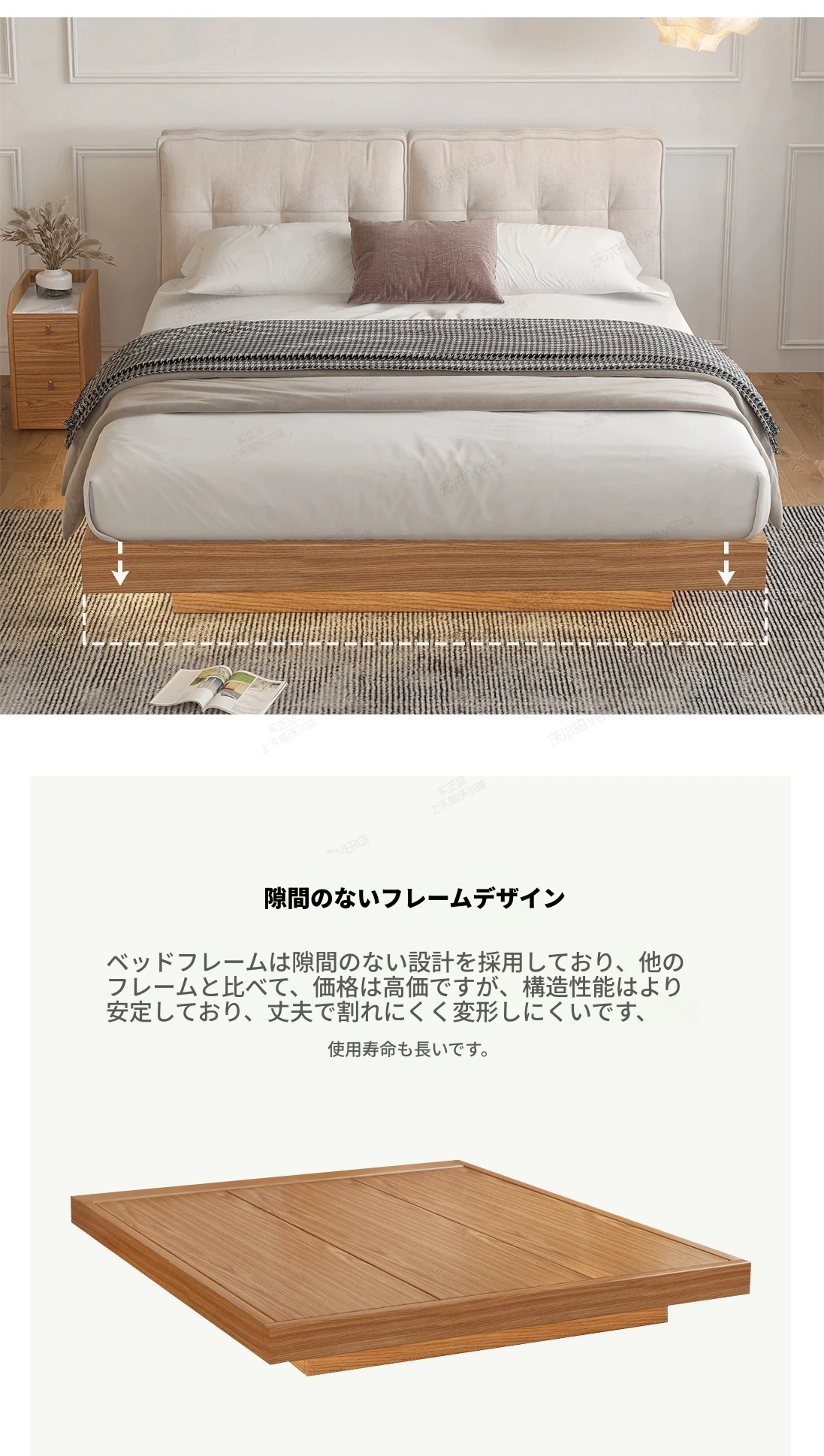 ホワイトアッシュ製の浮遊感ある和風無垢材ベッド - シンプルでモダンなデザイン、小さな部屋にも最適なソフトパッド付き北欧スタイルのダブルベッド。主寝室をおしゃれに演出します!