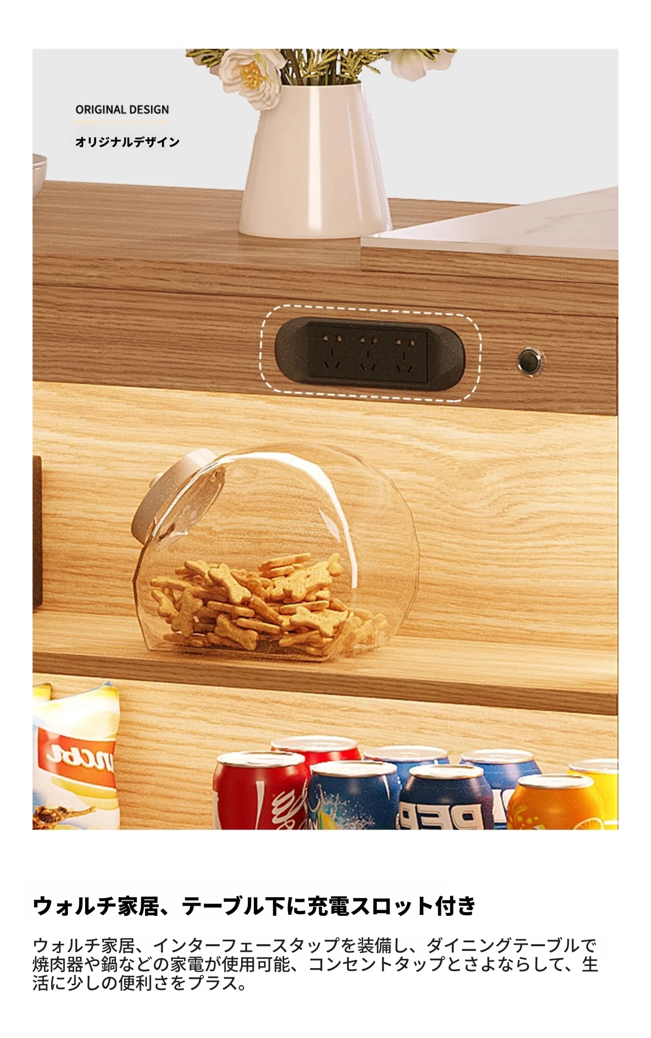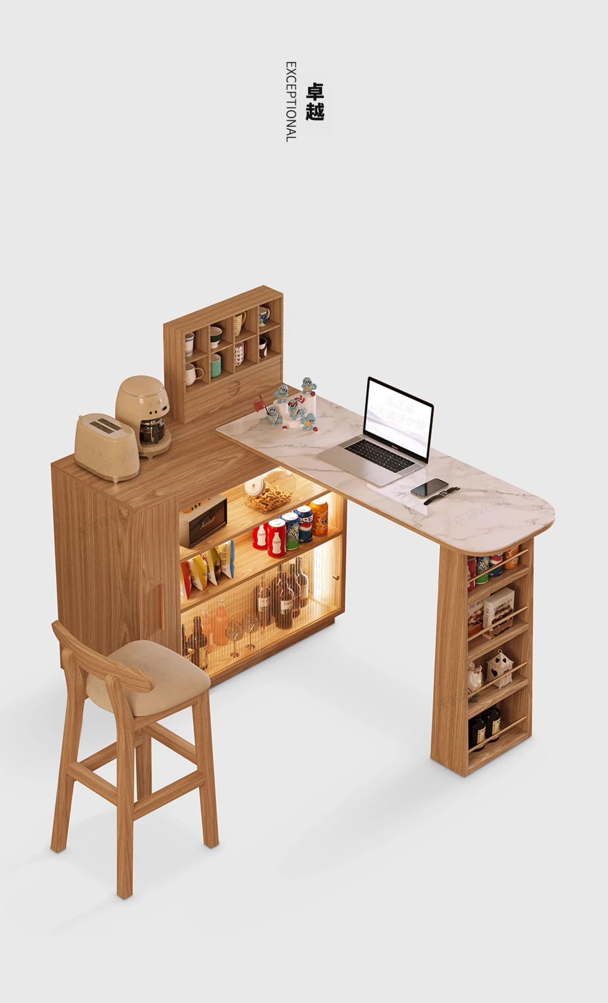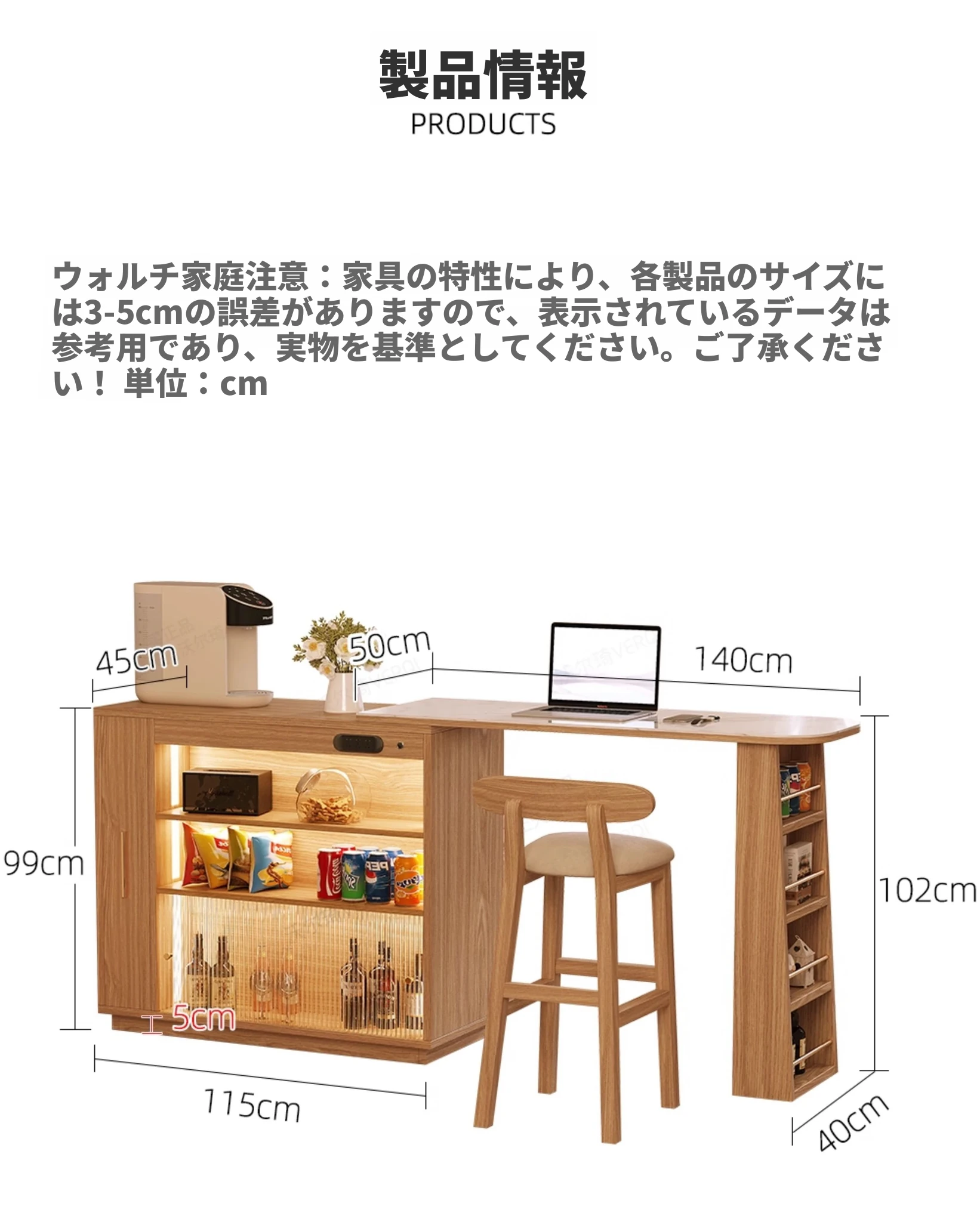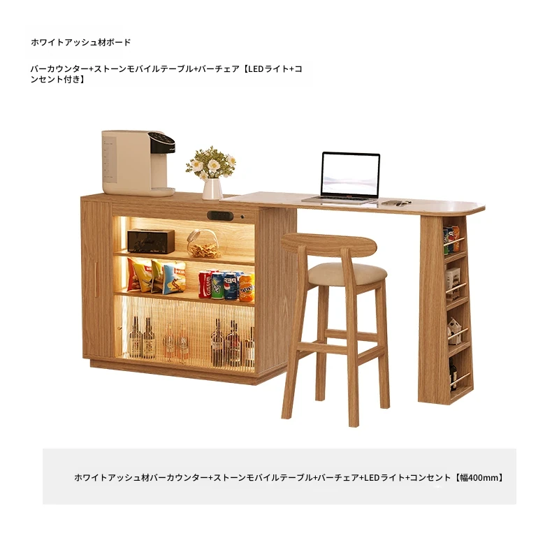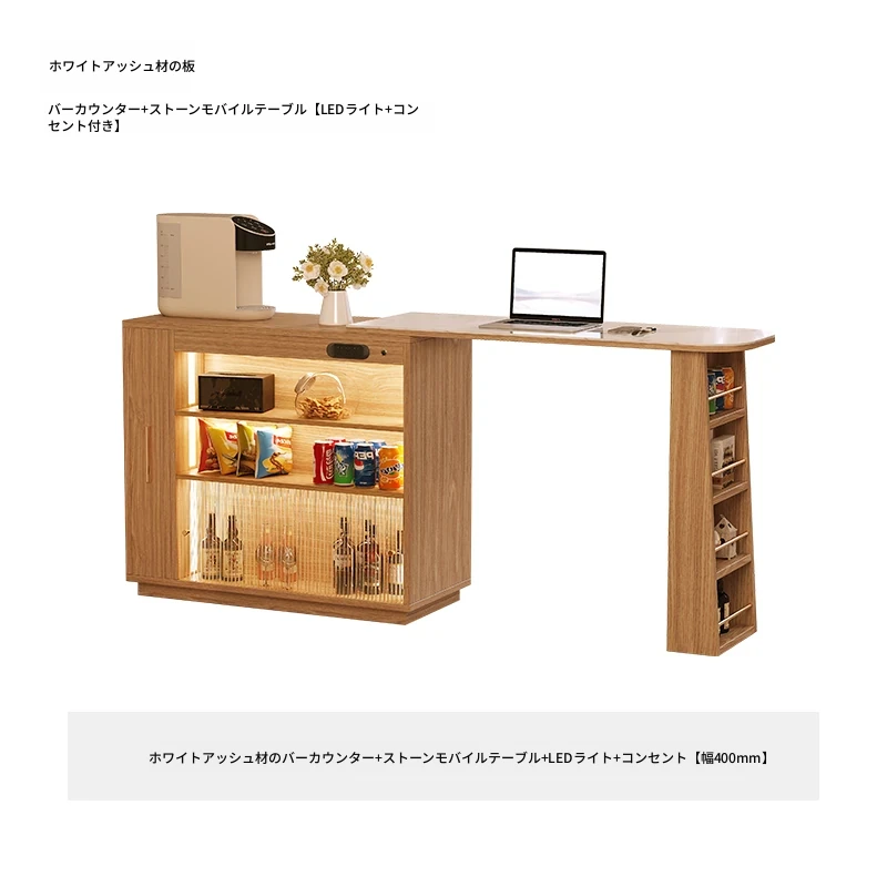 ホワイトアッシュ木板 バーカウンター+石板移動テーブル【LEDライト+コンセント付き】 幅400mm