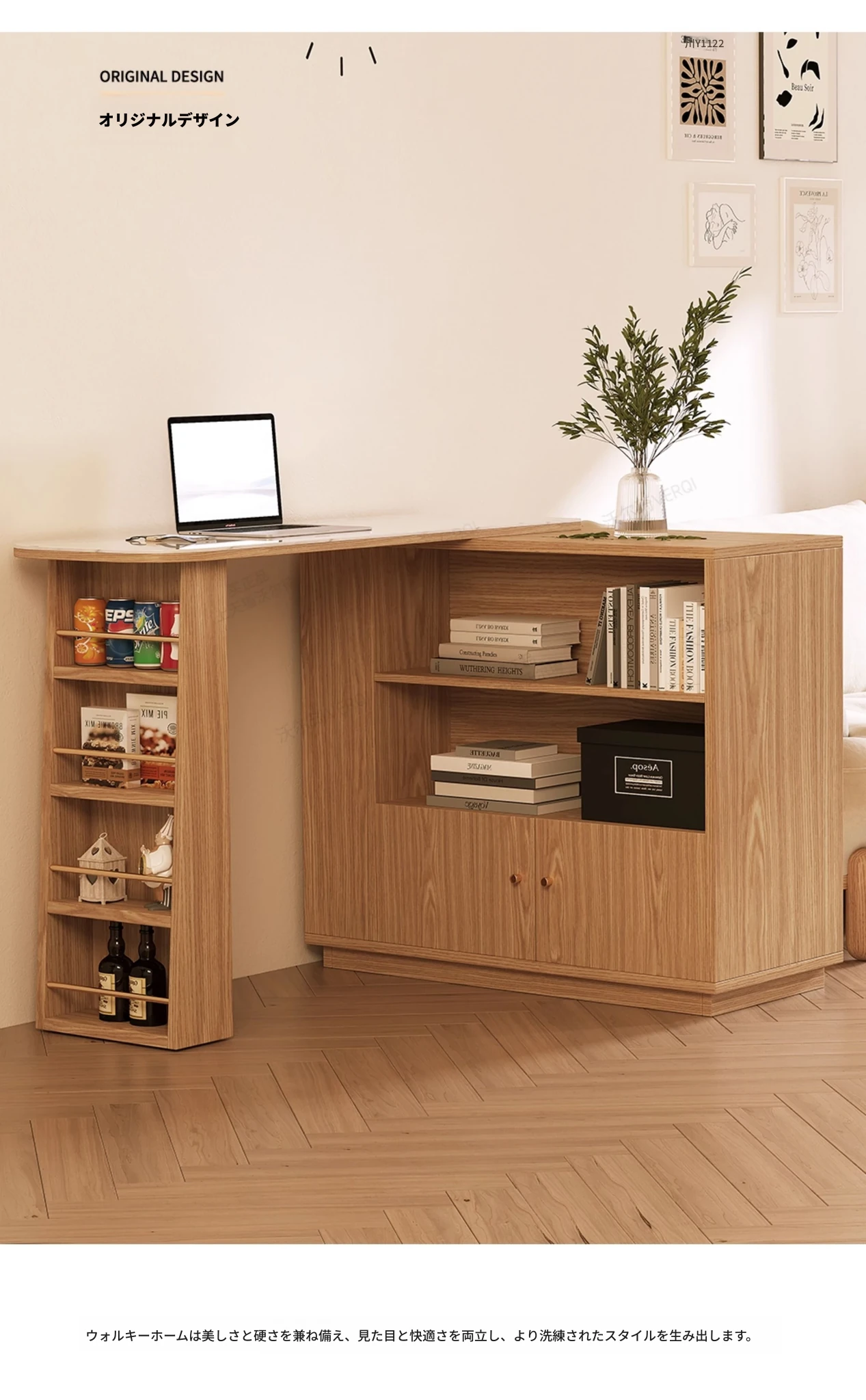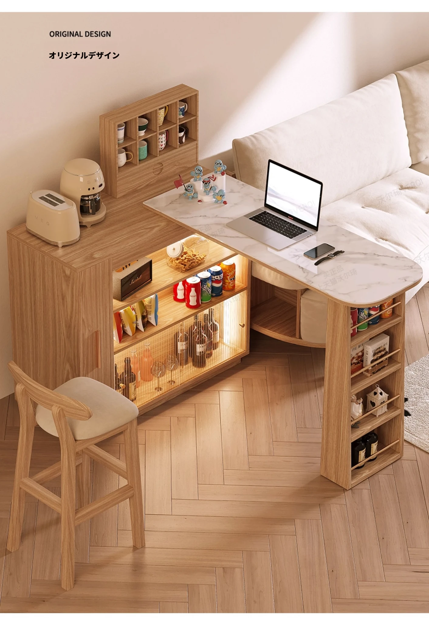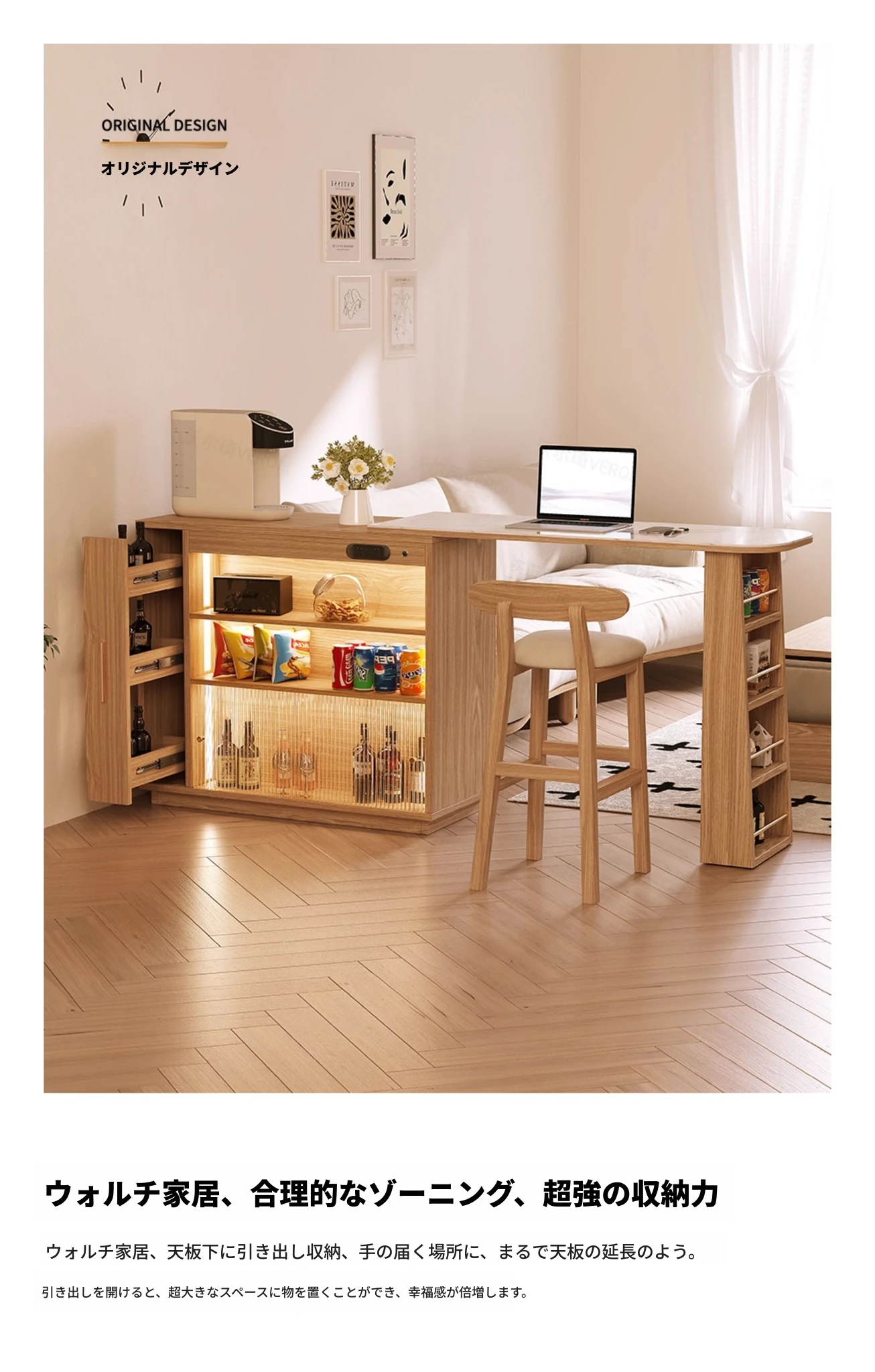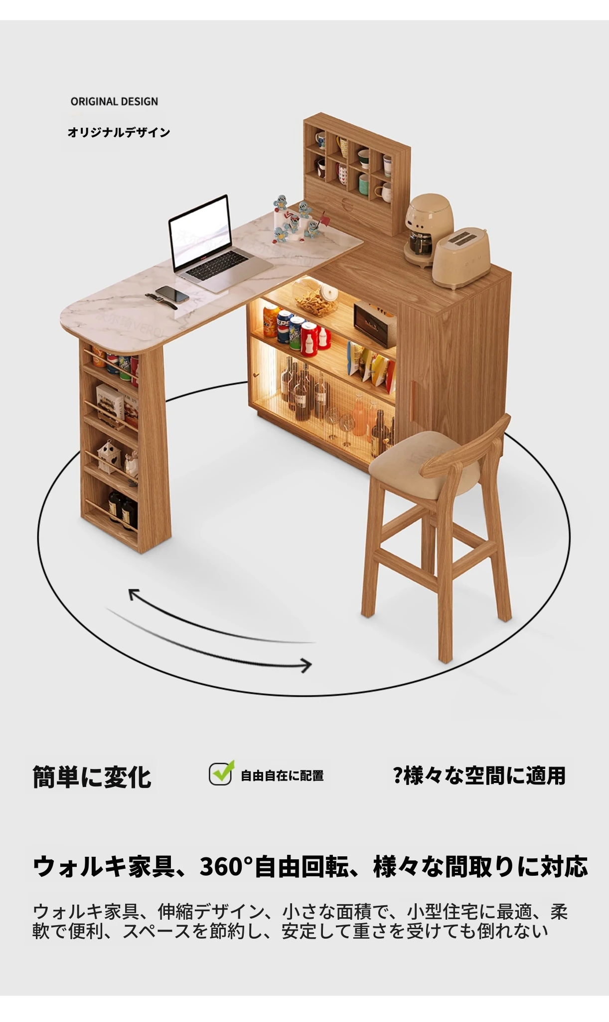 日本風の無垢材ロックプレートバーカウンター - モダンなリビングにぴったり!移動可能な間仕切りとダイニングテーブル機能を兼ね備えた小型住宅向けの多機能収納キャビネット。生活空間をスタイリッシュに演出します!