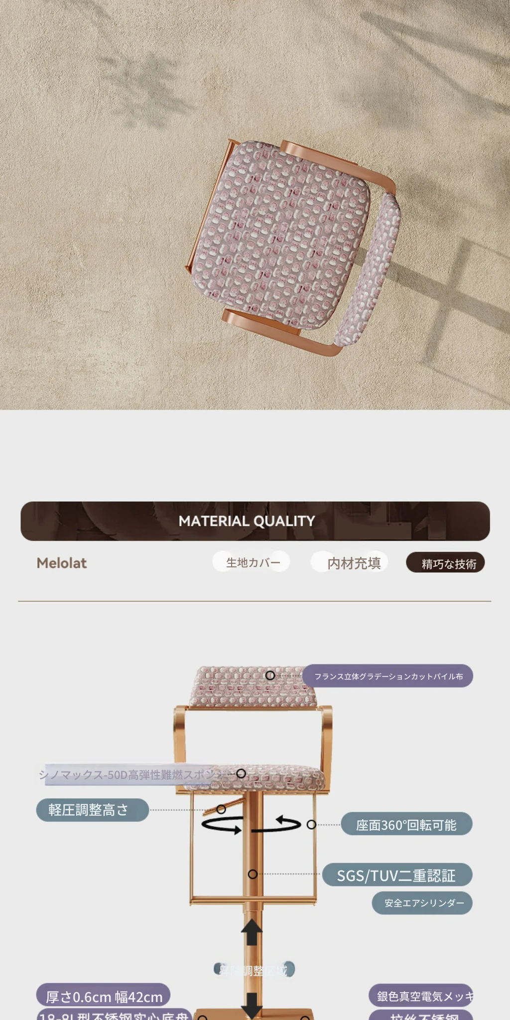 Meloalt スタイリッシュなイタリアンデザインのステンレス製ハイチェア - 家庭用に最適、昇降&回転機能付きのバースツール!快適さとデザイン性を兼ね備えた一品です。