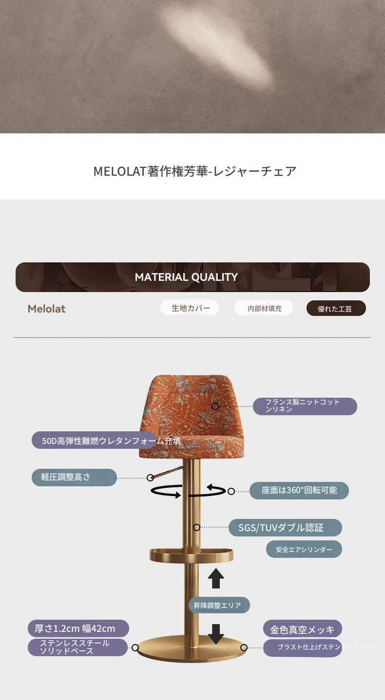 Meloalt ステンレス製バースツール - イタリアンデザインの家庭用ハイチェア、昇降&回転機能付き、オシャレなフロントデスク用バーチェア!快適さとスタイルを兼ね備えた選び抜かれた一品!