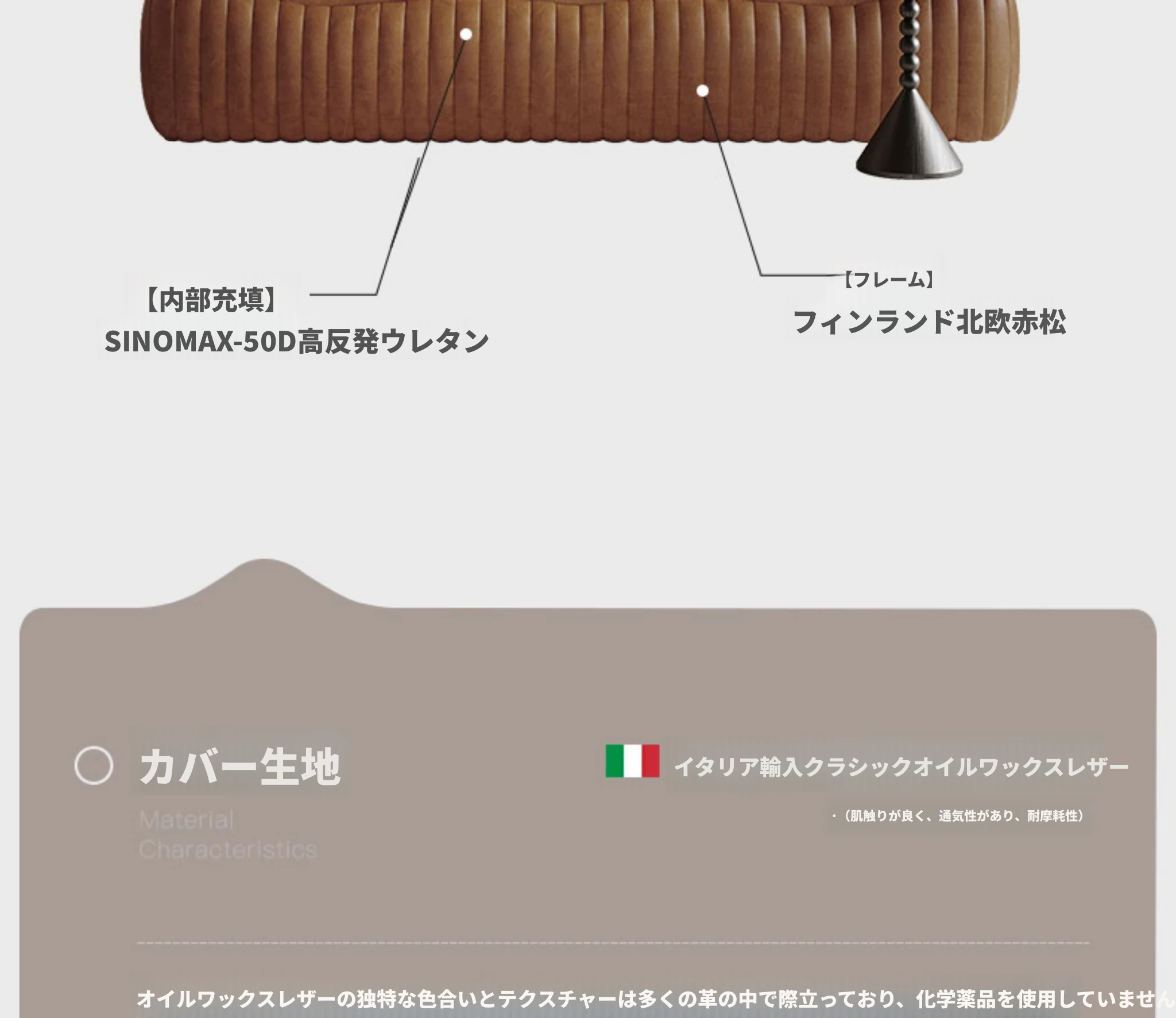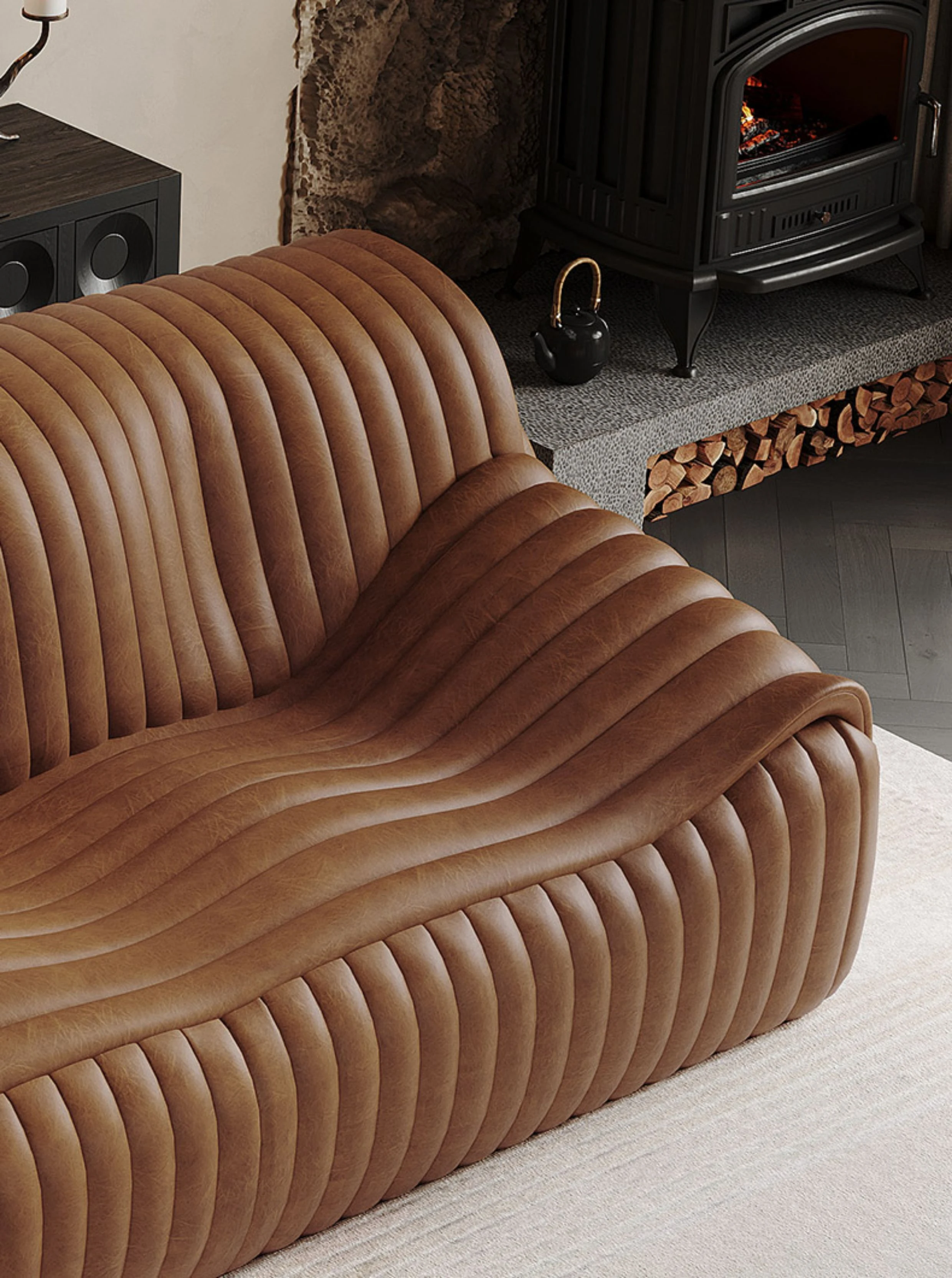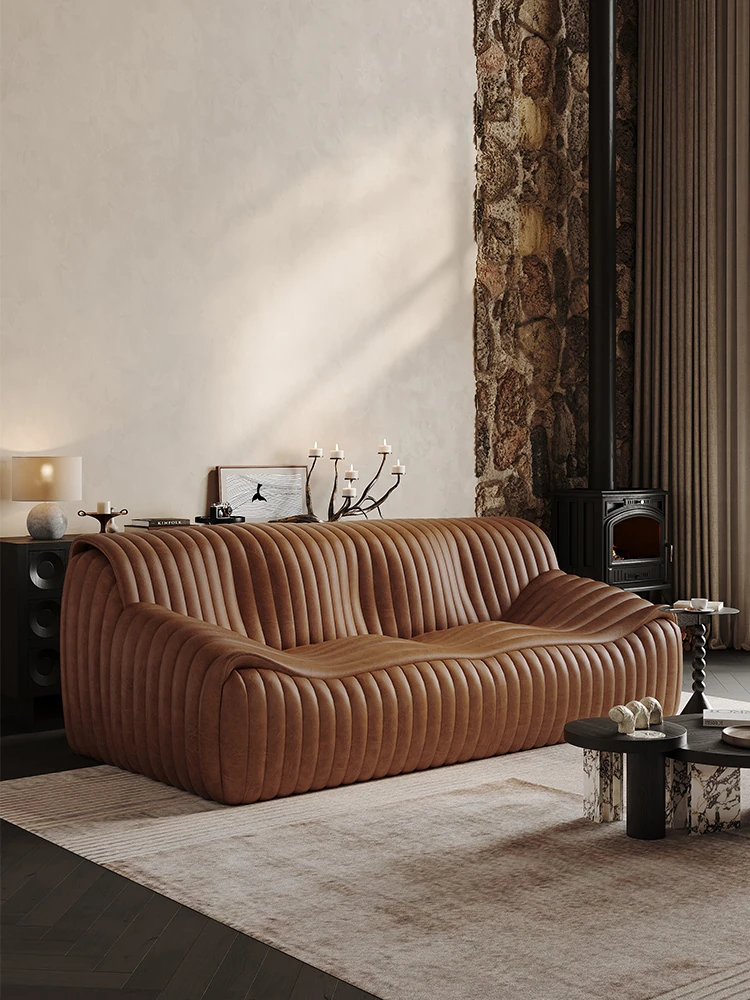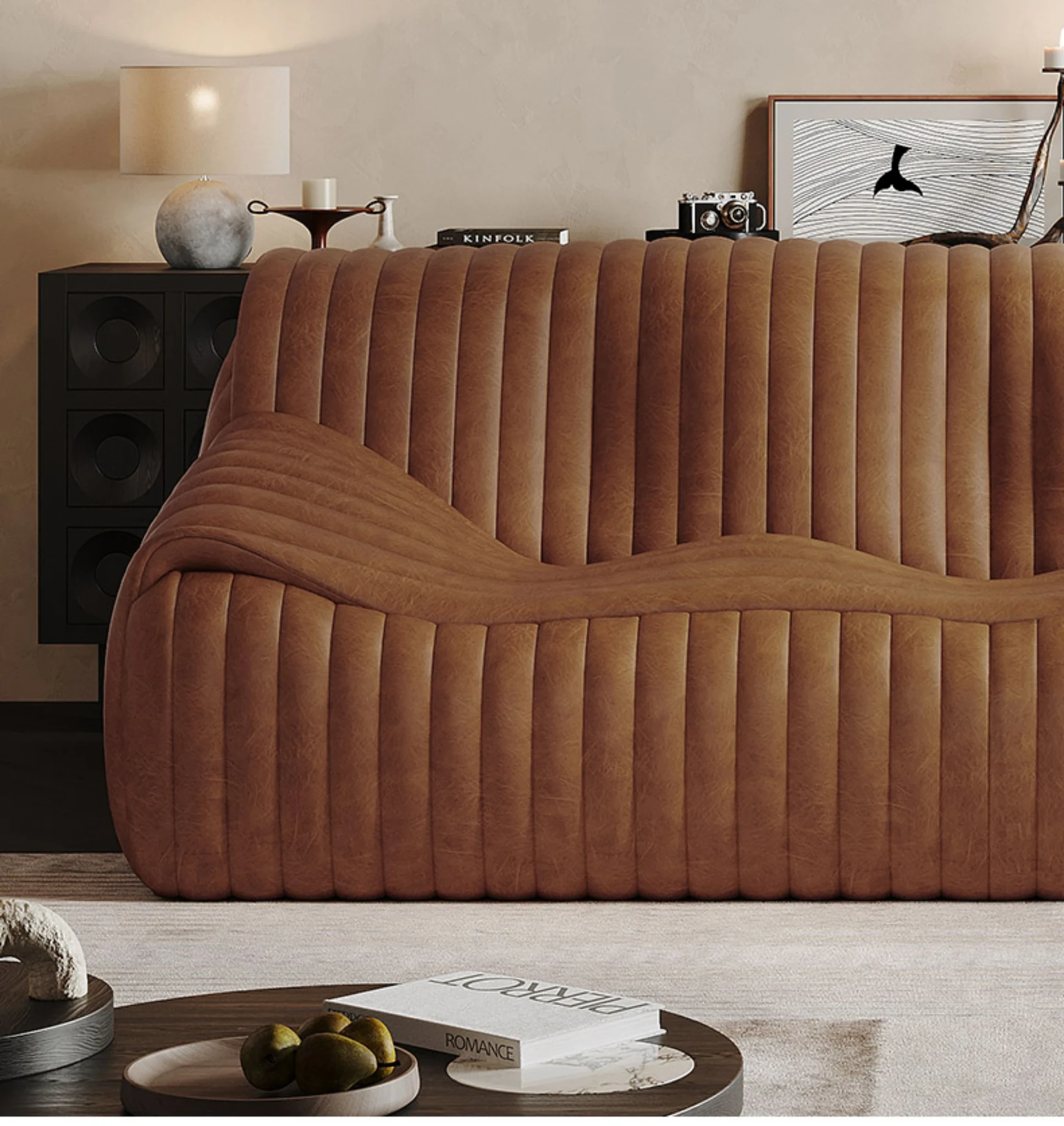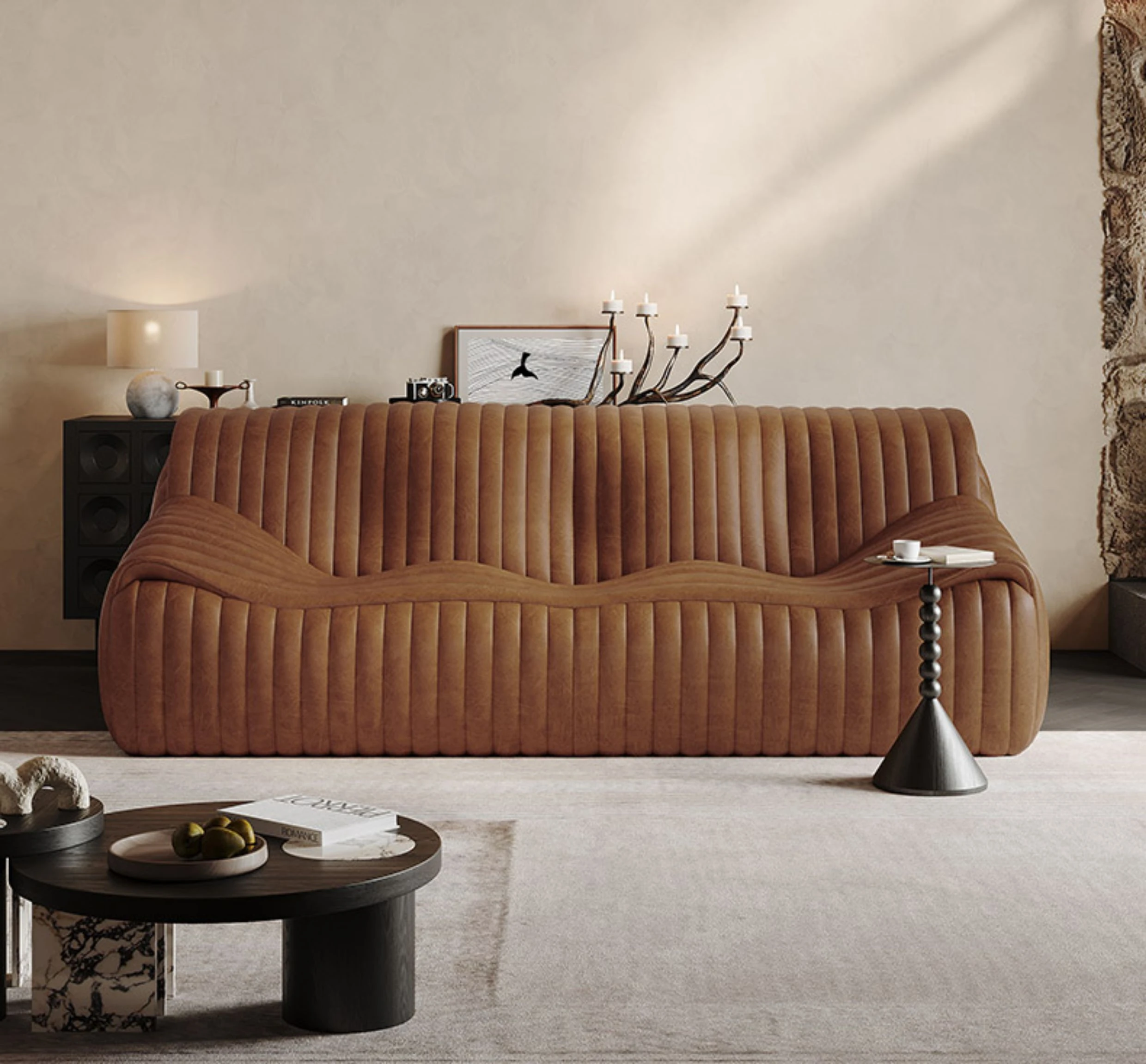 Melolatアメリカンヴィンテージオイルレザーウェーブソファ デザイナー直輸入 三人掛けフレンチスタイル本革ソファ - 高級感あふれるデザインで、くつろぎのひとときを提供します!