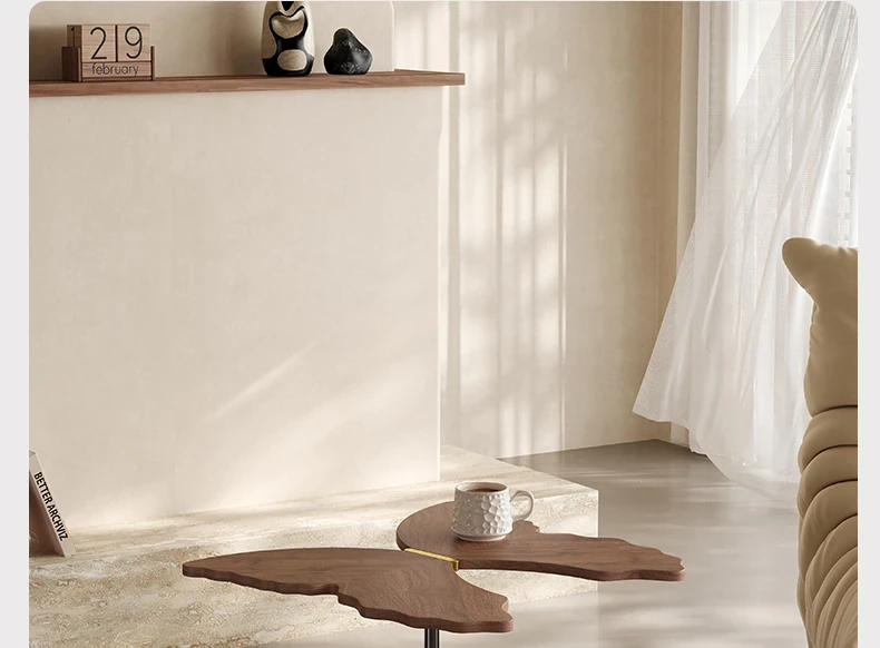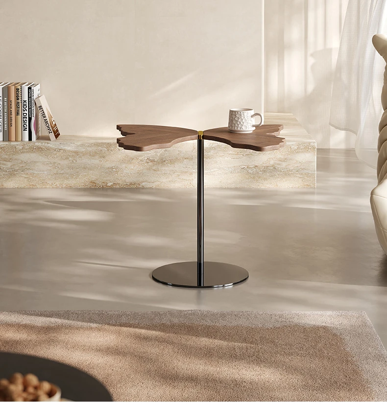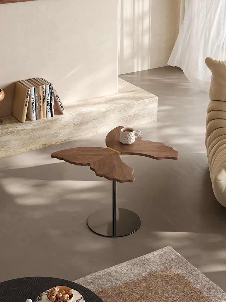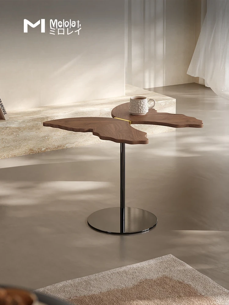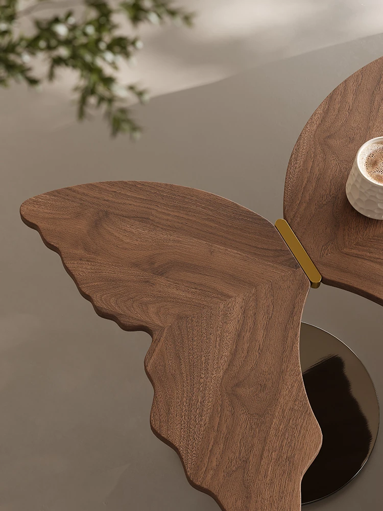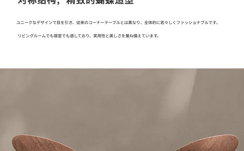 メロラット 蝶のようなデザインの新作コーナーテーブル!クリエイティブでミニマルなデザイン、ウォールナットカラーのユニークな形状で、お部屋をおしゃれに演出します。
