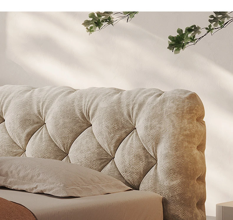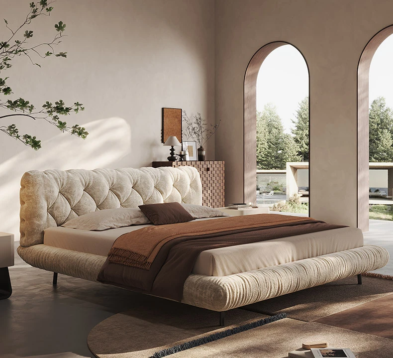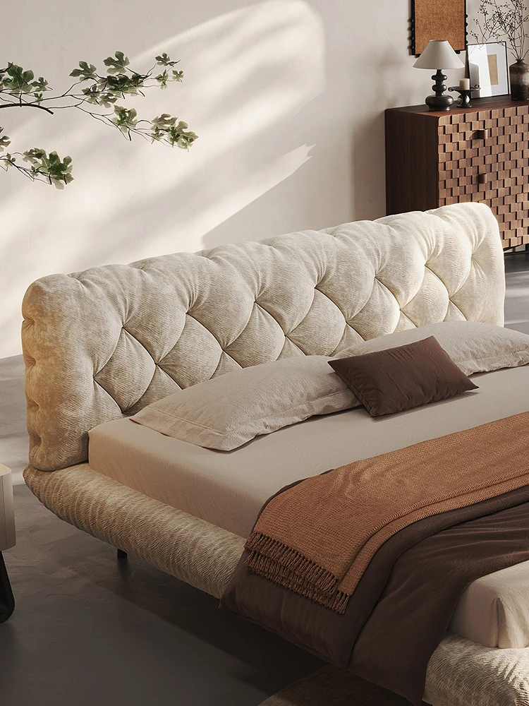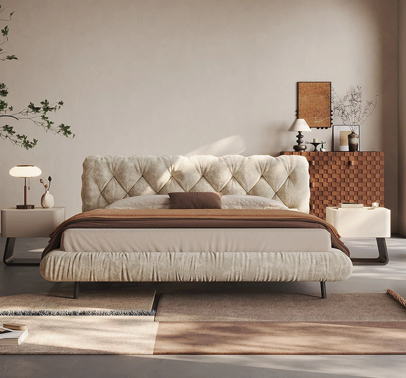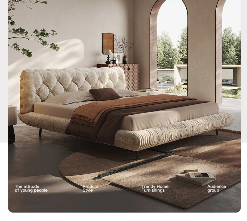 メロラットデザイナー布製ベッド|イタリアンミニマリストクリームスタイルの主寝室用ダブルマリッジベッド|現代的なシンプルさを追求した特許取得済みベッド