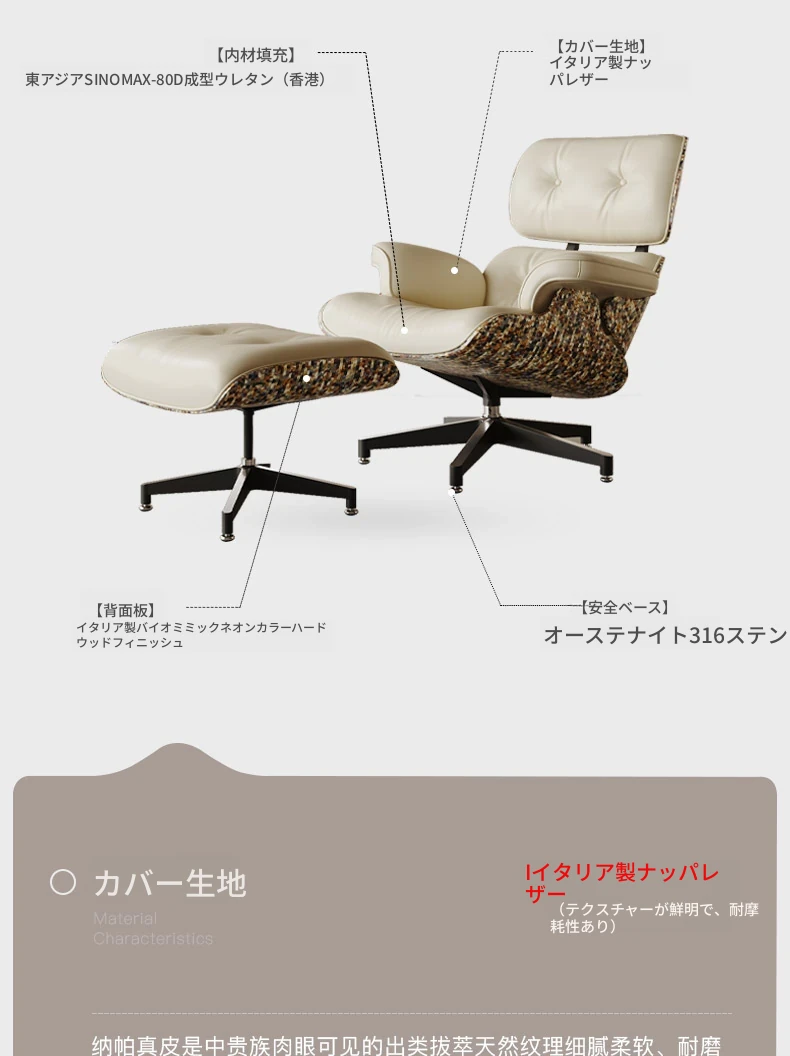 メロラット イームズリクライナー 北欧スタイルのラグジュアリーソファ イタリア製本革 ビジネスシート 回転機能付き リラックスソファ