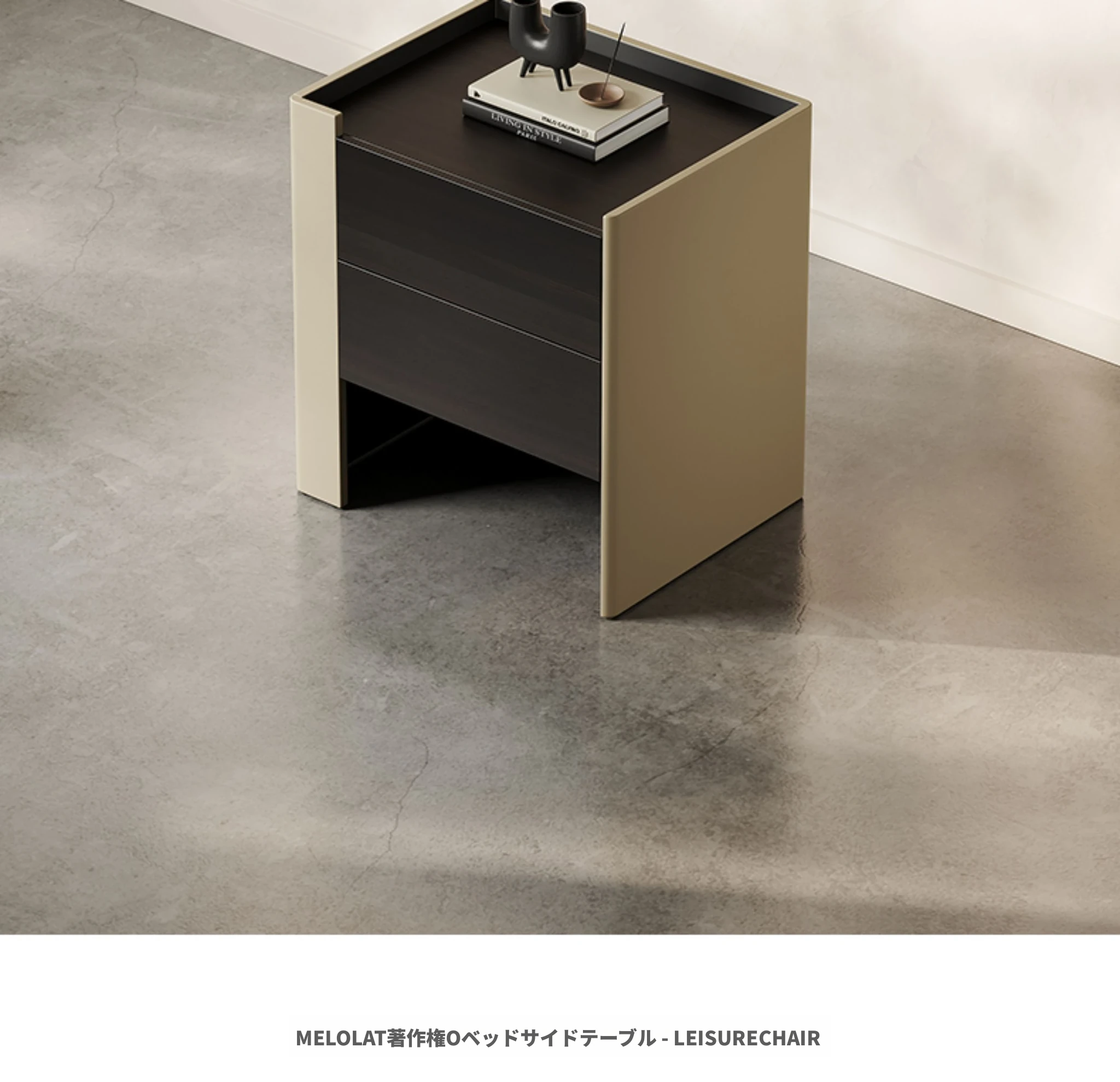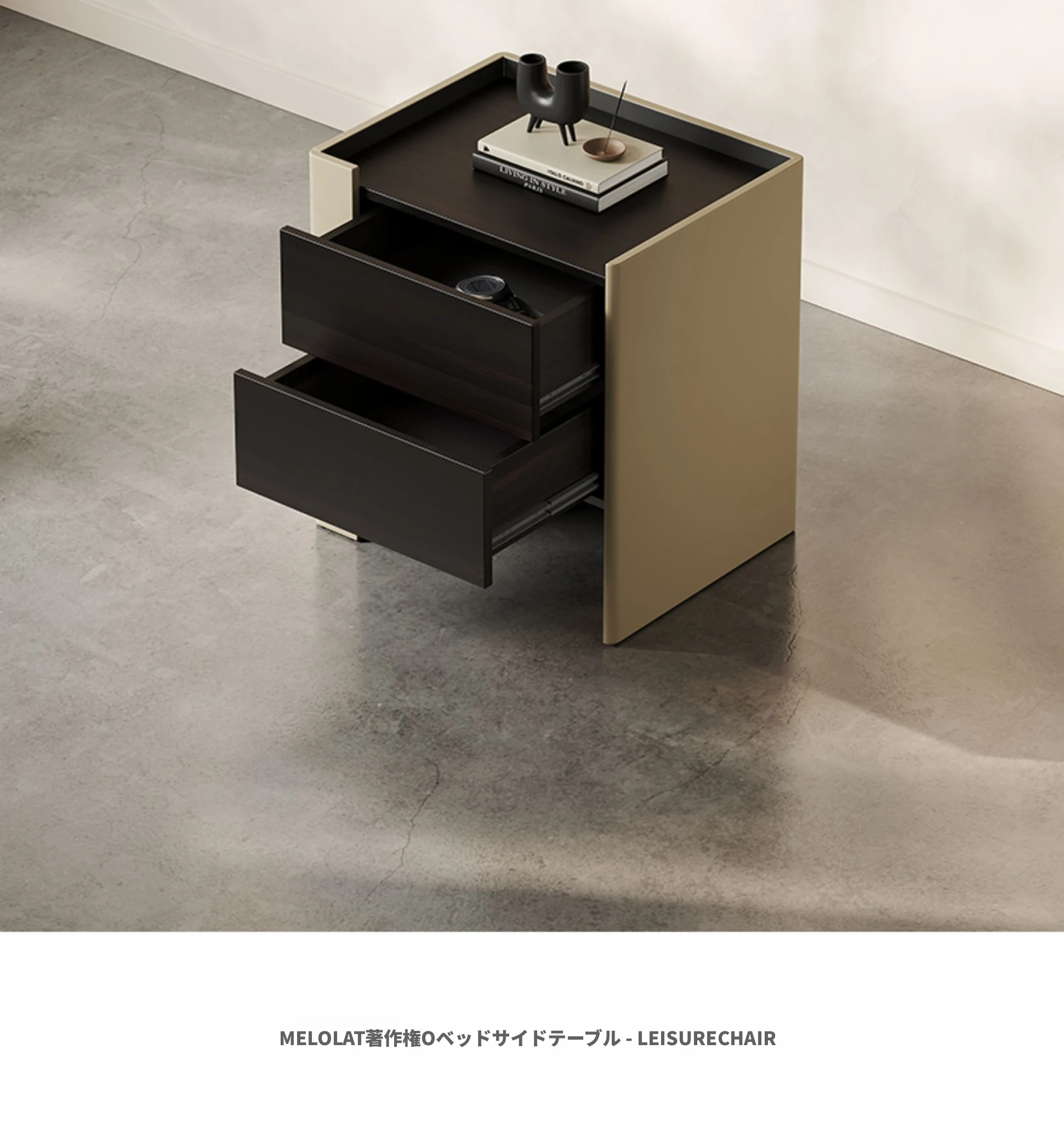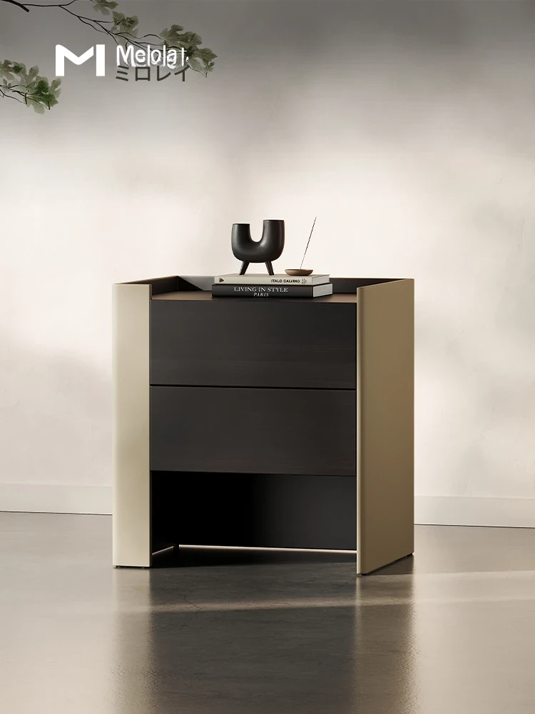 メロラット ベッドサイドテーブル - ラグジュアリーでシンプルな現代デザインの主寝室用収納キャビネット。デザイナーによるサドルレザー仕上げで、スタイリッシュさと機能性を両立!