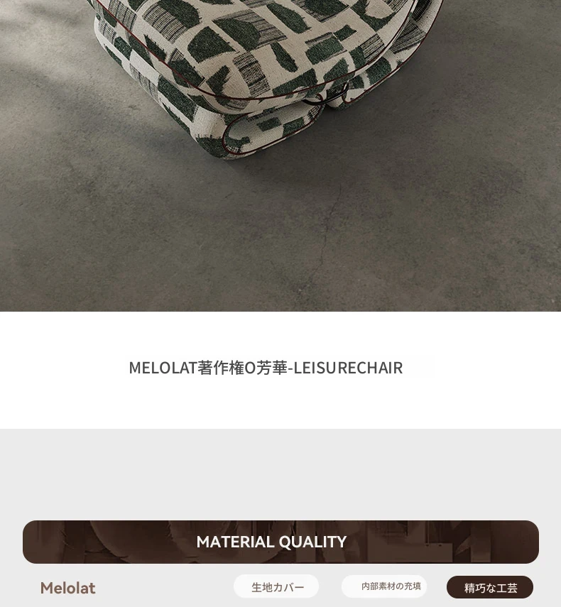 Melolatオリジナル初登場!モダンリビングにぴったりな一人掛け布製リラックスチェア。バルコニーにも最適なラグジュアリーなサロンソファ。心地よいひとときをお楽しみください!