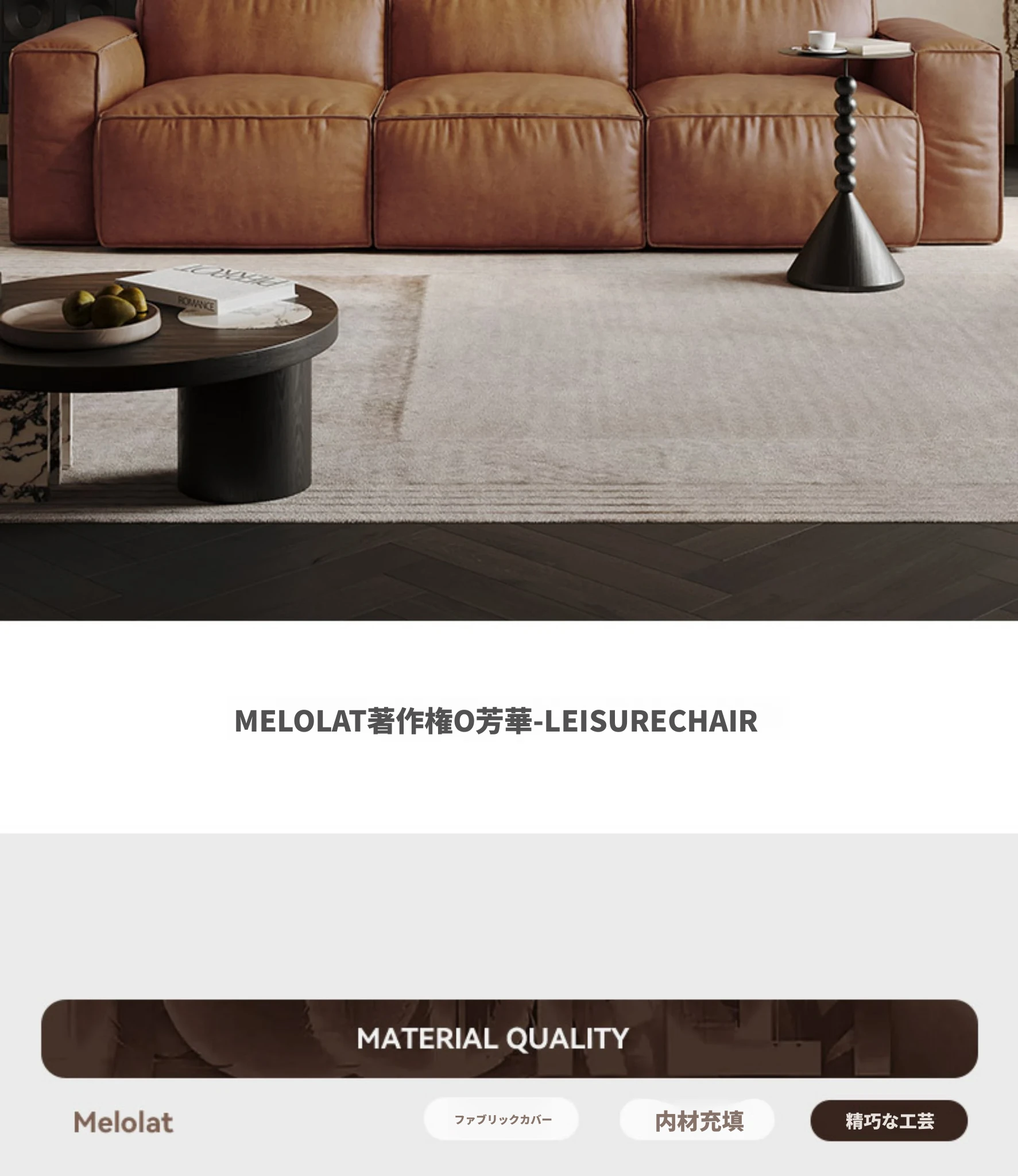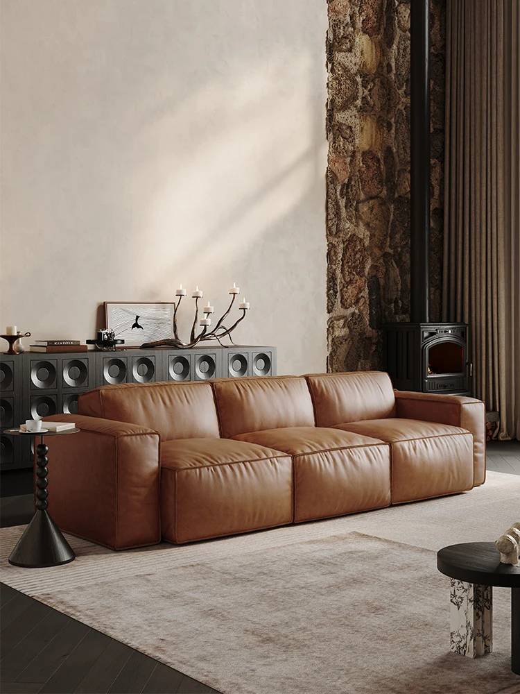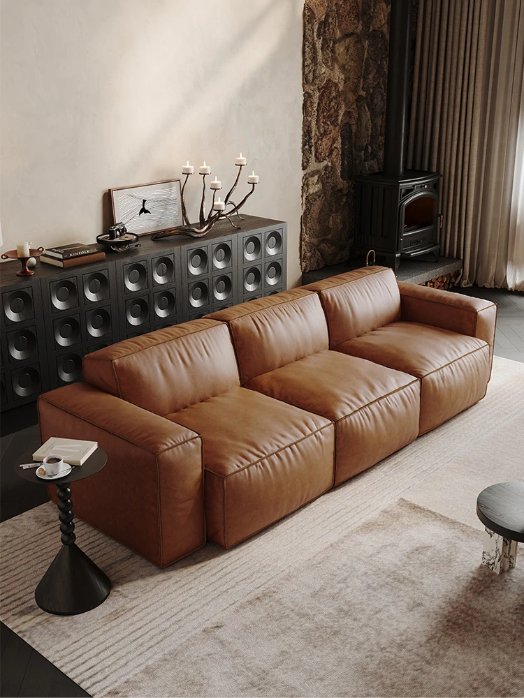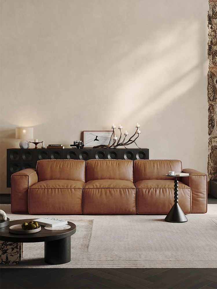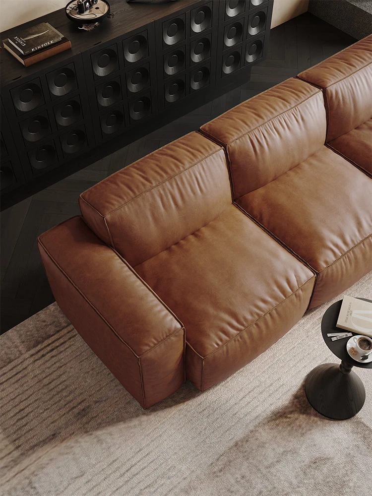 メロラット豆腐ブロックオイルワックスレザーソファー - 北欧スタイルの本革リビングルーム用直線ソファー、シンプルでスタイリッシュなソファーセット!快適な座り心地と洗練されたデザインで、あなたの空間を引き立てます。