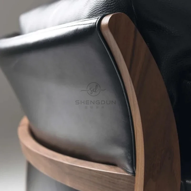 新中式デザインの無垢材とファブリックを使用した北米ブラックウォールナット調のホテル・民宿向けデザイナーソファ。1人掛け、2人掛け、3人掛け対応で、快適な談話空間を演出します。