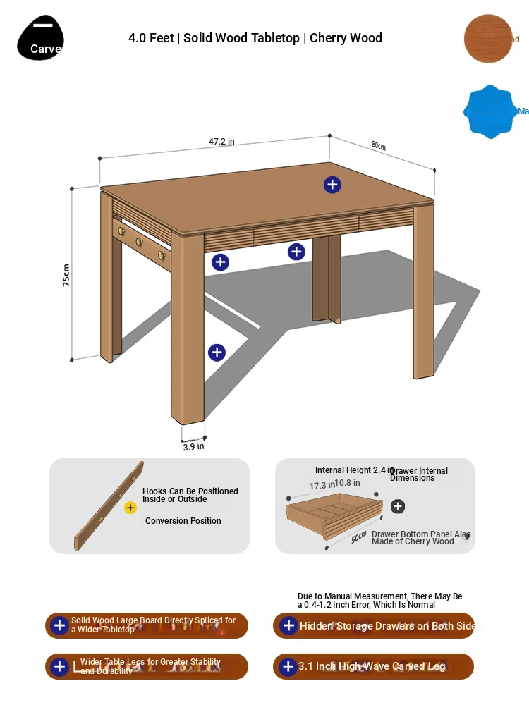[Cherry Wood | No Auxiliary Material] 47.24 in Cherry Wood Surface | With Power Track