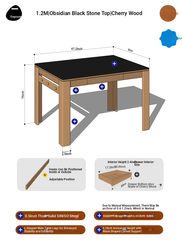 [Cherry Wood | No Auxiliary Material] 47.24 in Obsidian Black Rock Slab | With Power Track