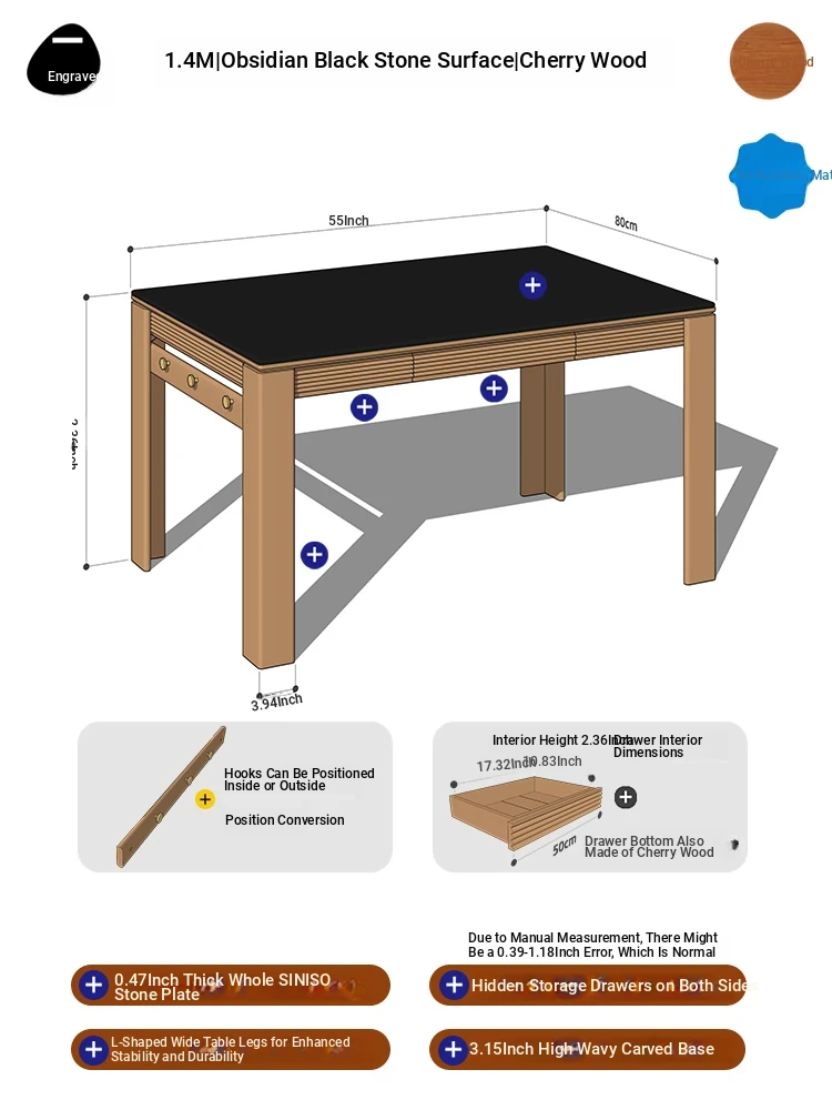 [Cherry Wood | No Auxiliary Material] 55.12 in Obsidian Black Rock Slab | With Power Track