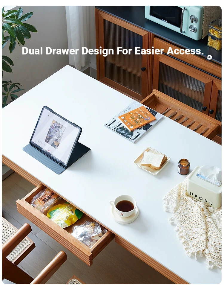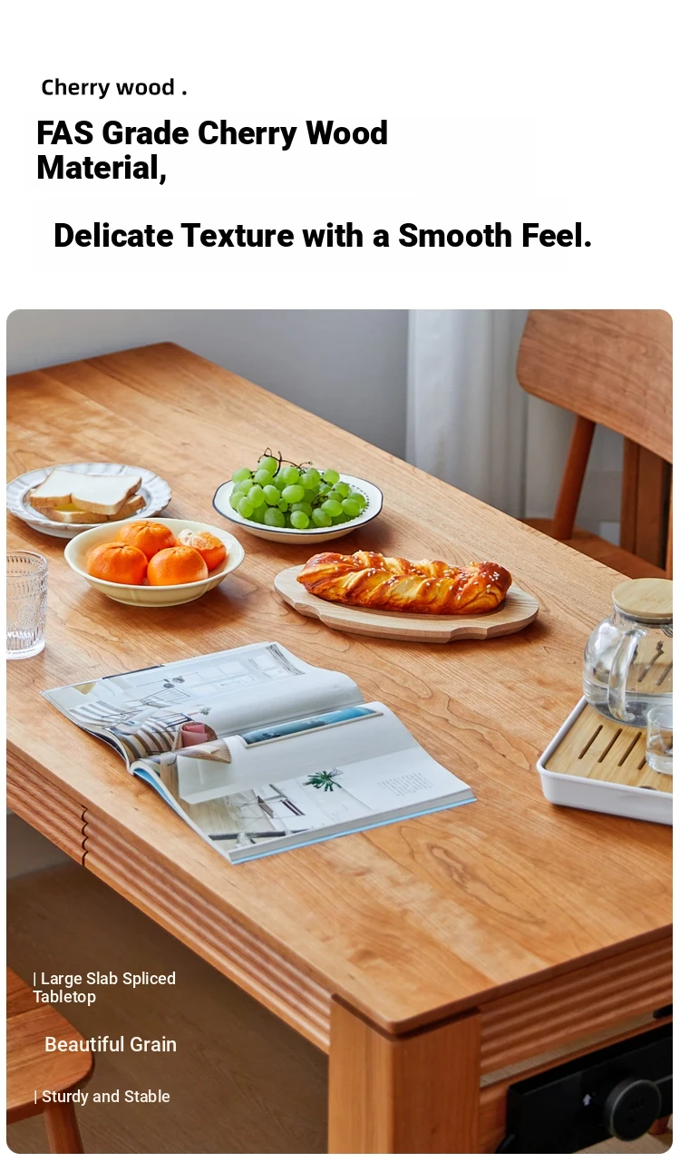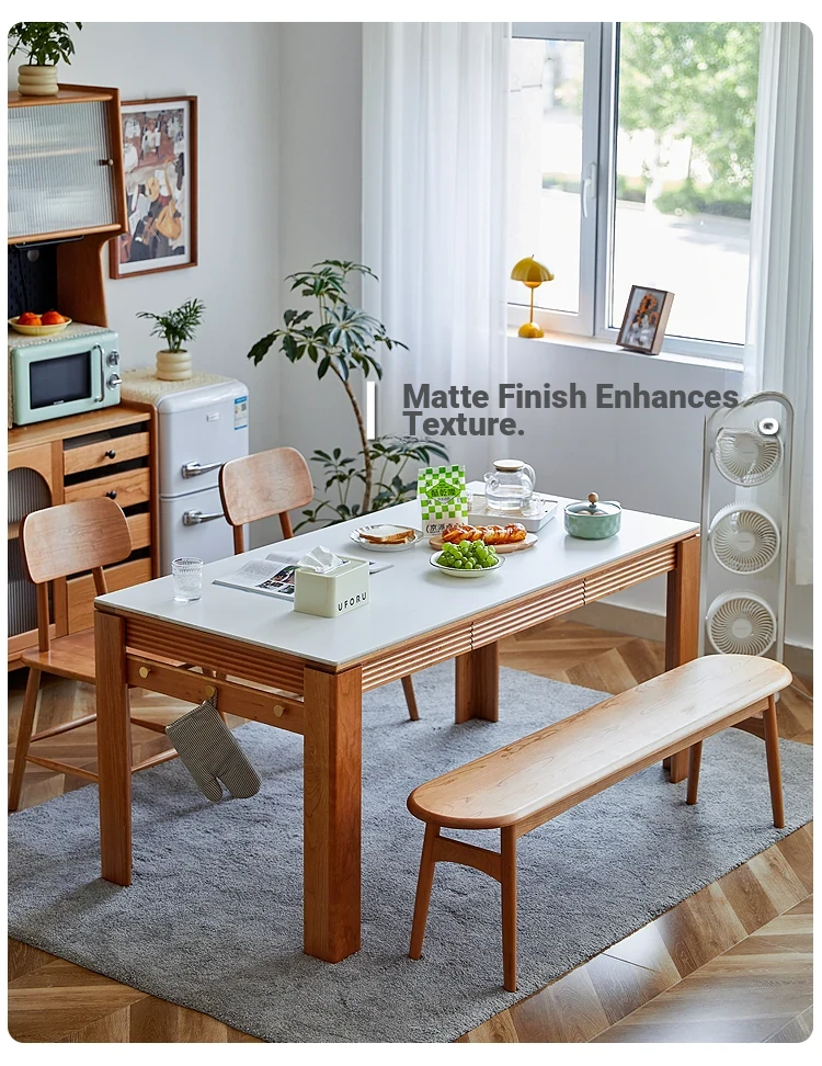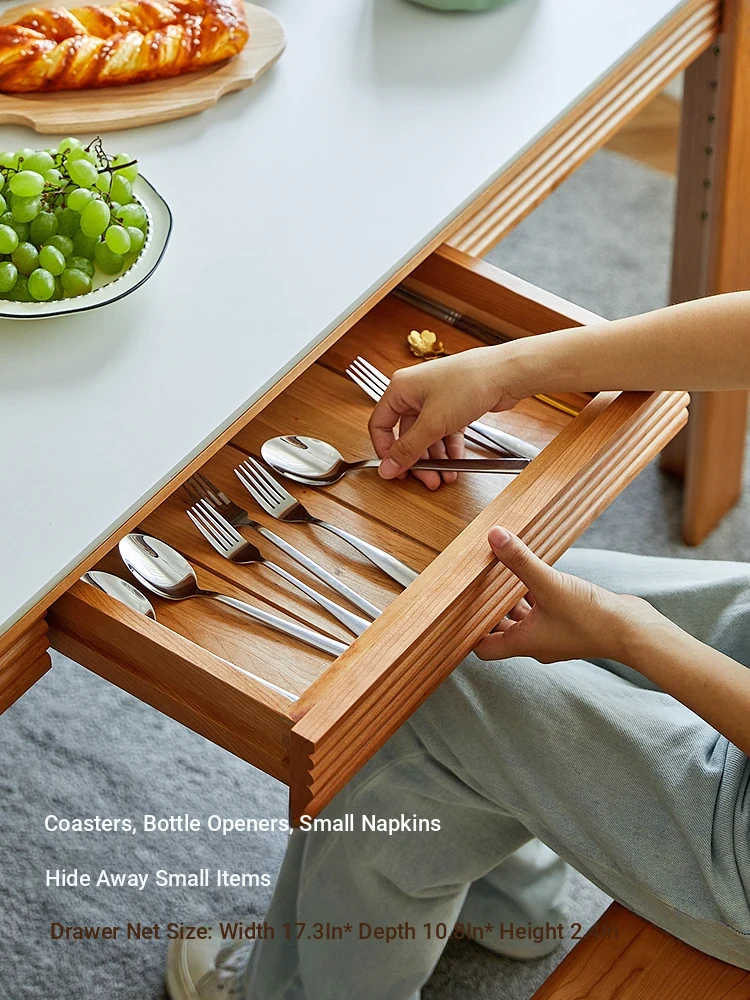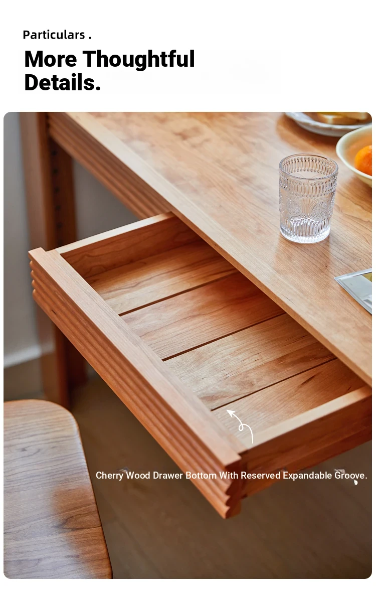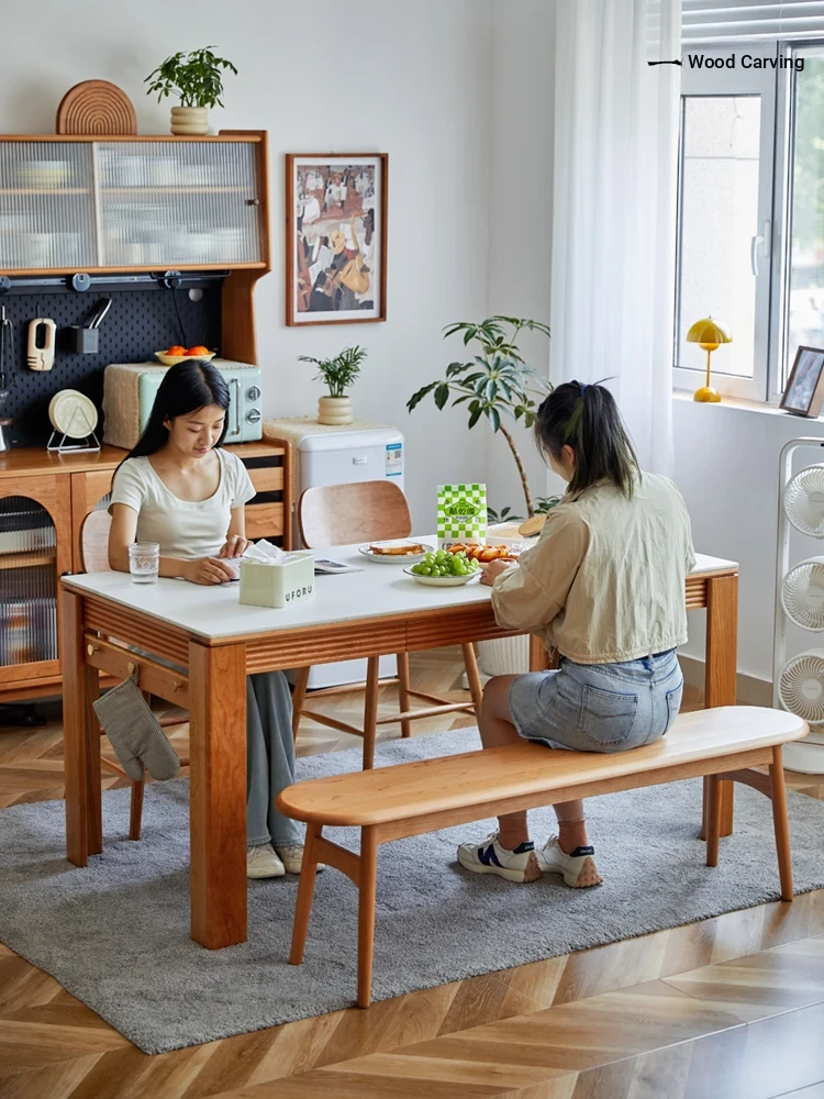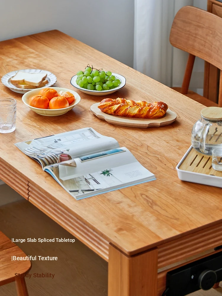 Nordic-Style Solid Wood Dining Table with Drawers - Cherry Wood Cream Finish Long Table for Small Spaces, Perfect for Your Dining Room
