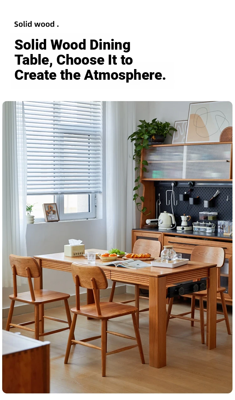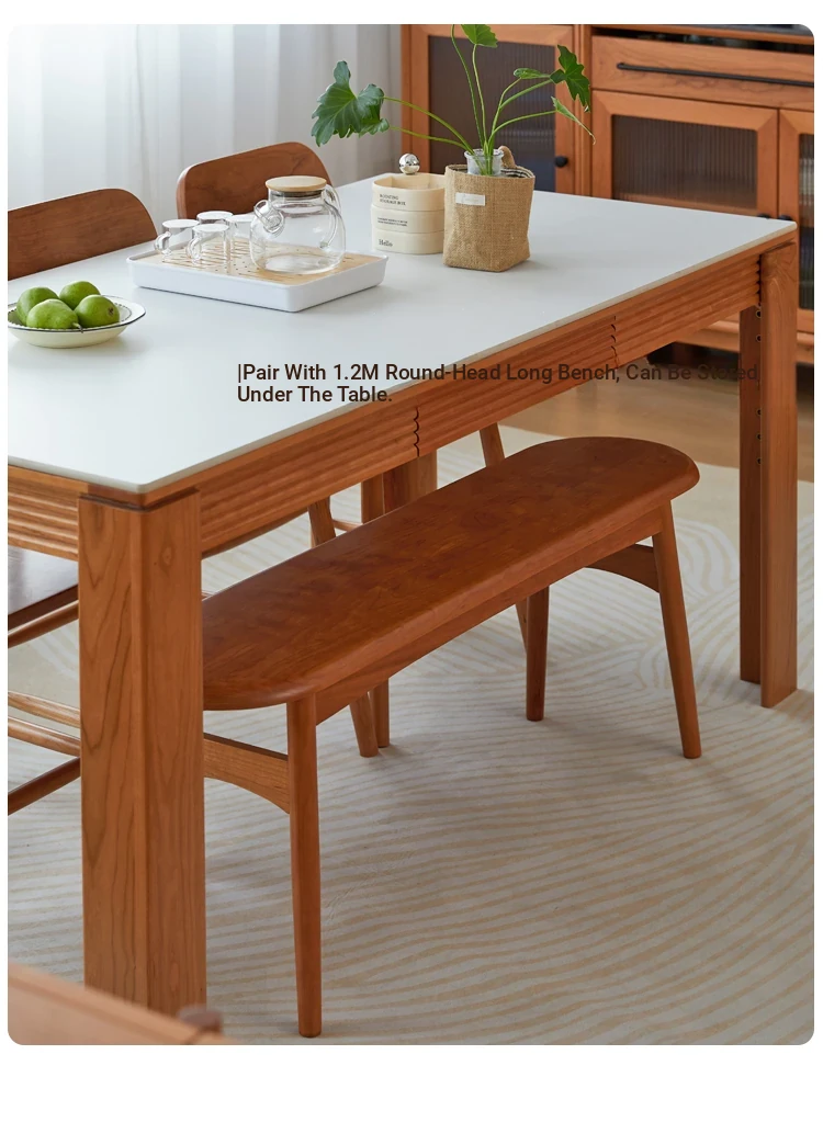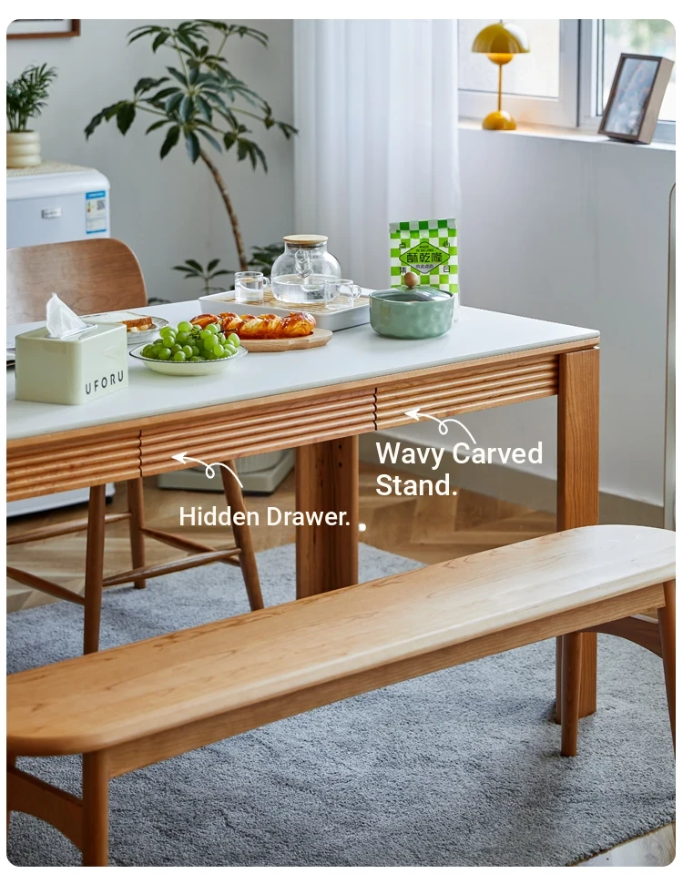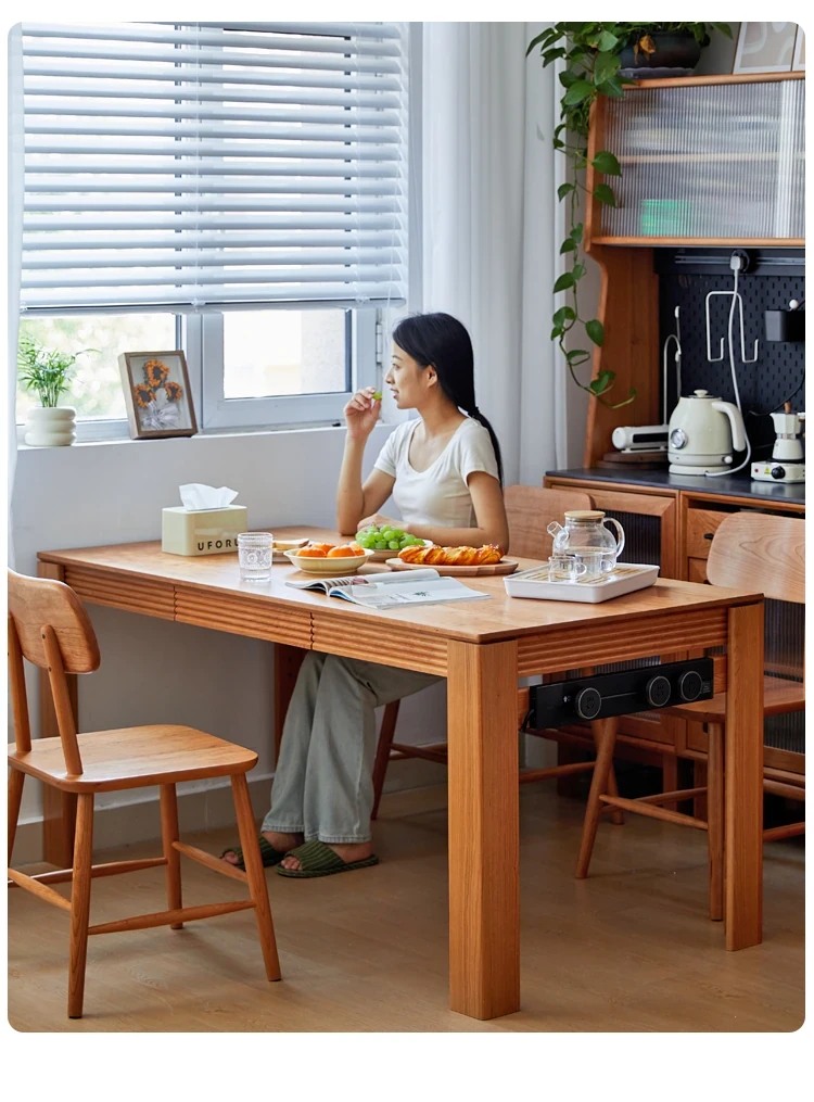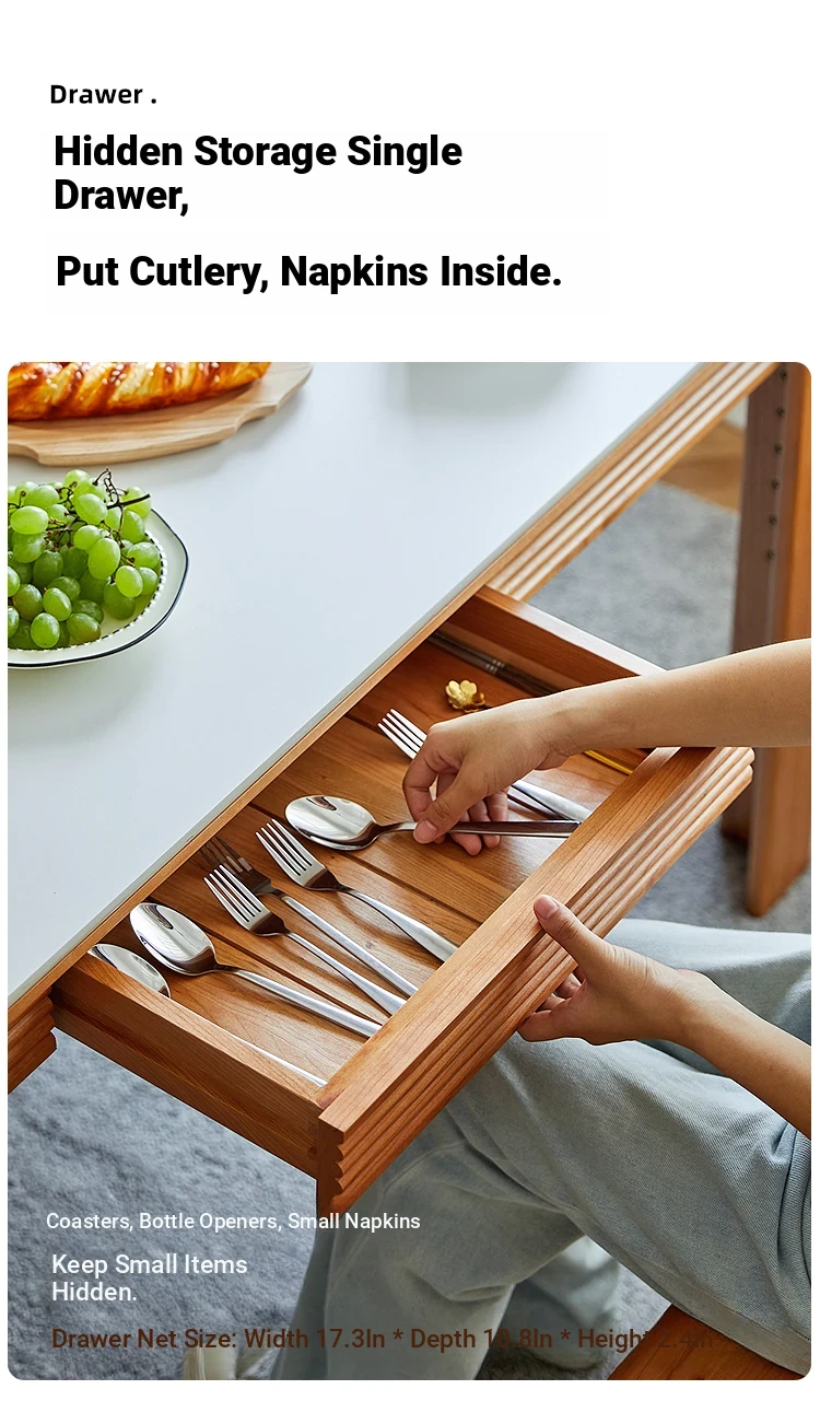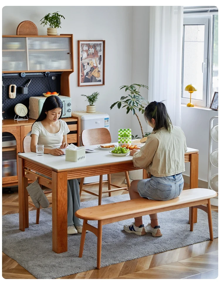 Nordic-Style Solid Wood Dining Table with Drawers - Cherry Wood Cream Finish Long Table for Small Spaces, Perfect for Your Dining Room