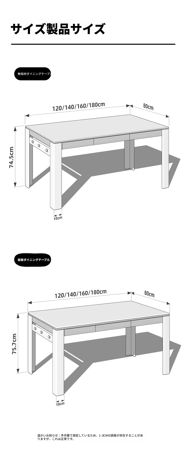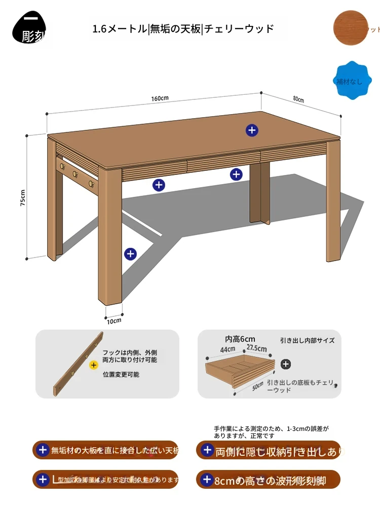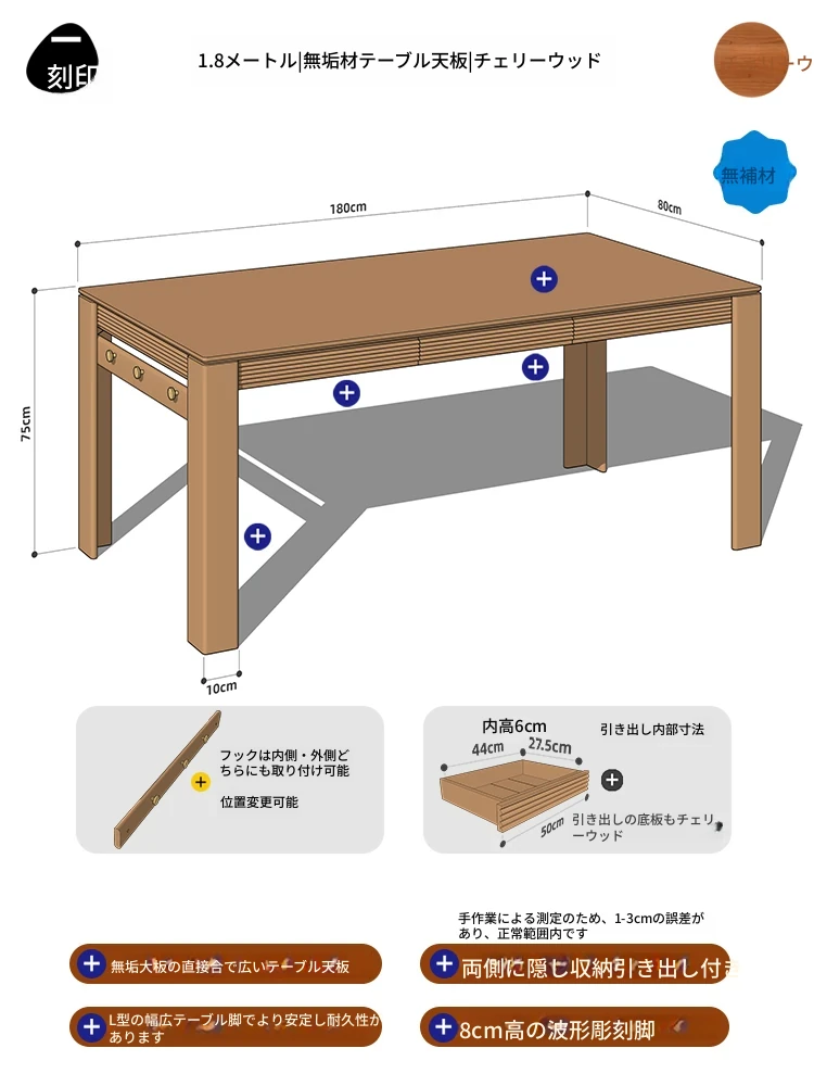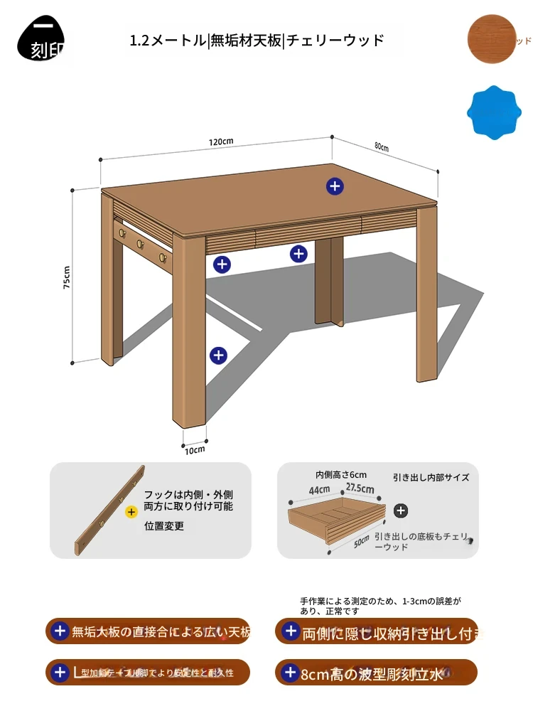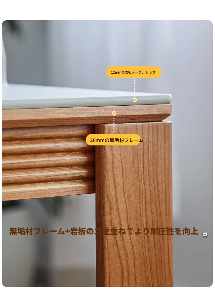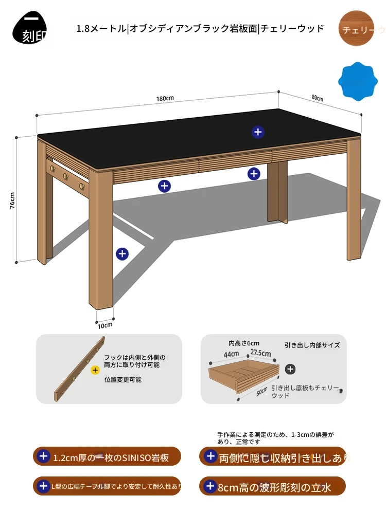 一刻木工の北欧スタイル!実木製のロックボードダイニングテーブル、コンパクトな小型住宅向け、便利な引き出し付き。チェリーウッドのクリームカラーで、食卓を華やかに演出します。おしゃれで機能的な長テーブル!