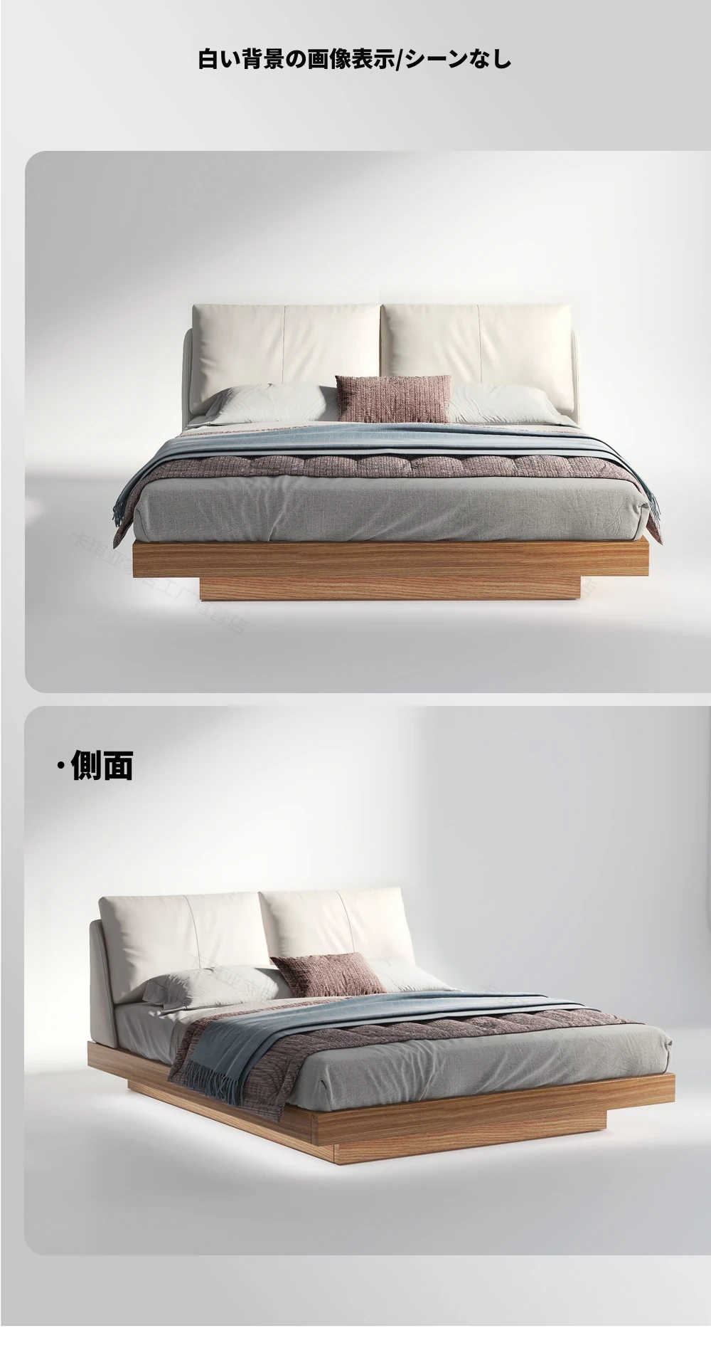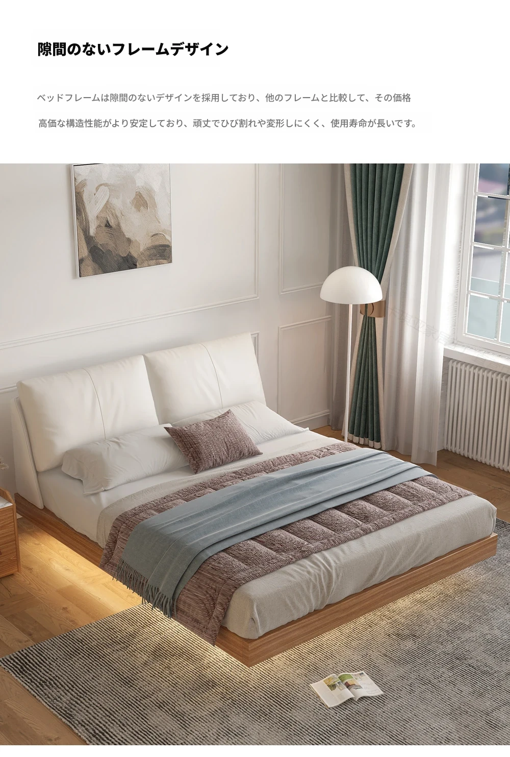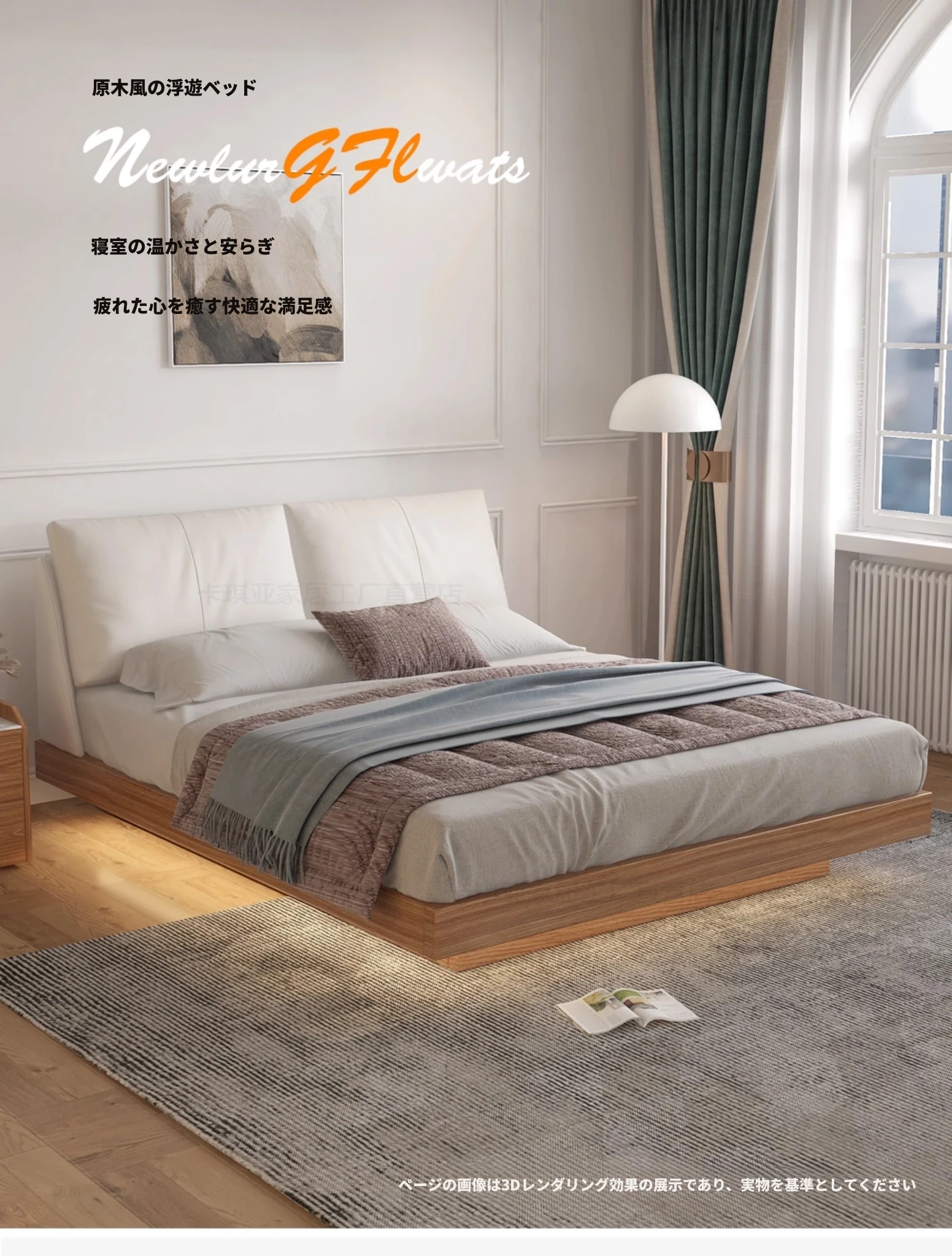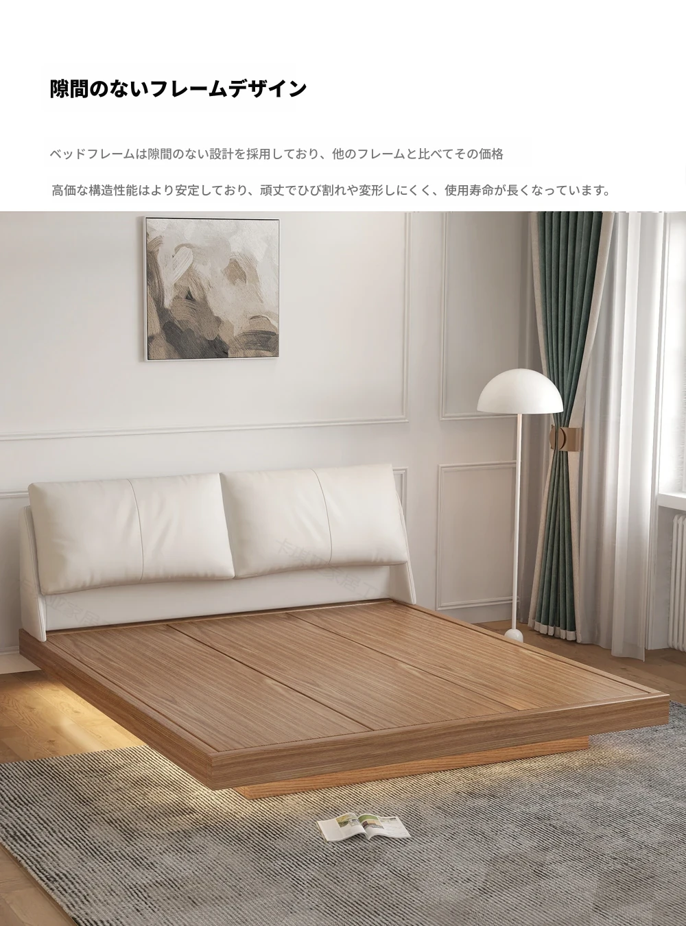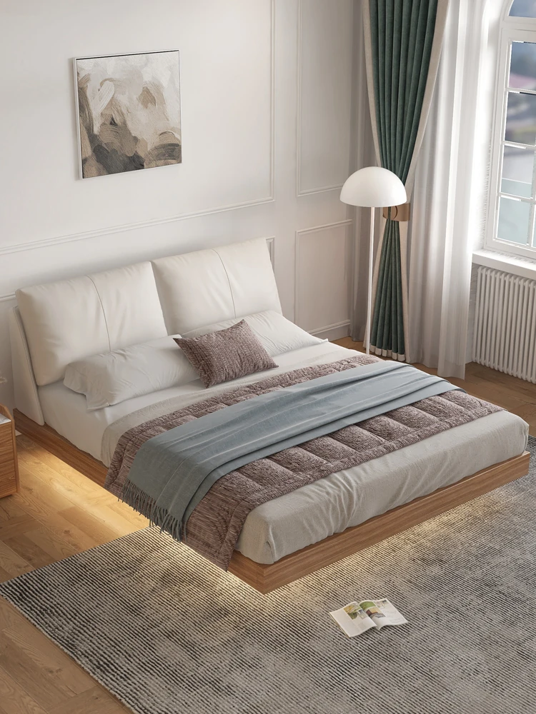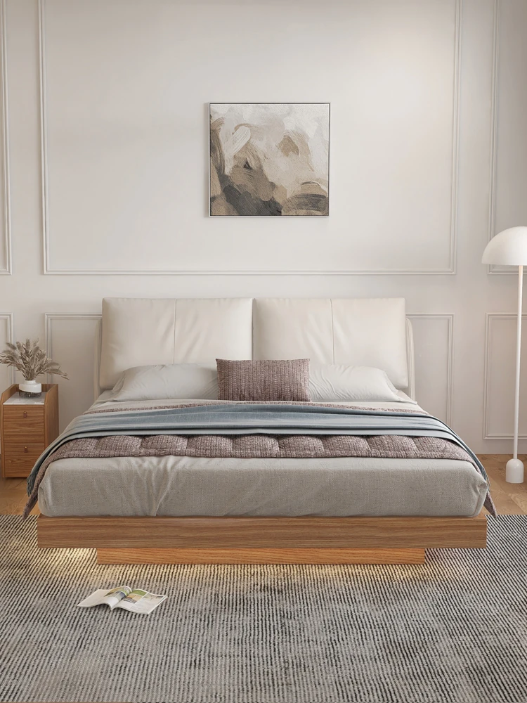 ナチュラルウッド調の実木フローティングベッド - シンプルでモダンなデザイン、真皮ダブルソファパック、北欧スタイルの羽毛仕立て、空間を演出する日本風の結婚ベッド。心地よい眠りをお届けします!