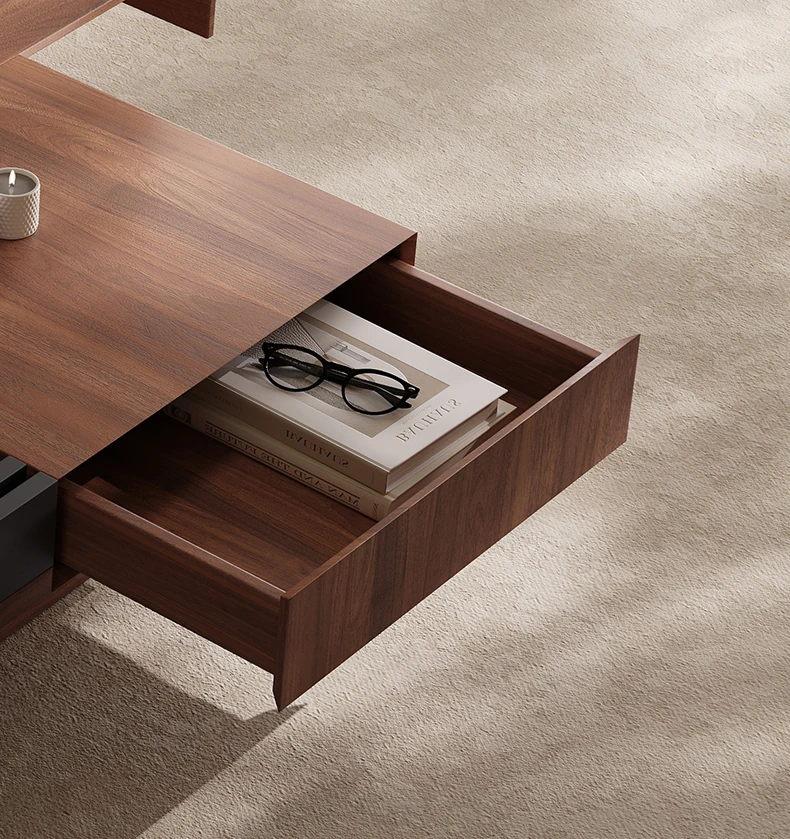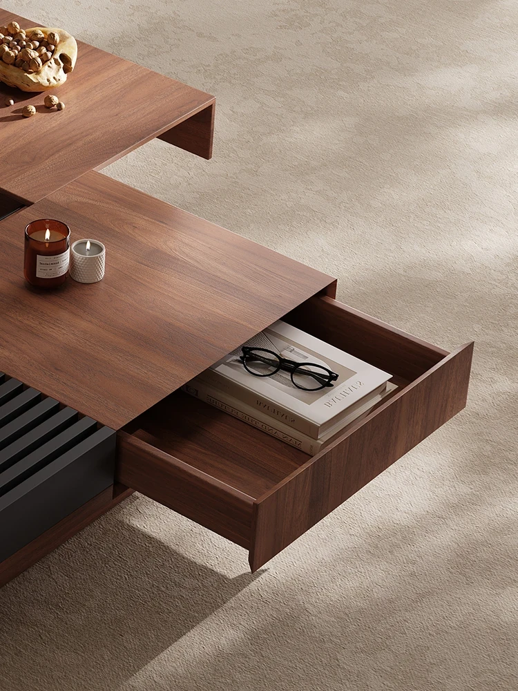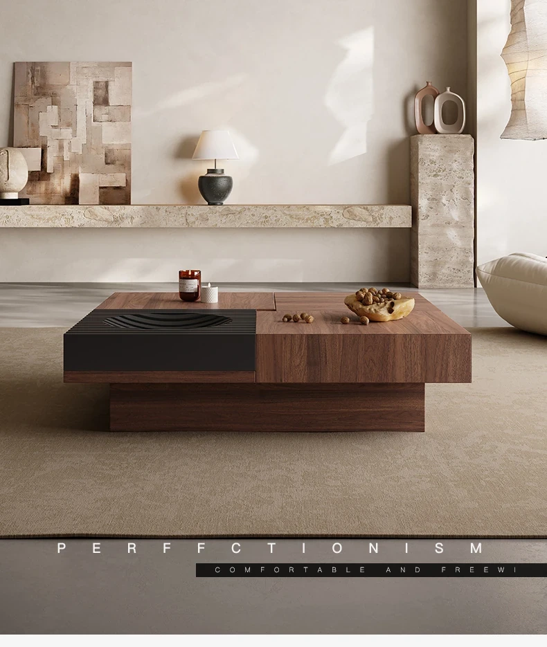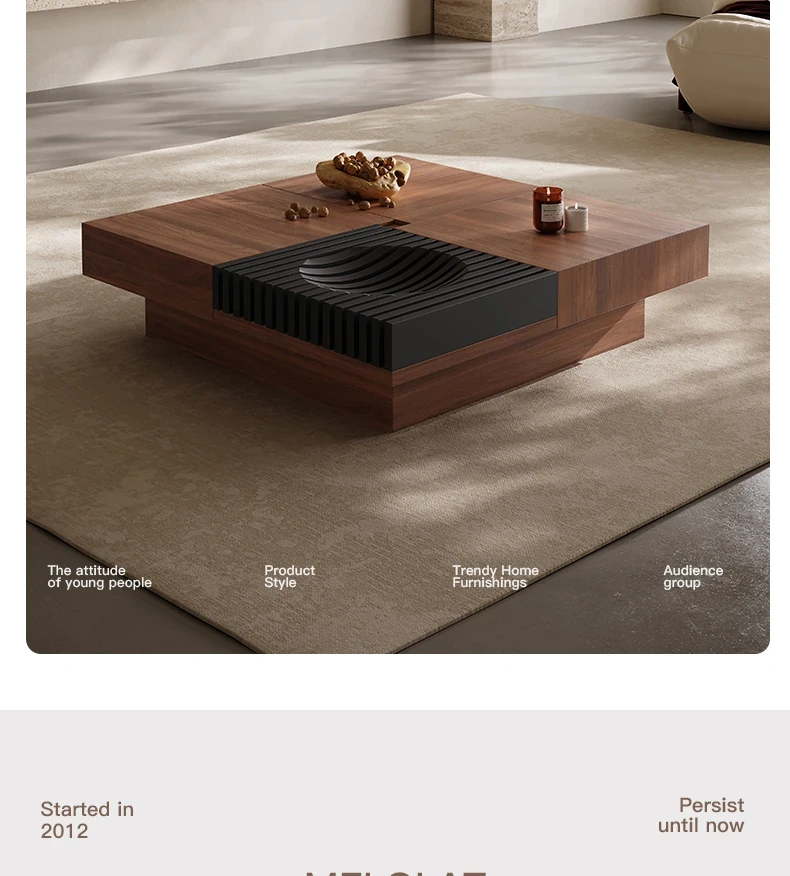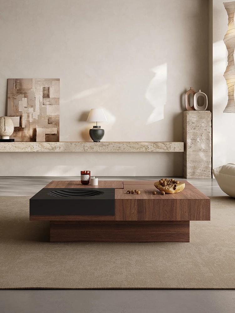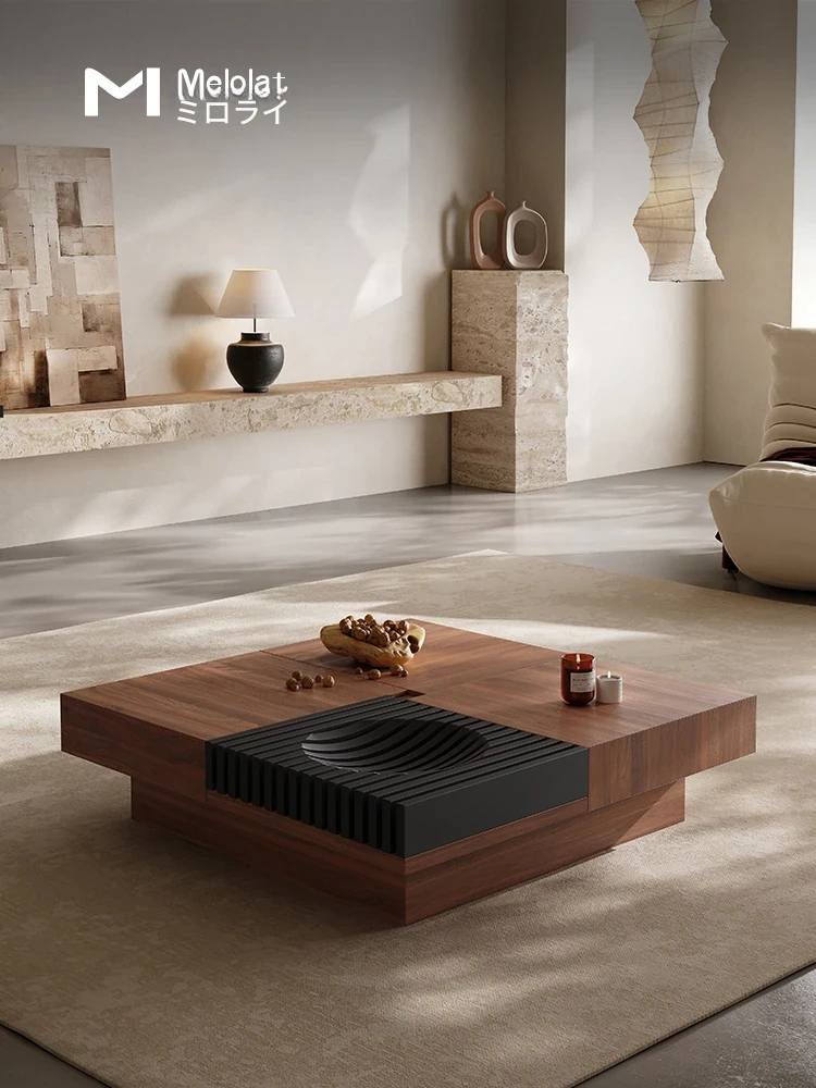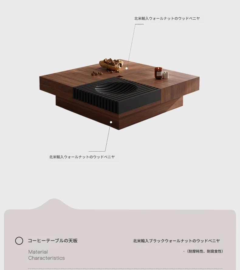 北米産ブラックウォールナットのモダンデザインスクエアコーヒーテーブル - 北欧スタイルのシンプルでスタイリッシュなリビング収納家具、クリエイティブな無垢材使用で、洗練された空間を演出!
