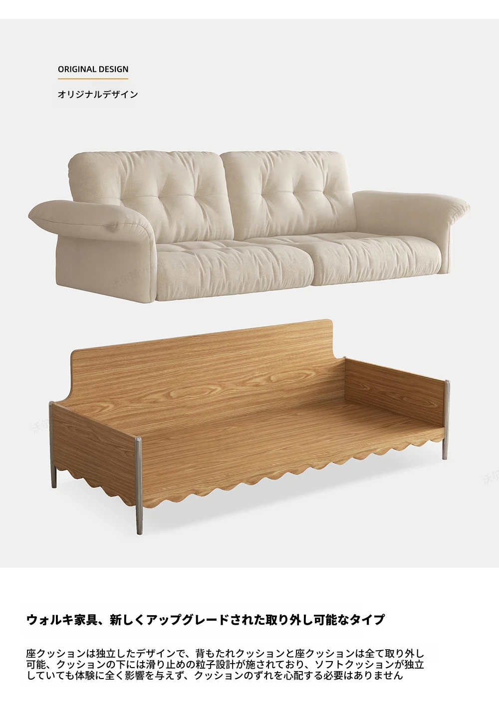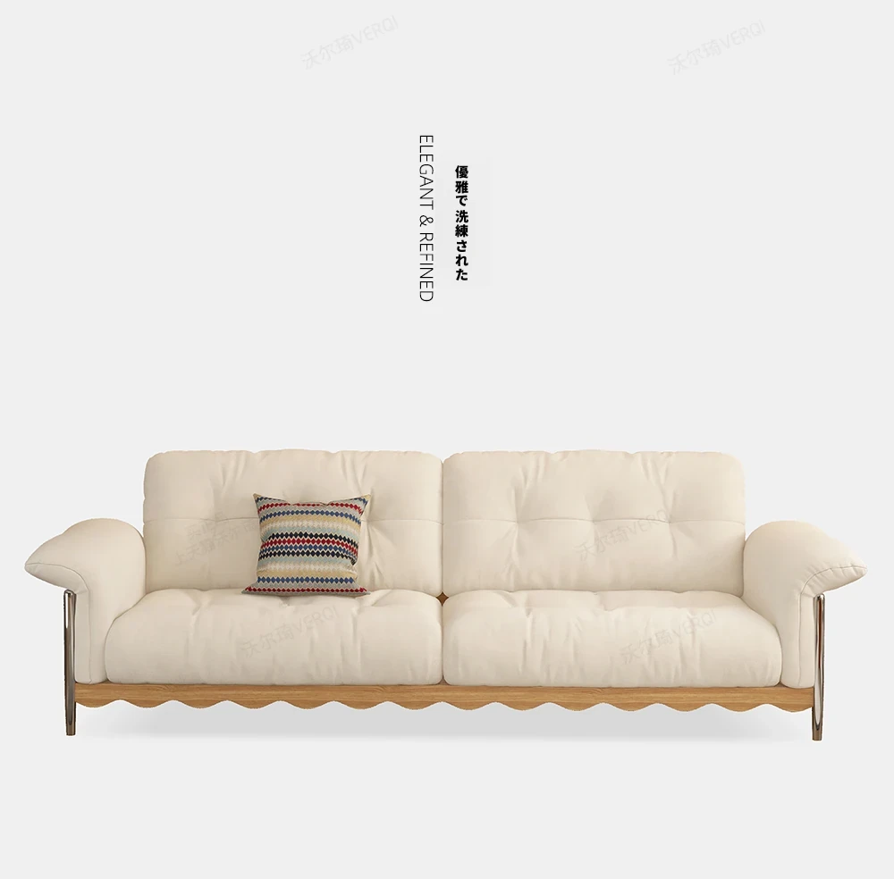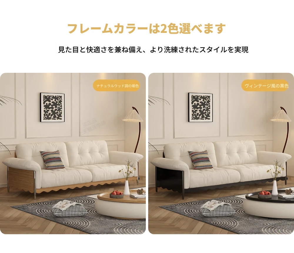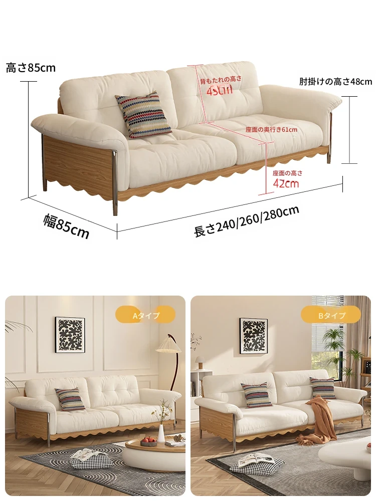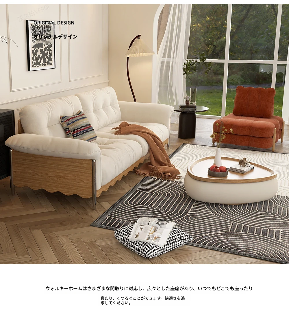ナチュラルウッド調の日本式無垢材ソファ、小スペースに最適!レトロな雲のようなデザイン、クリーミーな布地で猫の爪も安心!お手入れも簡単な洗濯可能なカバー付き。おしゃれで快適なリビングの必需品!