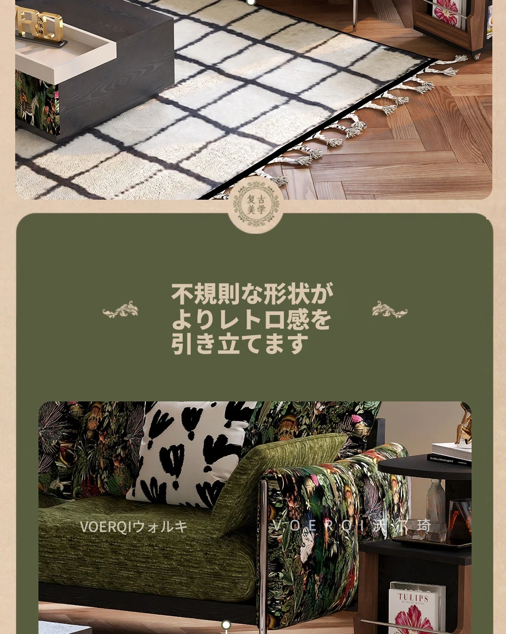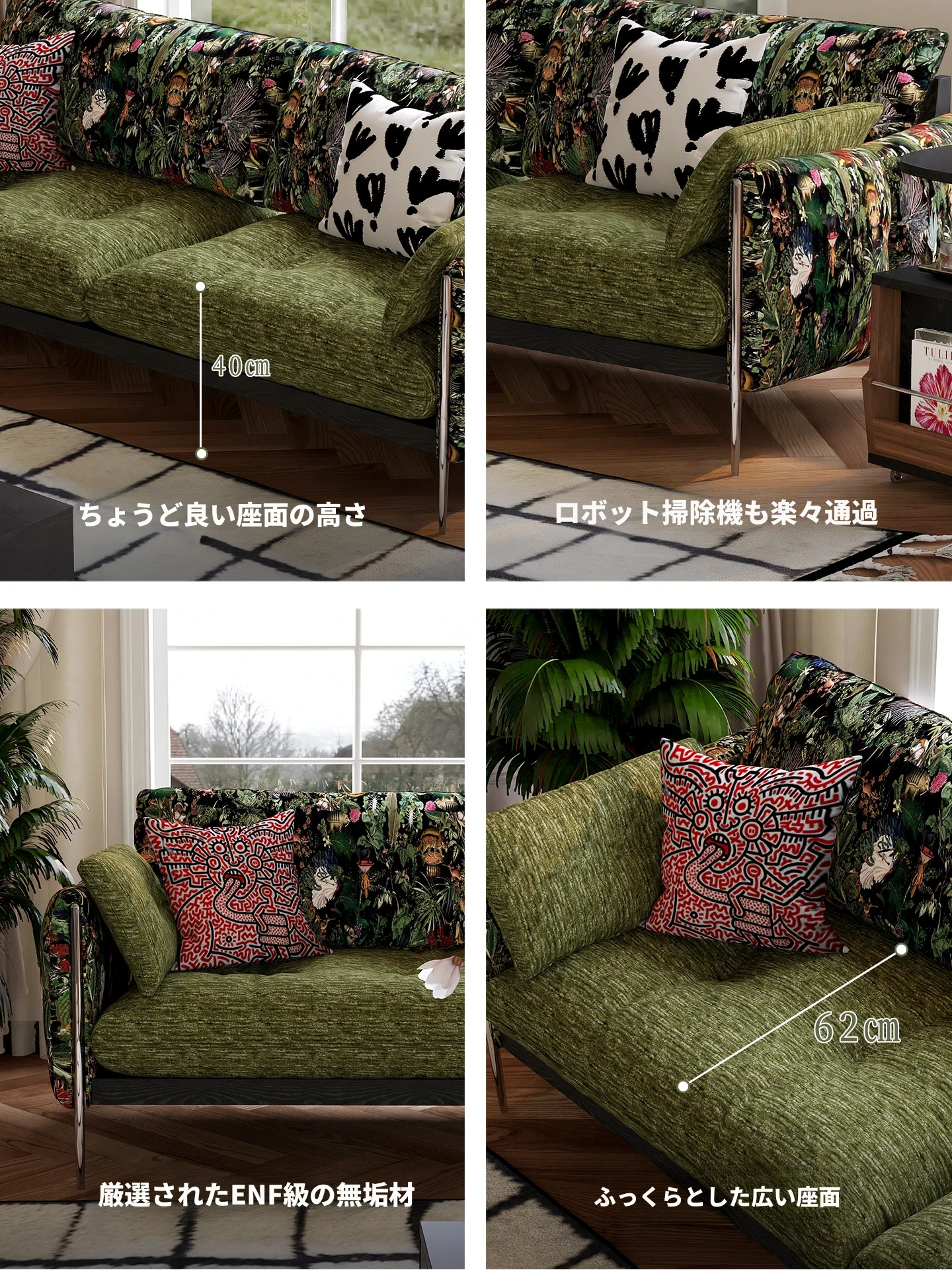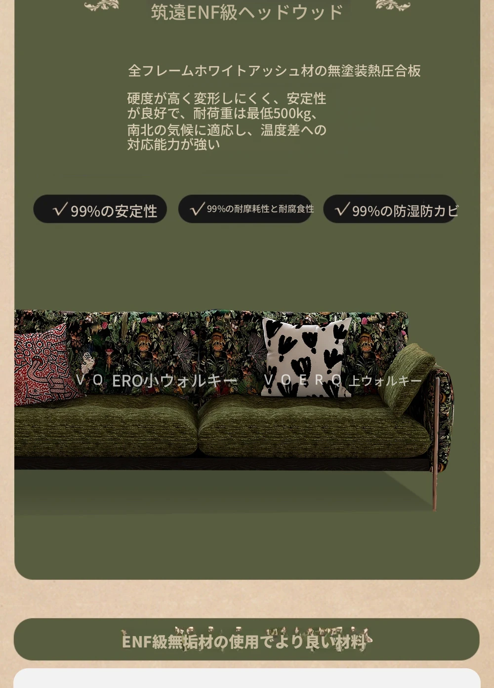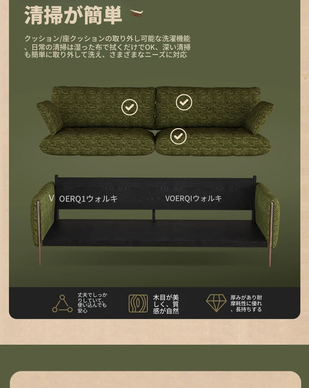 ウォルキ フレンチビンテージ生地ソファ 小型リビングに最適な直列型 中古 森の雰囲気漂う雲のようなデザイン 天然木製 洗えるソファでお手入れ簡単!
