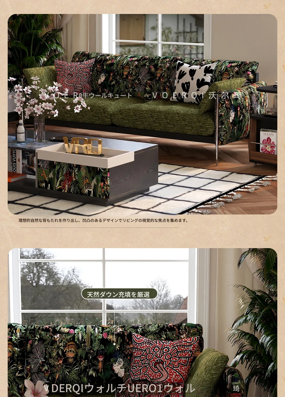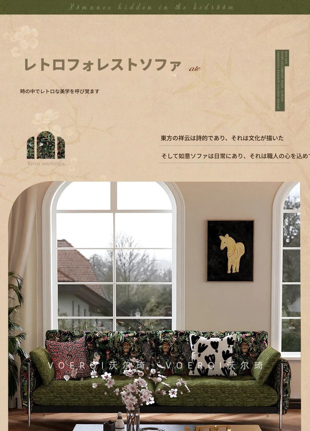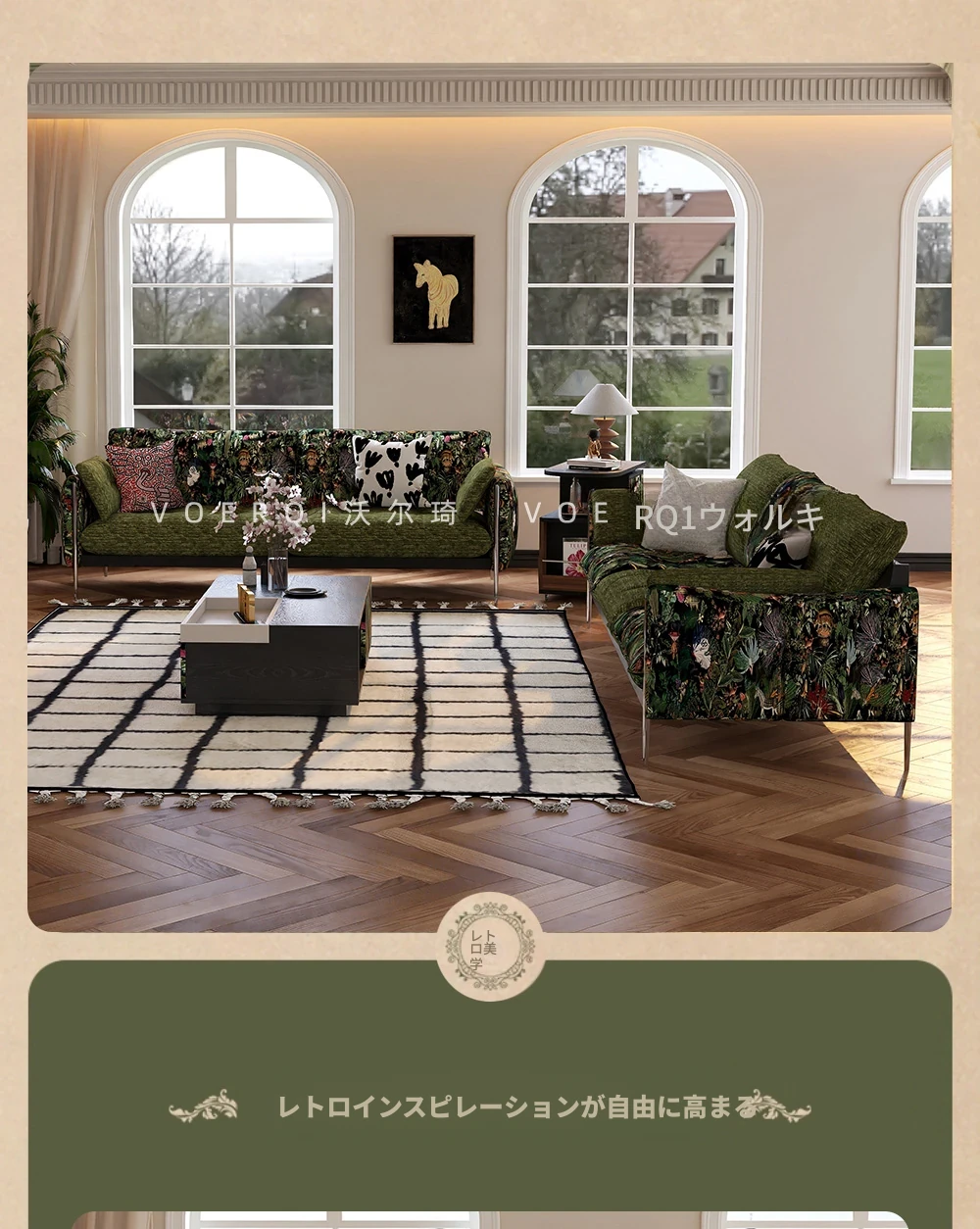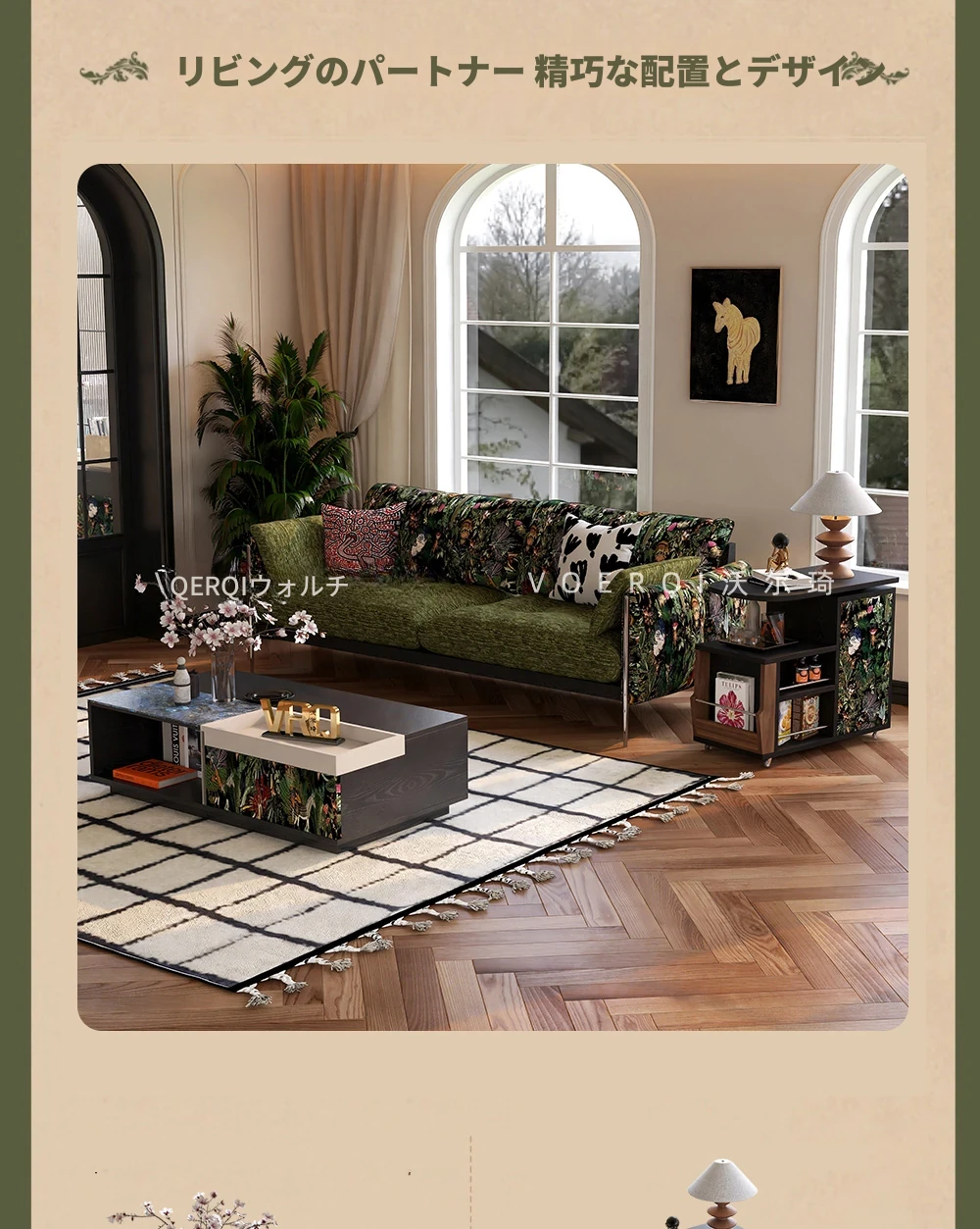 ウォルキ フレンチビンテージ生地ソファ 小型リビングに最適な直列型 中古 森の雰囲気漂う雲のようなデザイン 天然木製 洗えるソファでお手入れ簡単!
